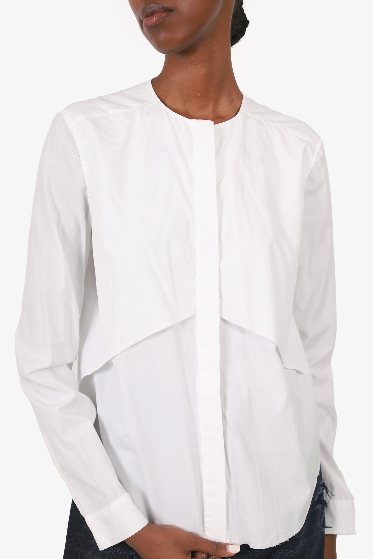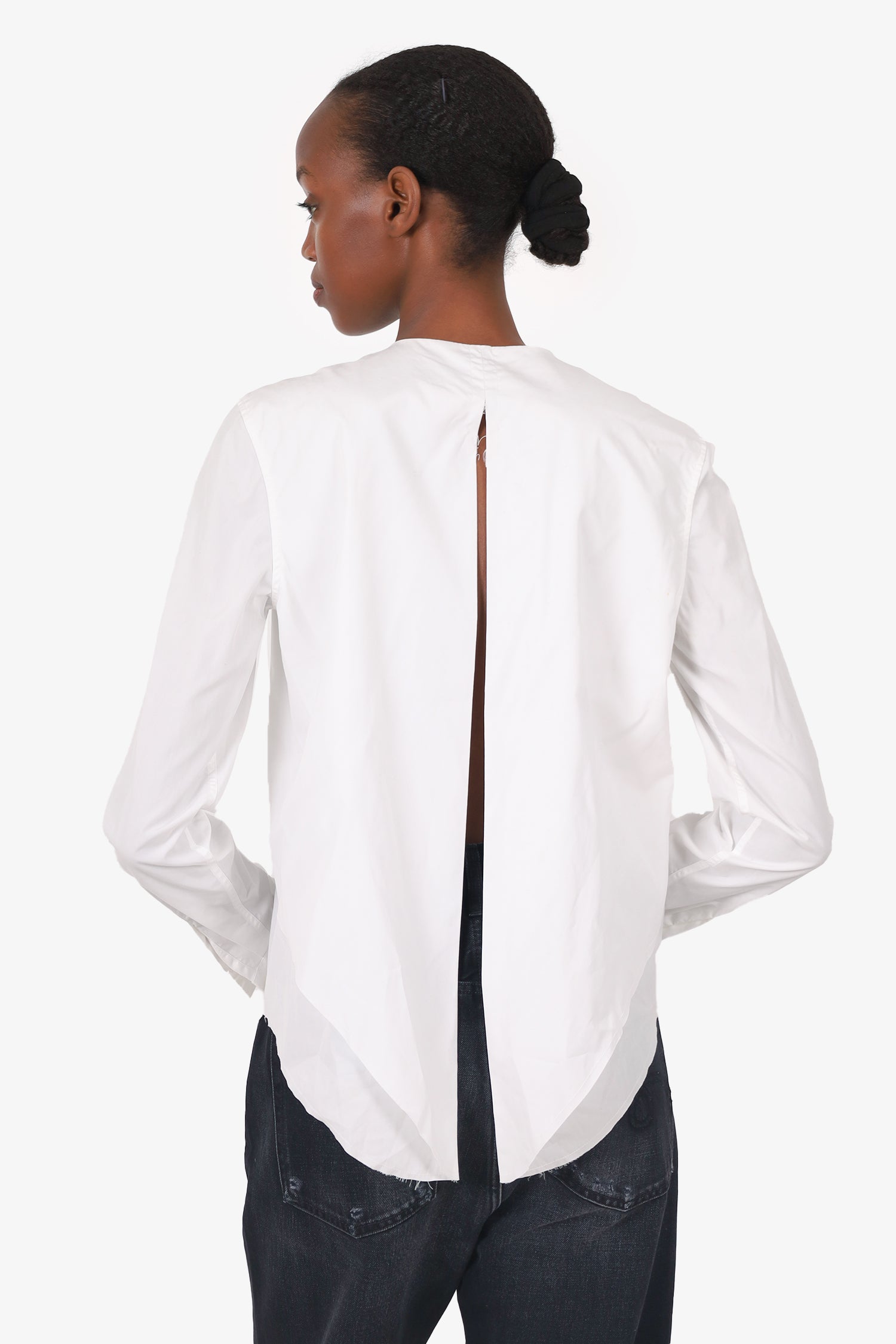 Refresh availabilityDion Lee White Open Back Blouse. Pull on. Round-neckline. Front button-up closure. Button-up closure to sleeve cuffs. Open back rear slit. Tonal stitching.