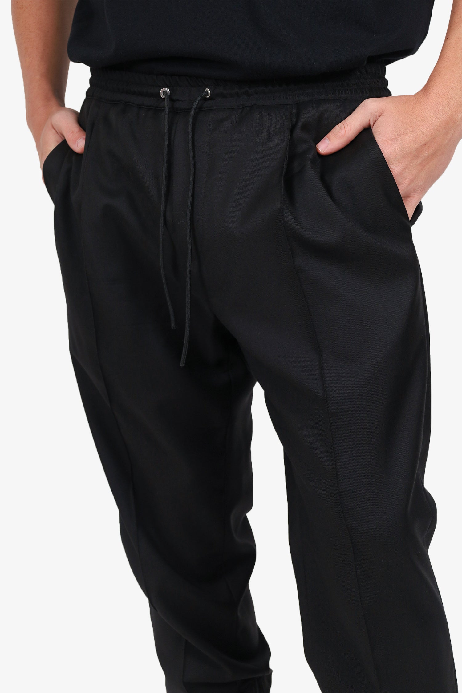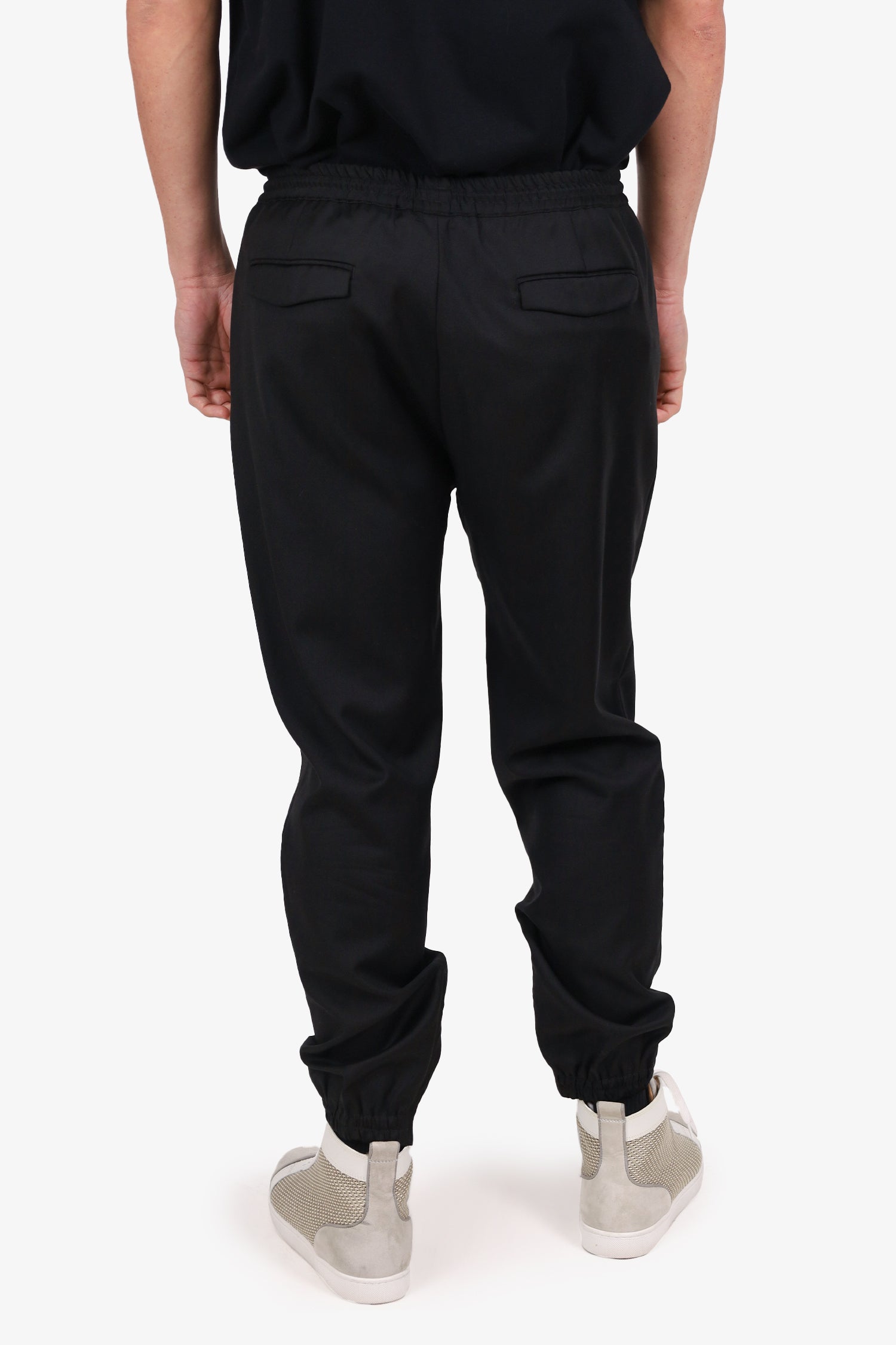 Refresh availabilityDior Black Striped Drawstring Zip Hem Pants. Slip-on. Adjustable cinching waistband with tie-up closure. 4 exterior pockets; 2 side sip and 2 rear flap with button-up closure. Zip closure at ankle cuff. Silver-tone hardware. Tonal stitching.