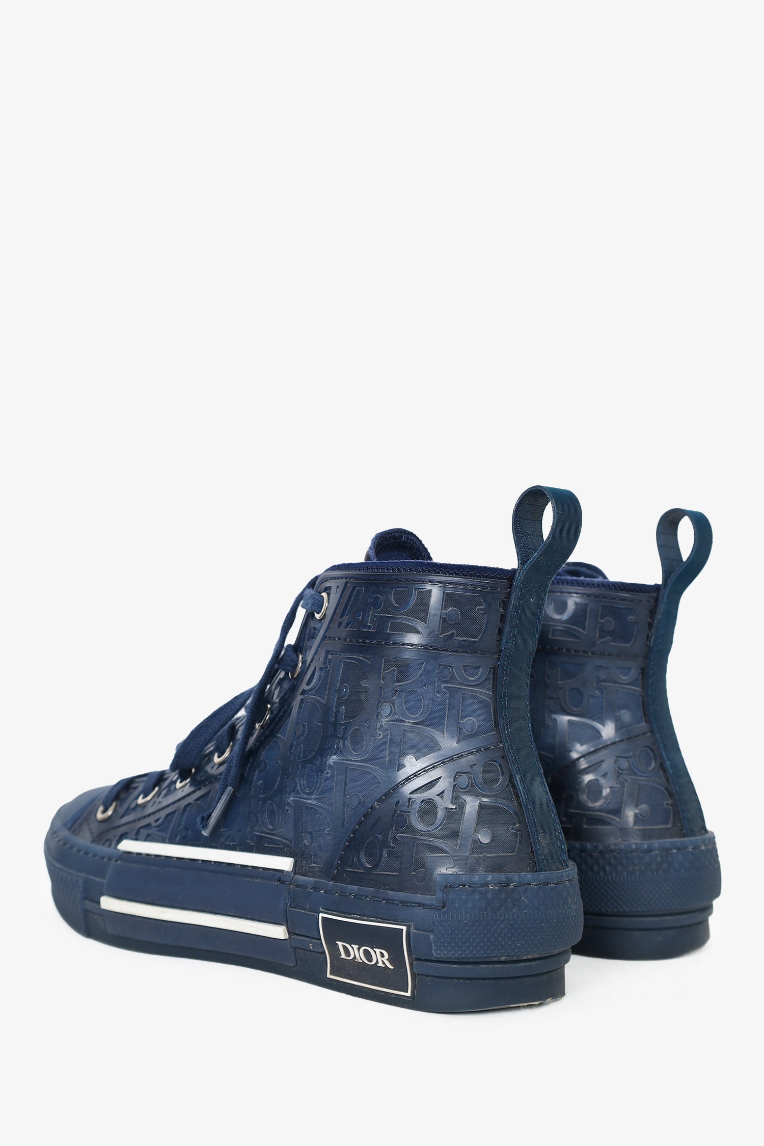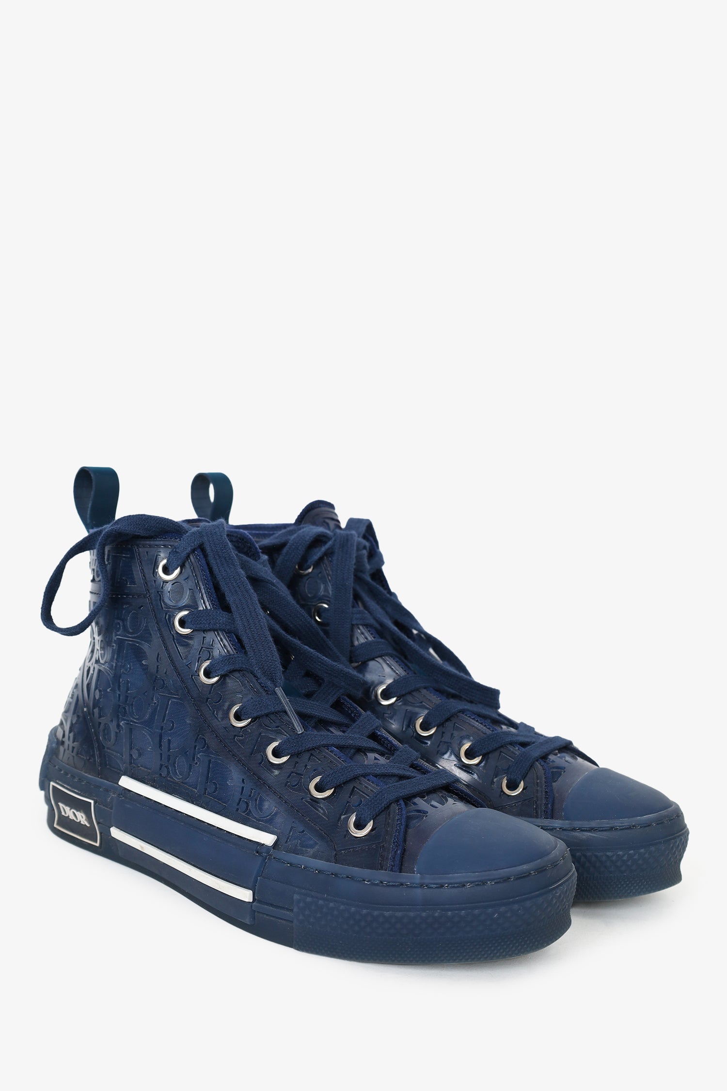 Dior Homme Navy Oblique B23 High Top Sneaker. Round toe. Lace-up closure. Silver-tone hardware. Tonal Stitching.