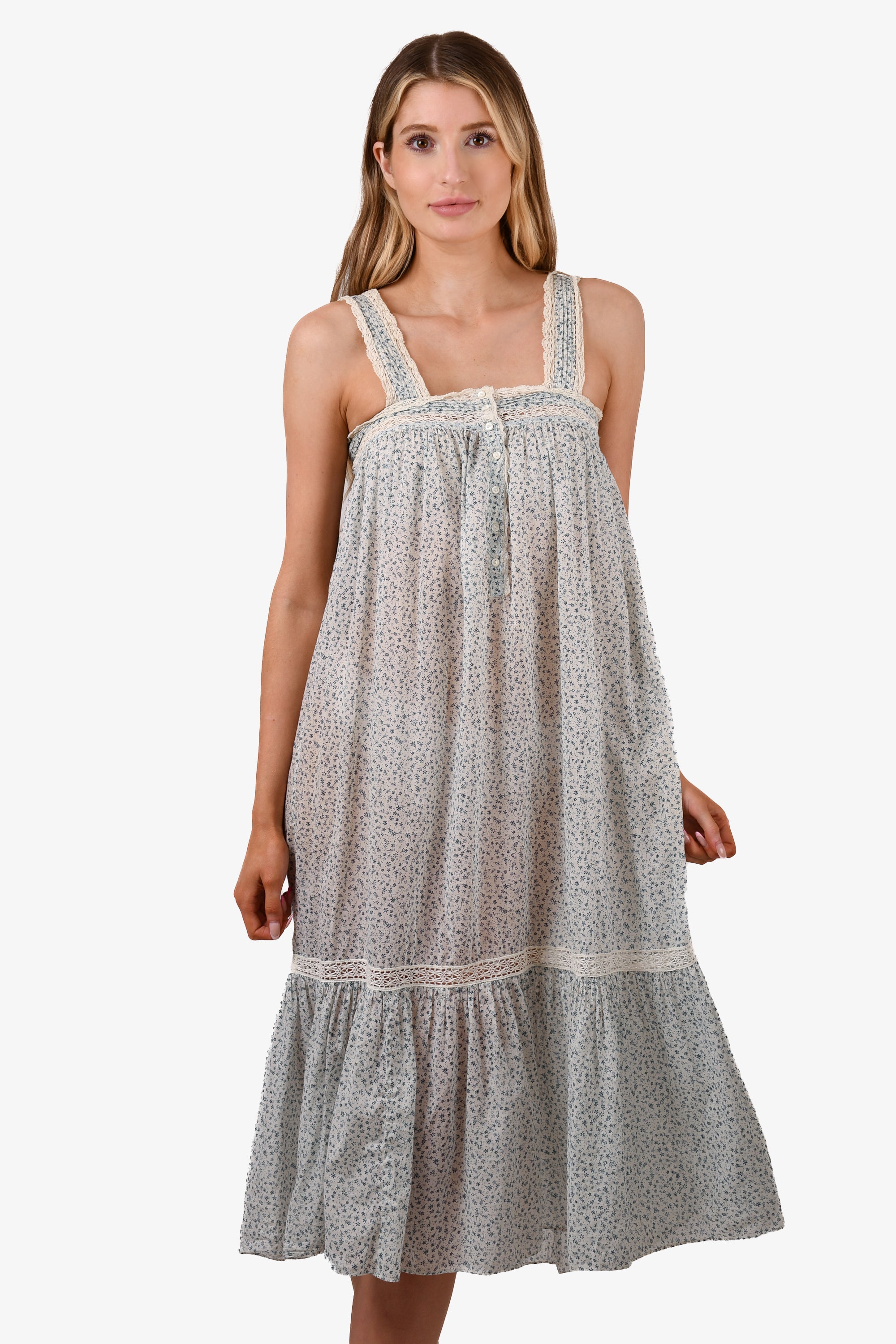 Refresh availabilityDoen Blue Paisley Print Sheer Sleeveless Maxi Dress. Front button-up closure. Tonal stitching.