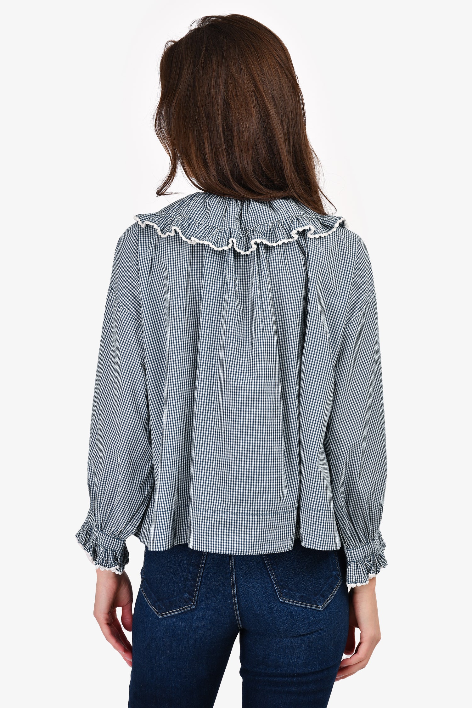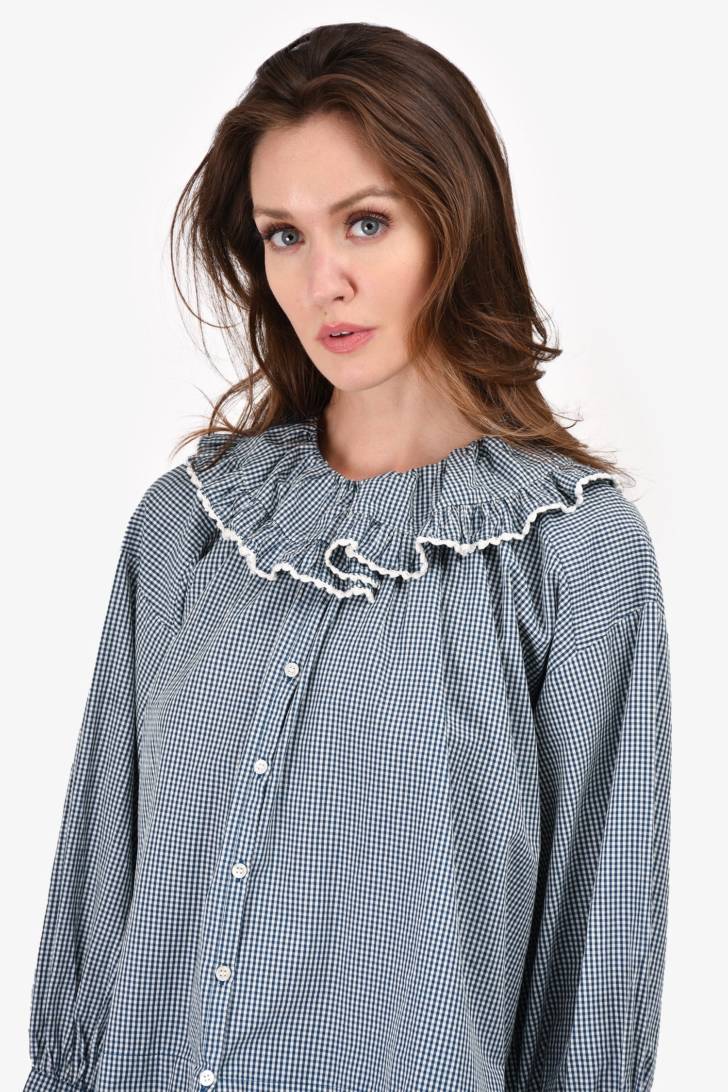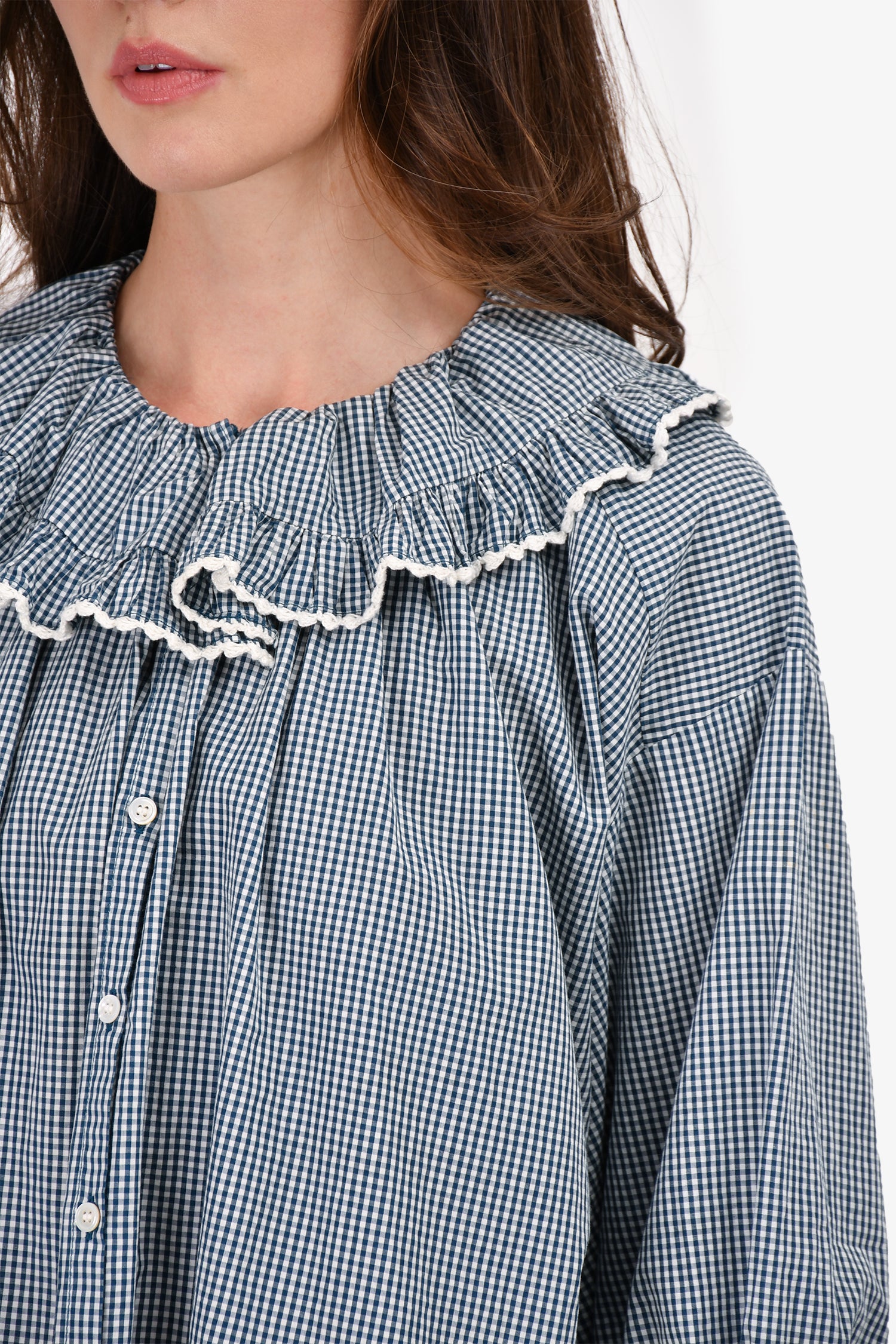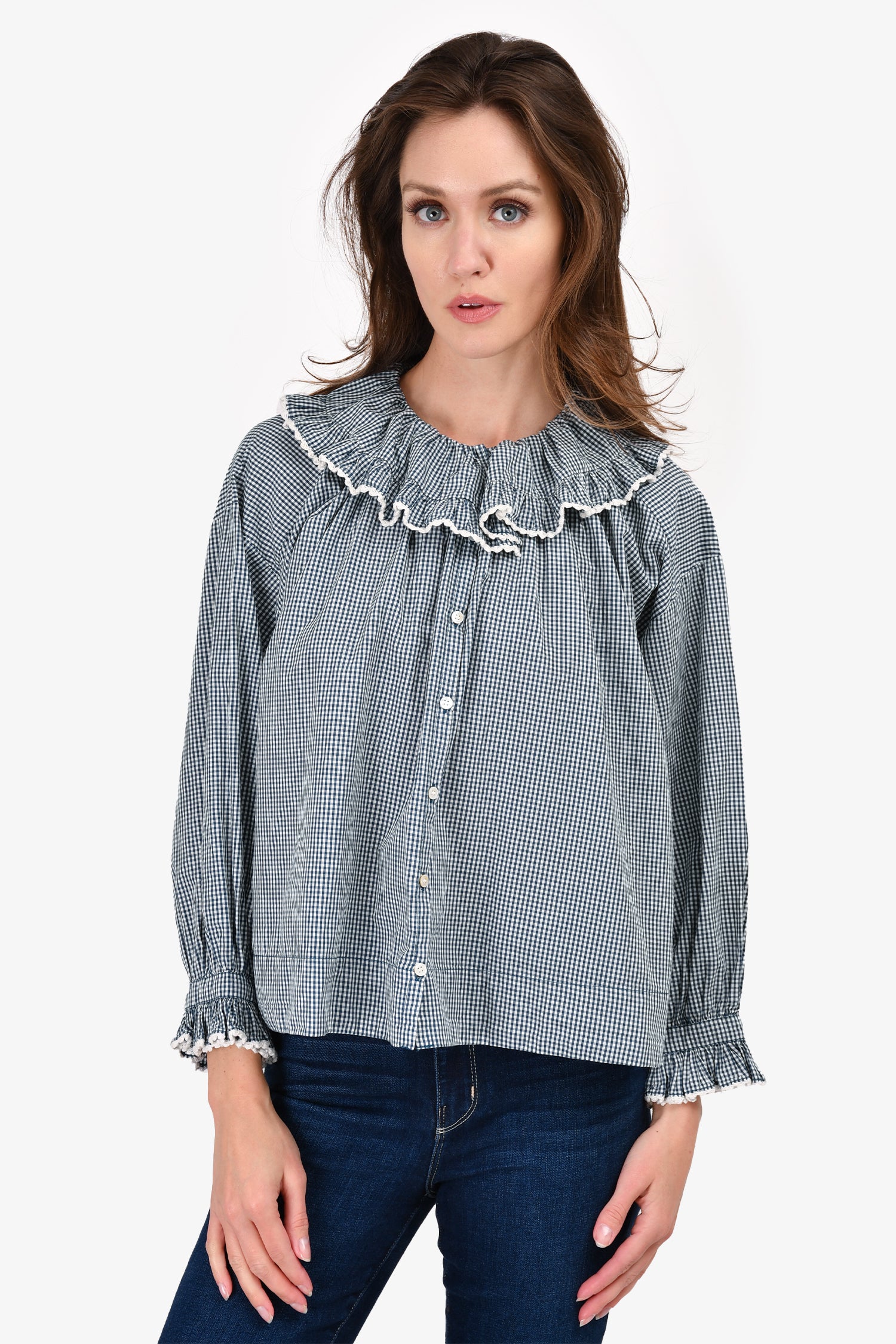 Refresh availabilityDoen Blue/White Cotton Check Ruched Top. Front button-up closure. Elasticized cuffs.