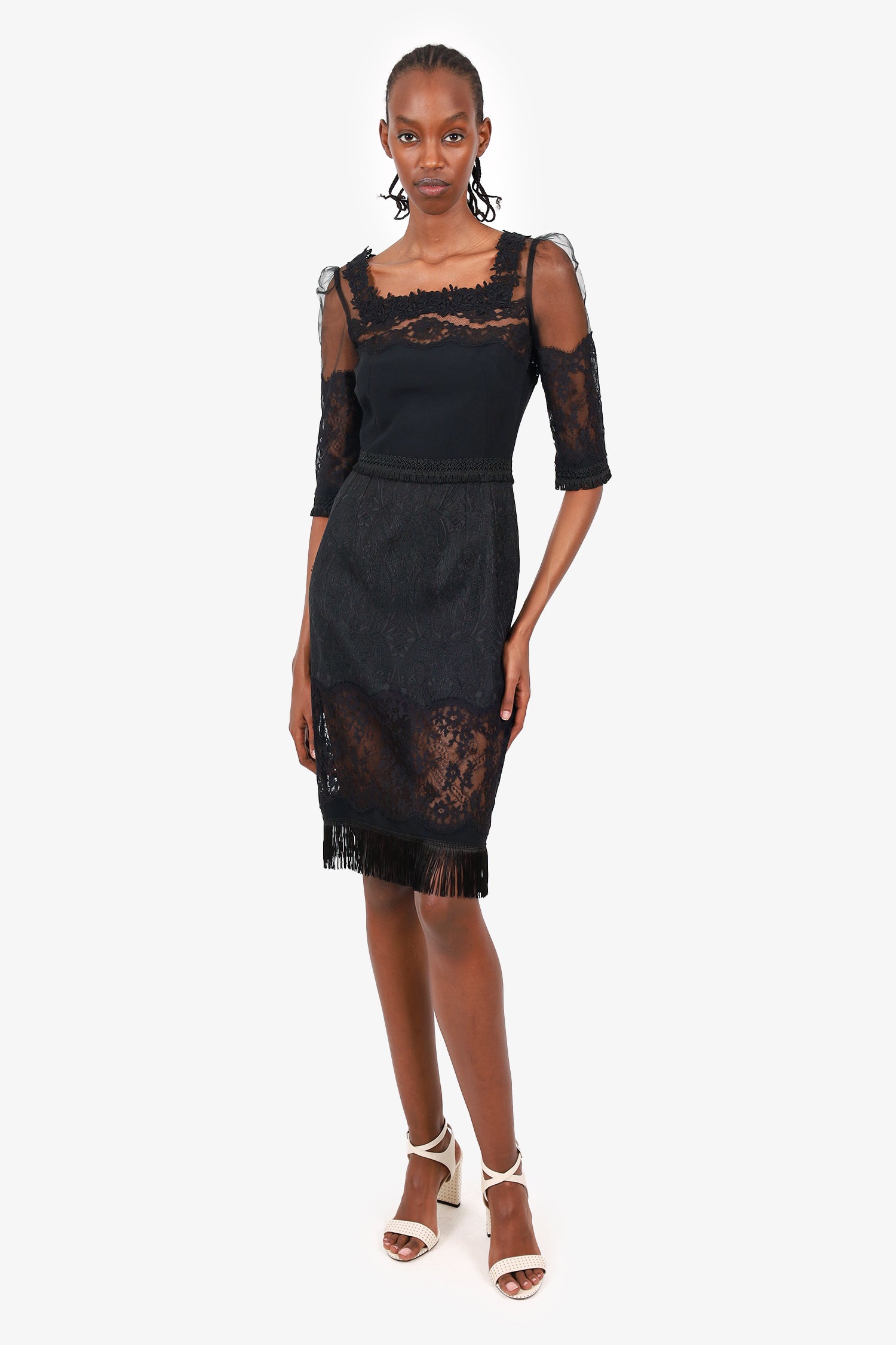 Refresh availabilityDolce and Gabbana Black Lace Fringe Hem Detail 'Sartoria Italiana' Dress. Slip-on. Round-neckline. Rear zip with hook closure. Sheer sleeves. Tonal stitching.
