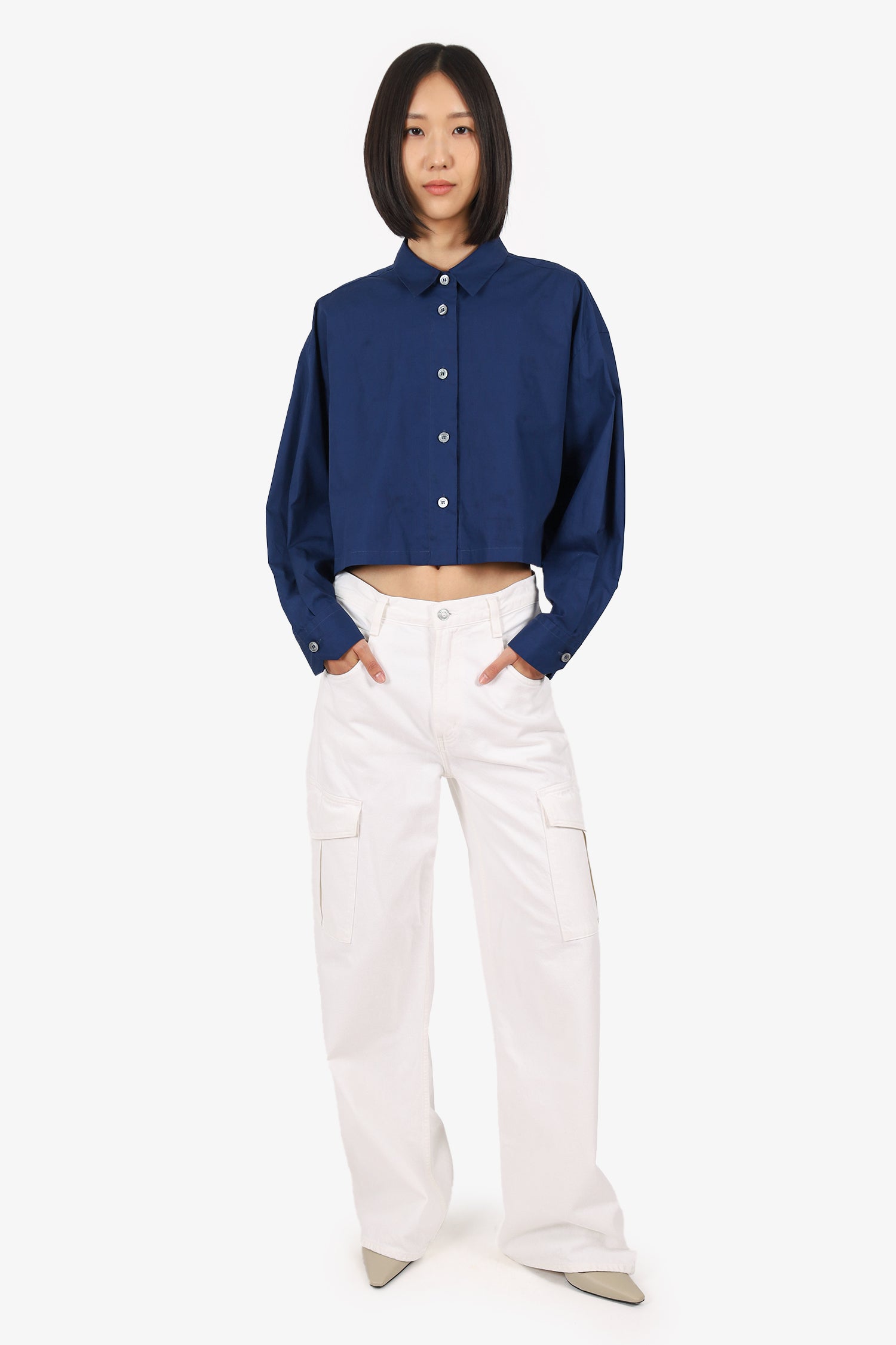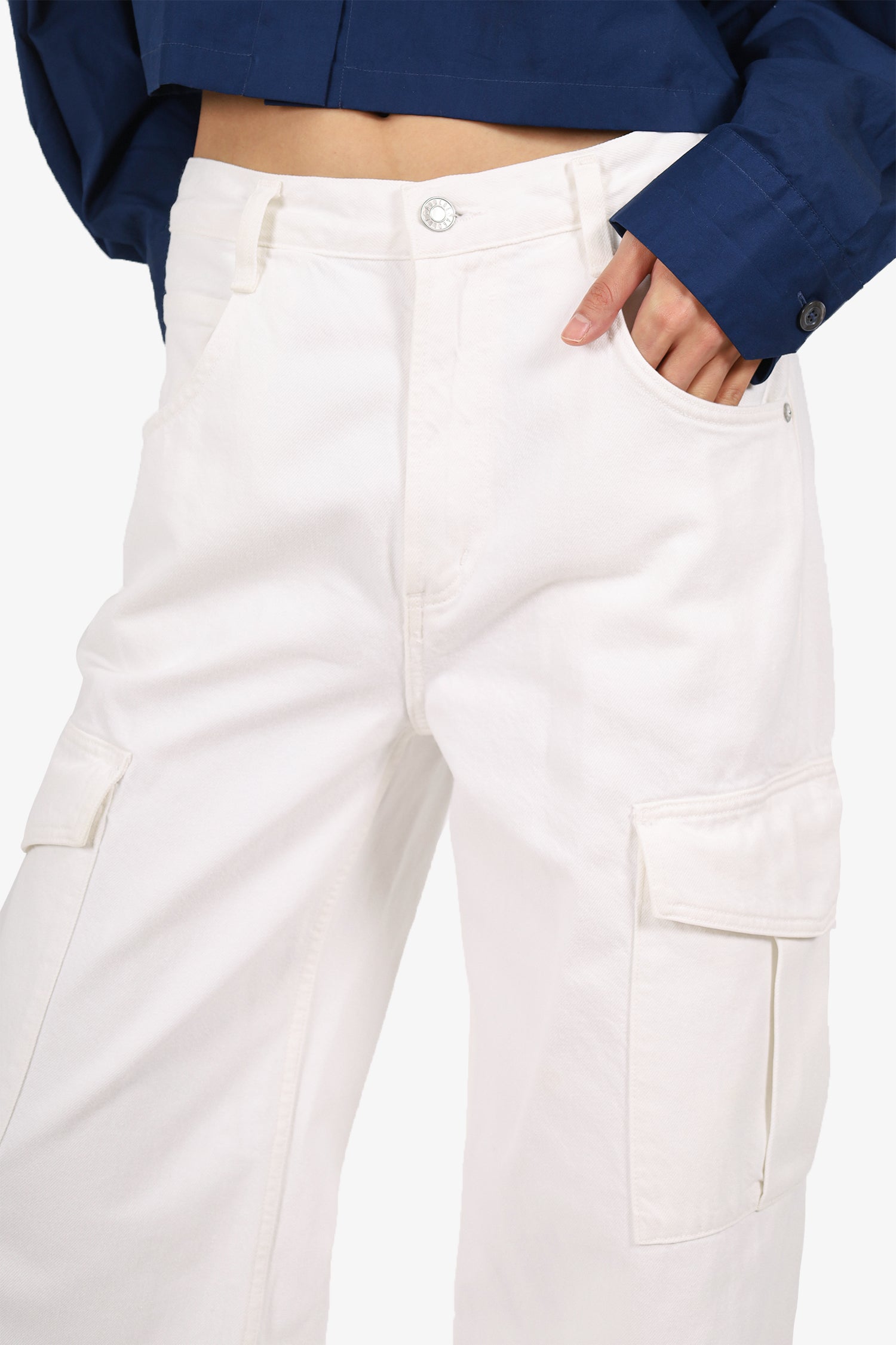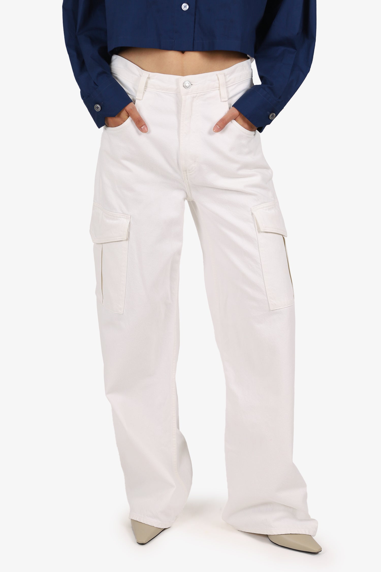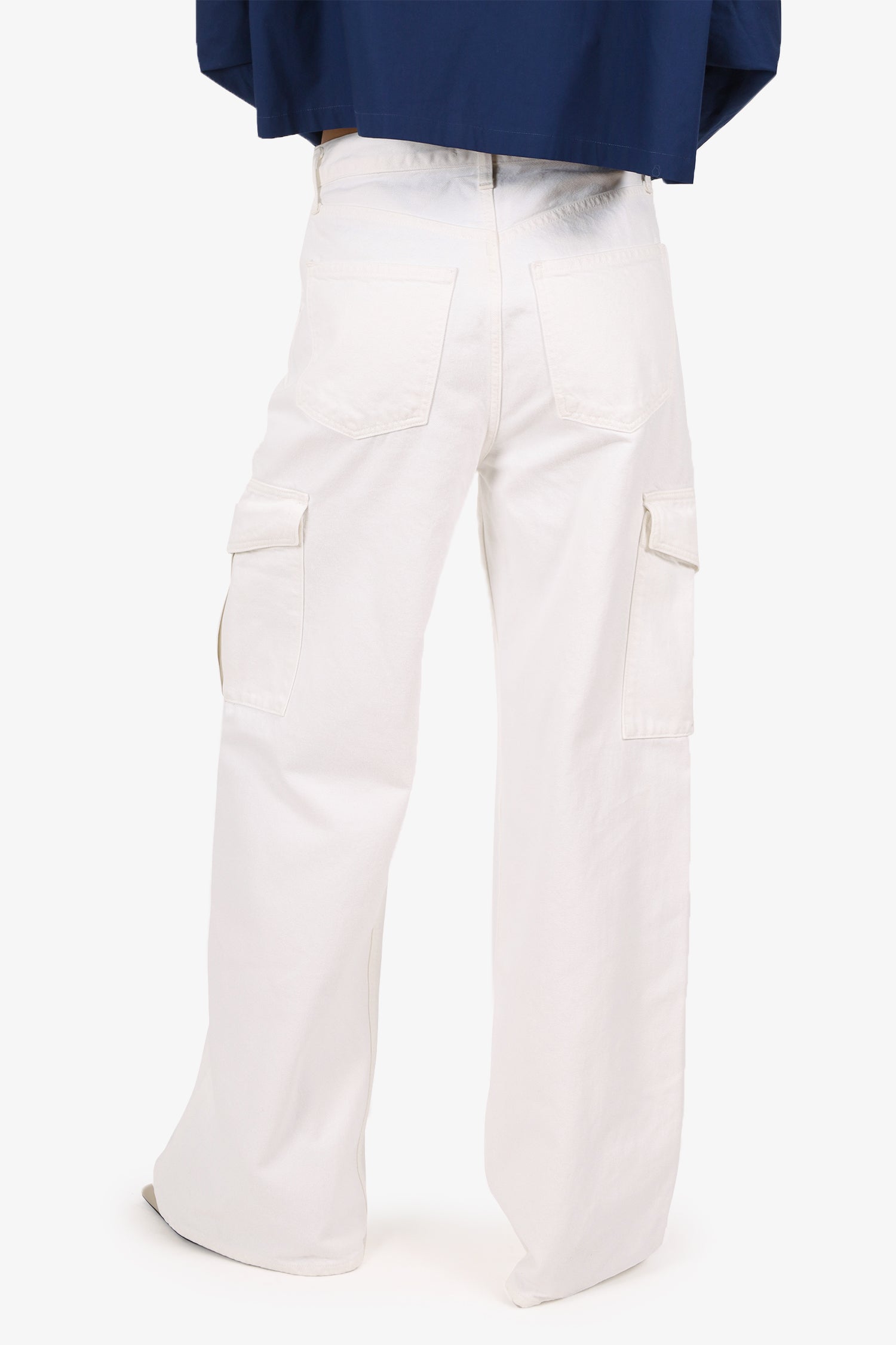 Refresh availabilityAgolde White Denim Cargo White Leg Jeans. Slip-on. Front zip with button closure. Waistband belt loops. 7 exterior pockets; 2 front side slip and 1 mini compartment, 2 rear slip and 2 knee flap with snap-button closure. Silver-tone hardware. Tonal stitching.
