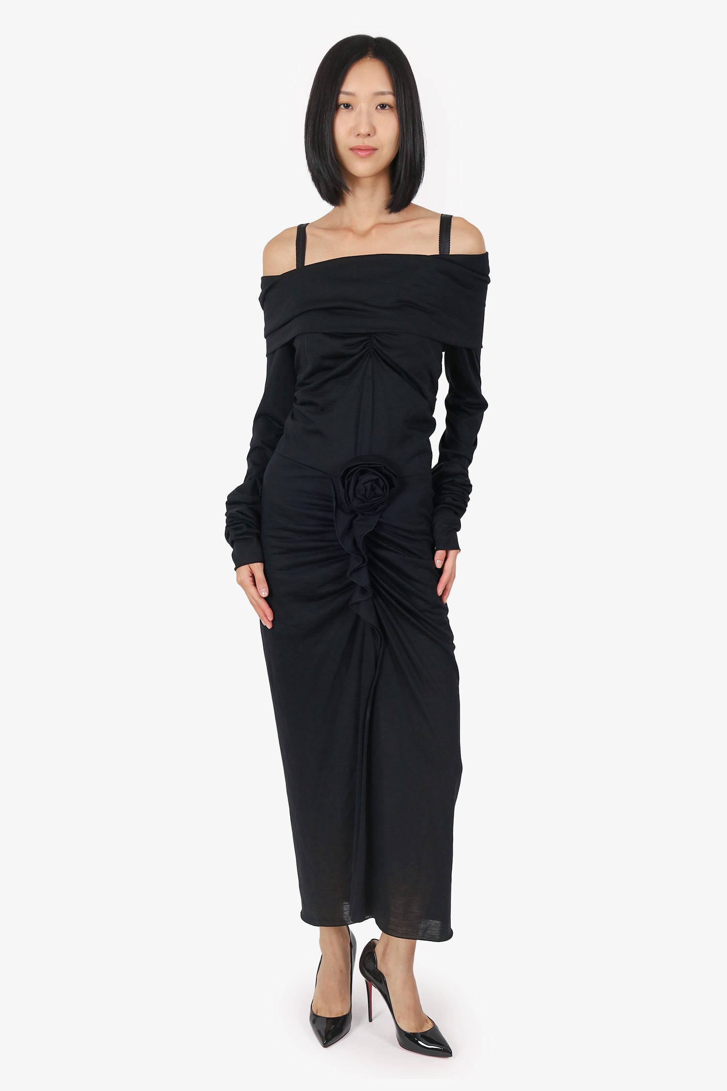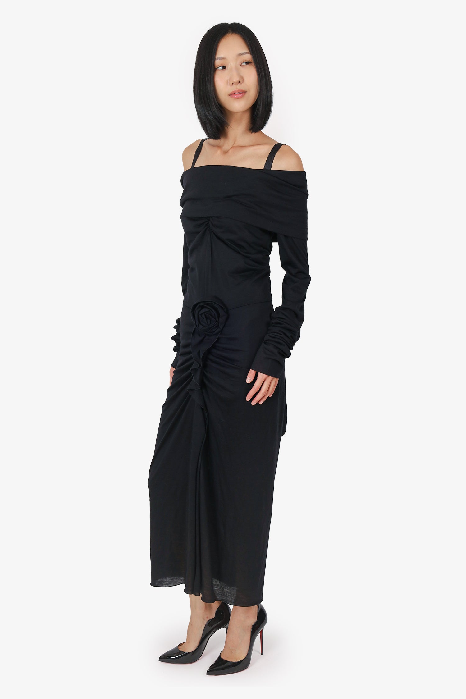 Refresh availabilityDolce & Gabbana Black LS Drape Dress Size 44. Pull-on. Straight-neckline. Rear zip closure. Off-the-shoulder sleeves with adjustable straps. Flower embellishment to front. Lined interior. Tonal stitching.