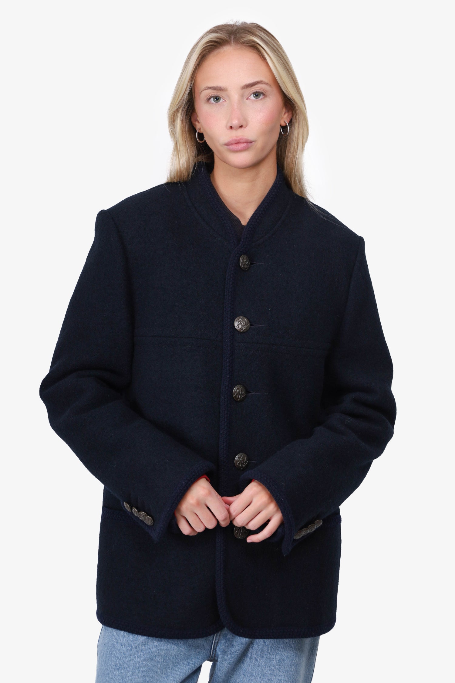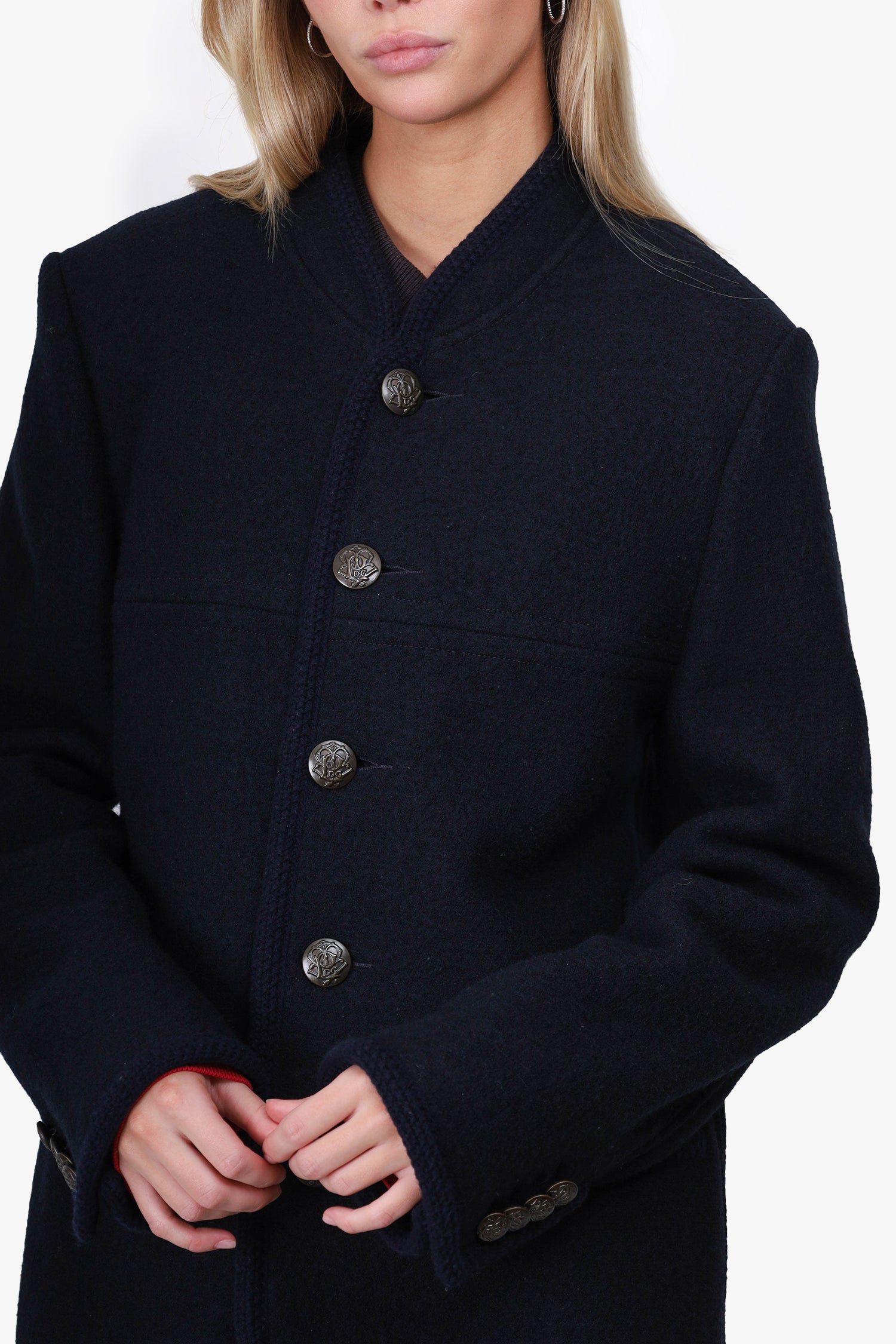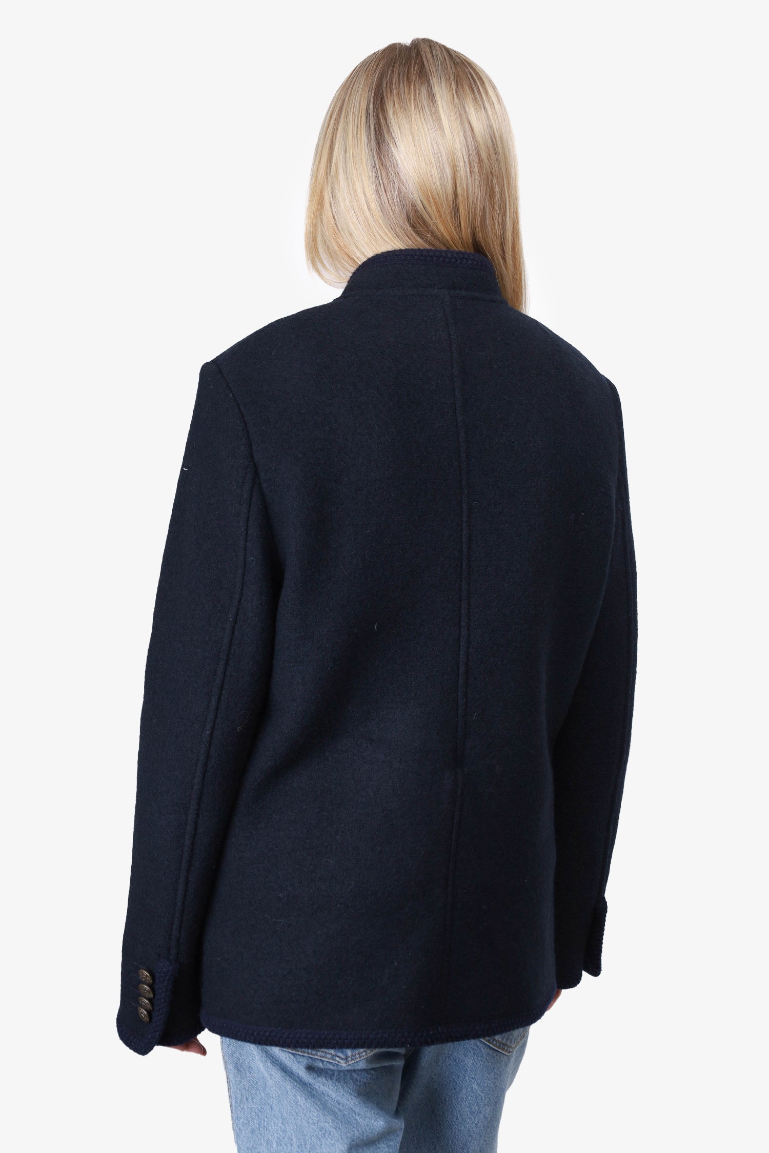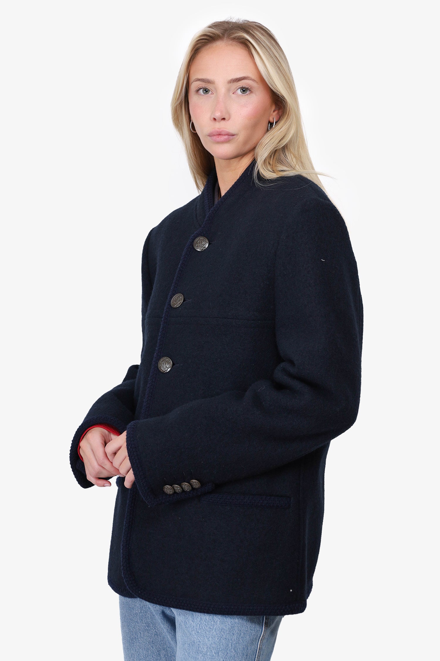 Refresh availabilityDolce & Gabbana Black/Navy Pipping Wool Blazer. Front button-up closure. 2 front slip pockets. Button-up detail on sleeve cuffs. Unlined. Tonal stitching.