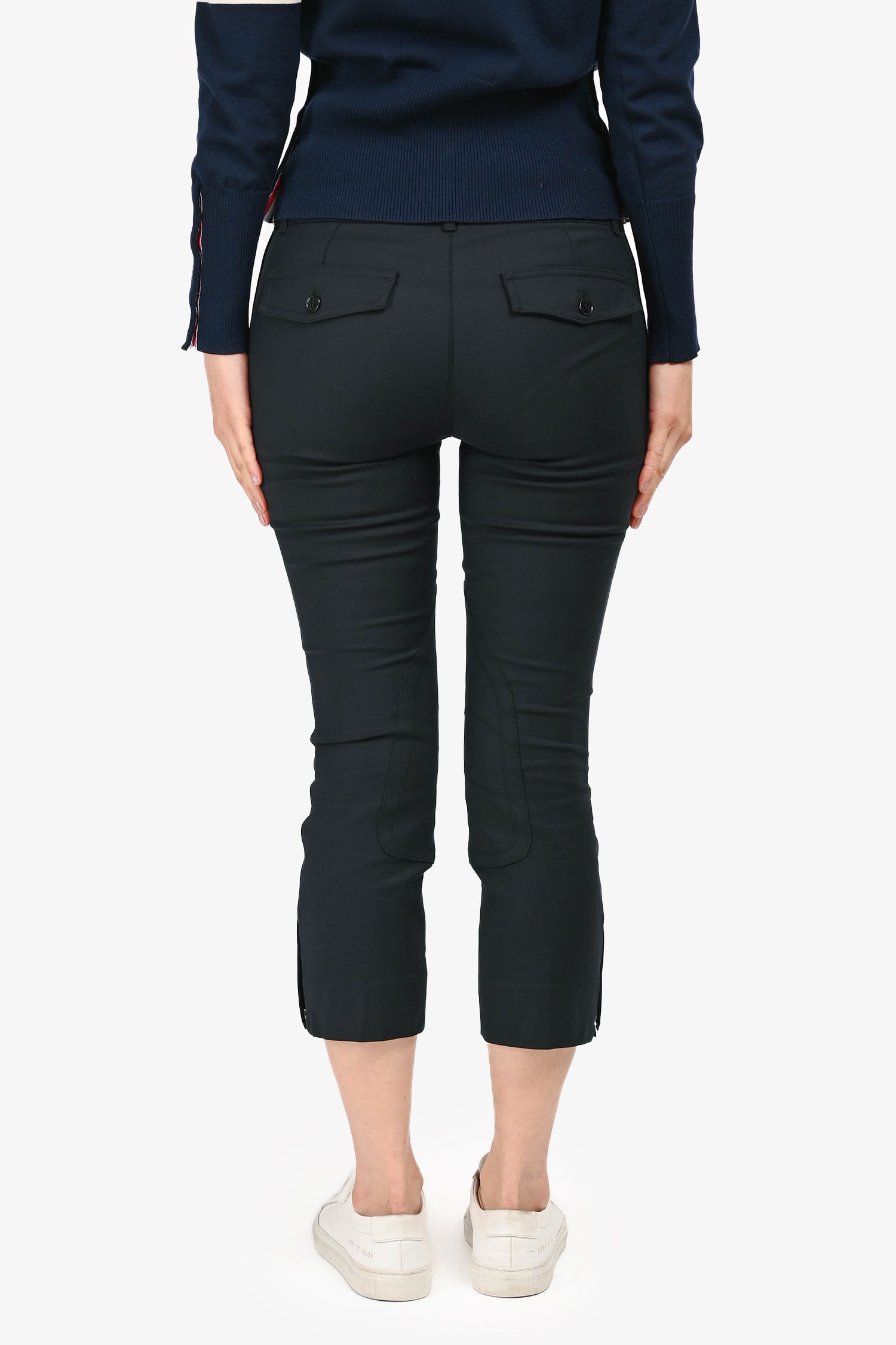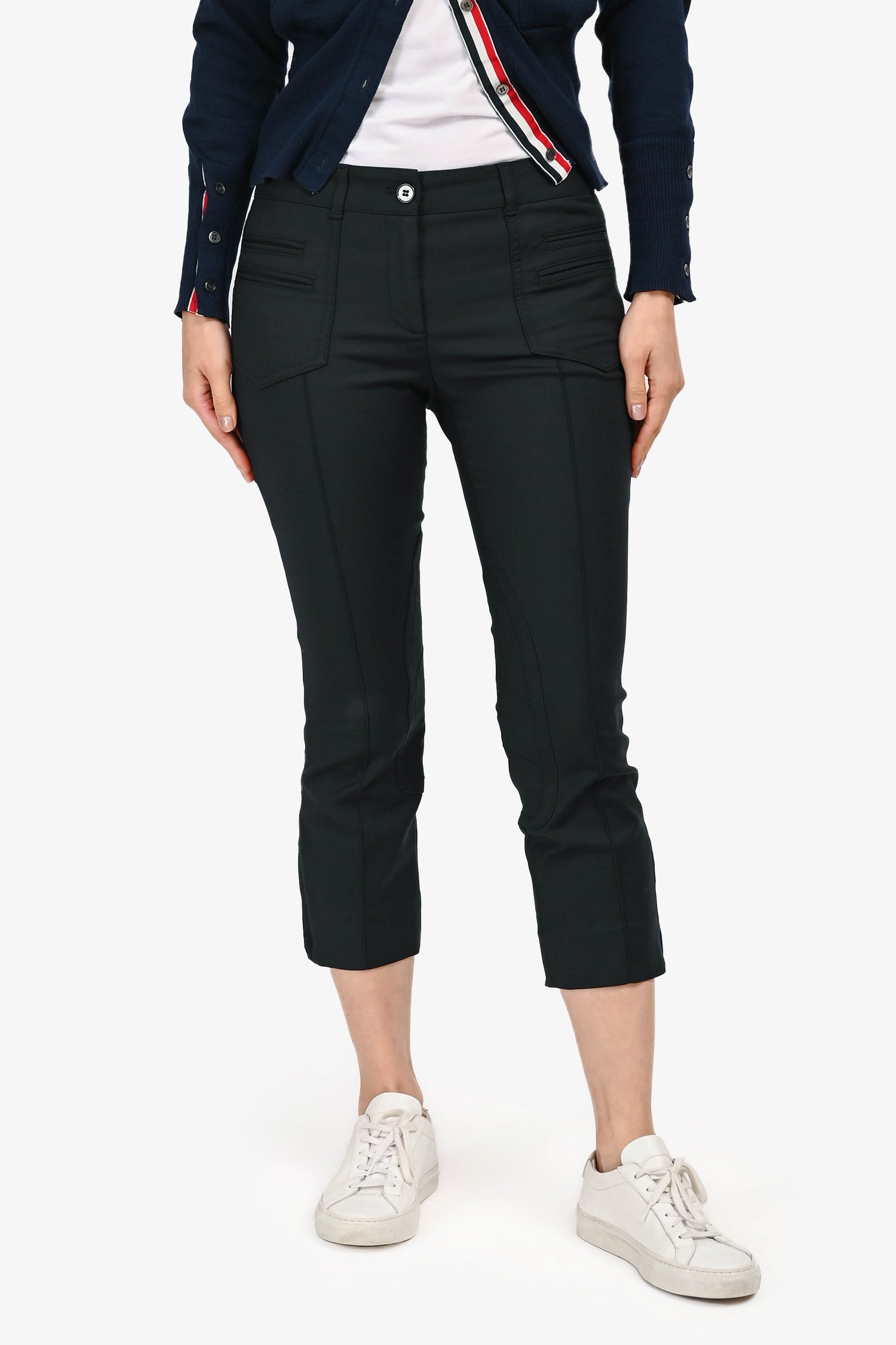 Refresh availabilityDolce & Gabbana Black Nylon Capris. Zipper fly with button closure. Waistband with belt loops. 2 front faux slip pockets and 2 front regular slip pockets. 2 faux back pockets with button detailing. Zipper detail at the hem. Inner seam panel detailing. Silver-tone hardware. Tonal stitching.