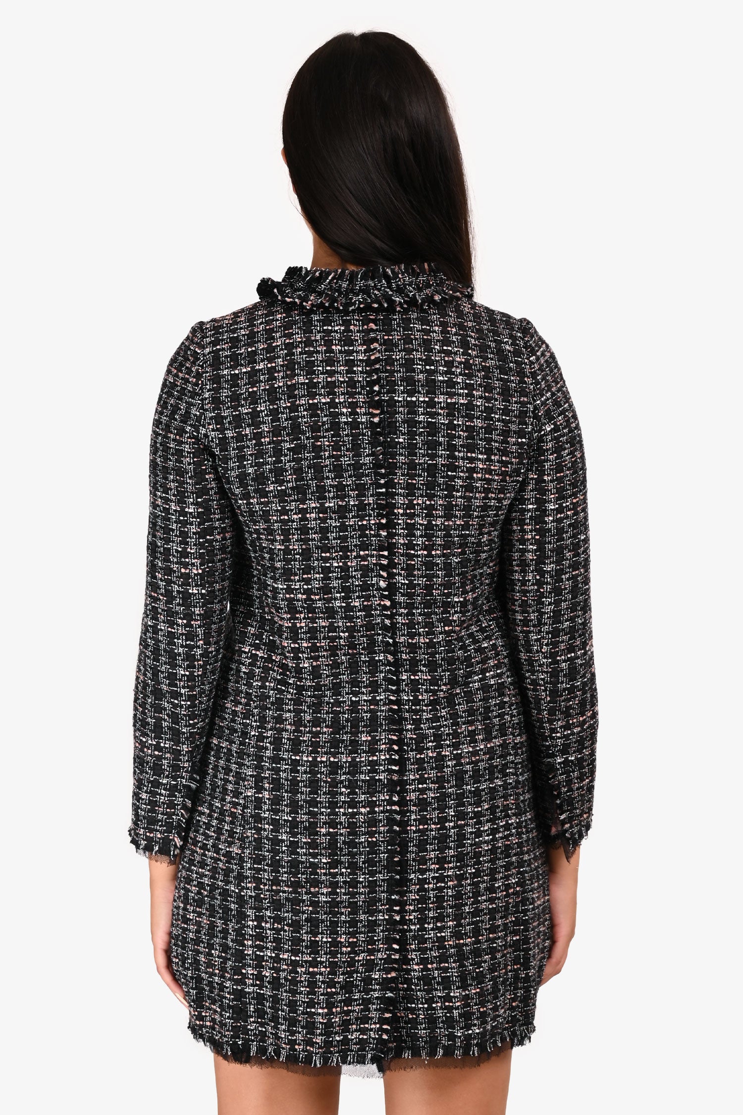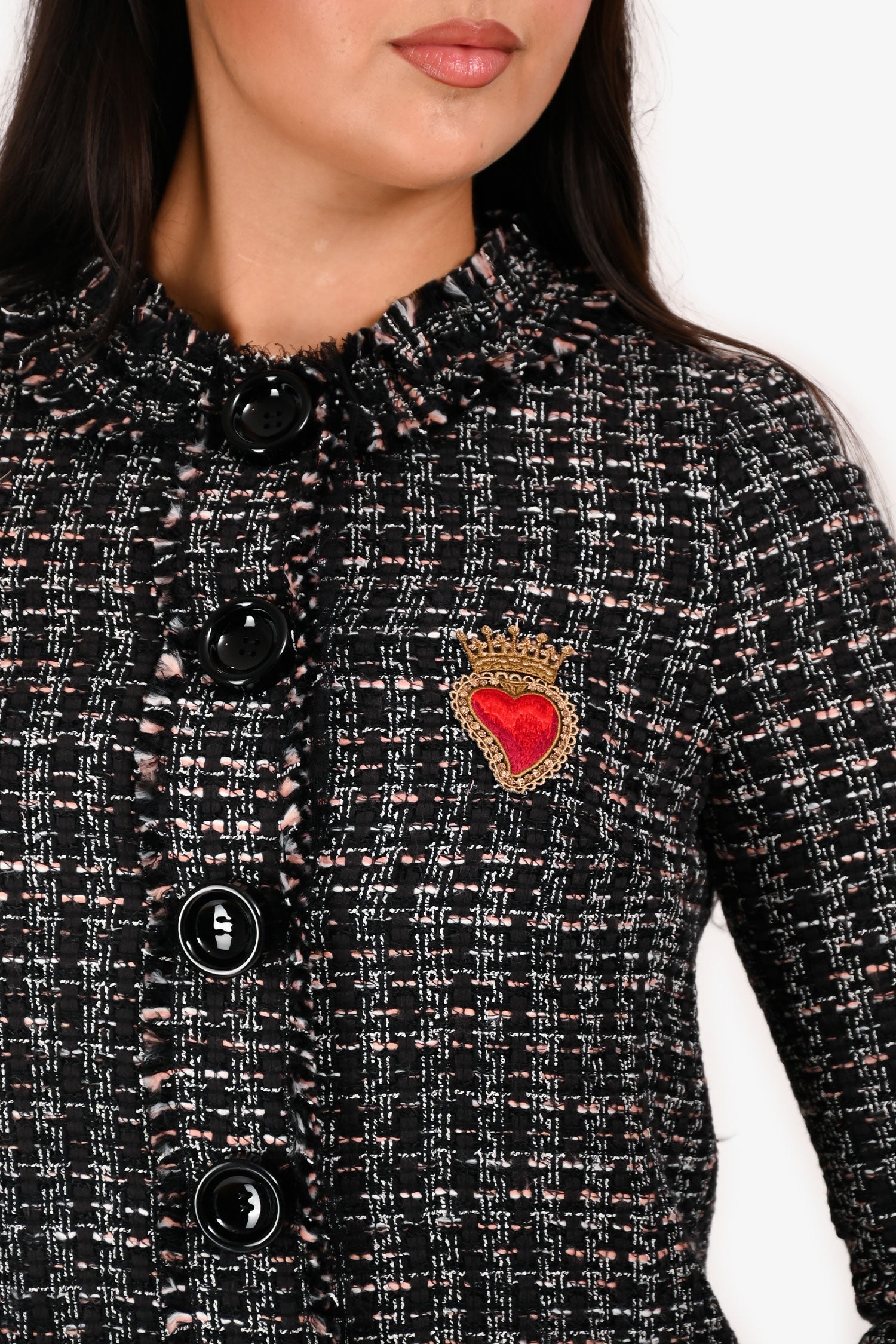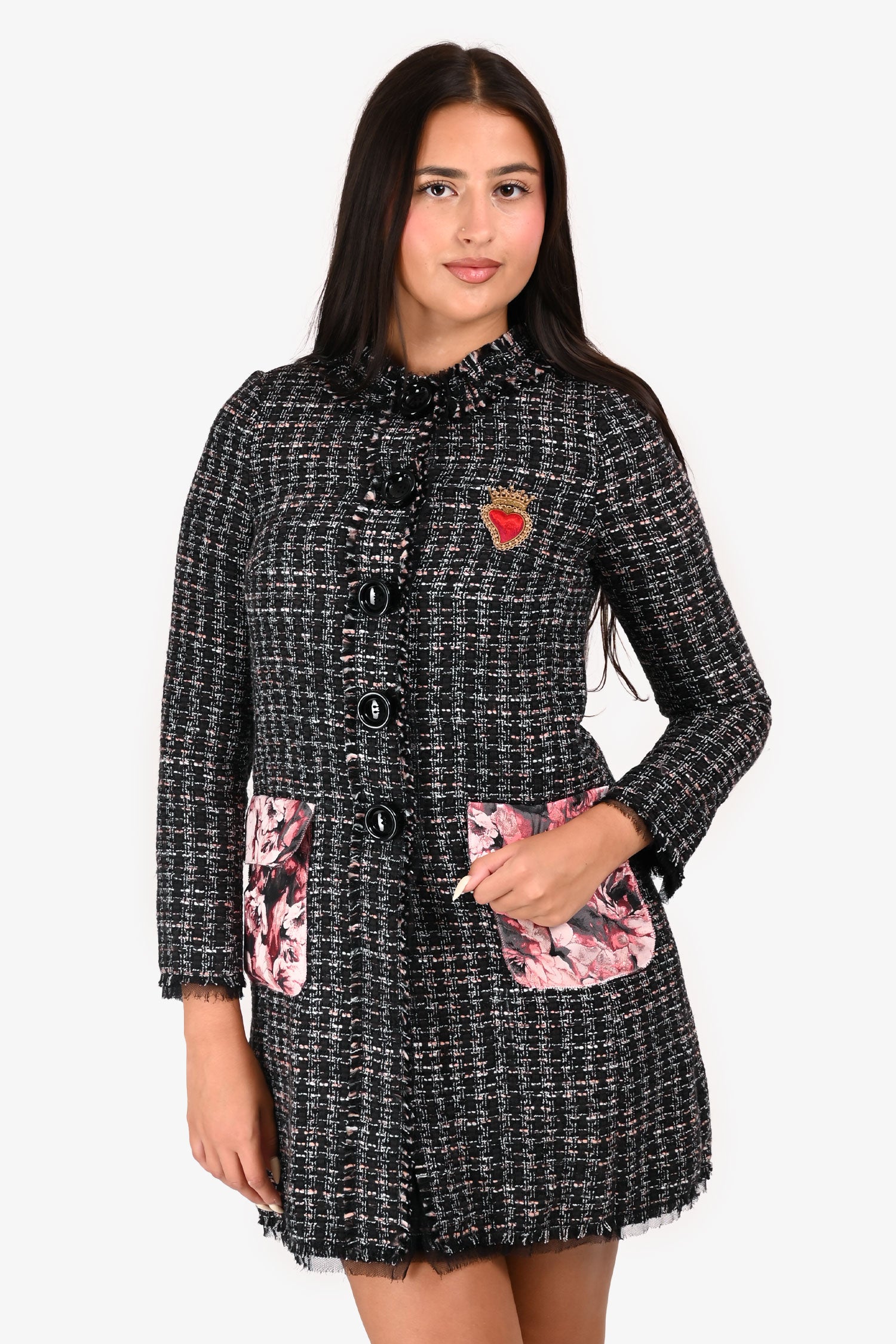 Refresh availabilityDolce & Gabbana Black/Pink Tweed Floral Pocket Coat. Front button closure. Mesh lining. Button closure at cuffs. Embroidered heart detailing. Two front flap pockets with contrast floral fabric. Flat collar detailing. Frayed bottom and cuff hem detailing. Tonal stitching.