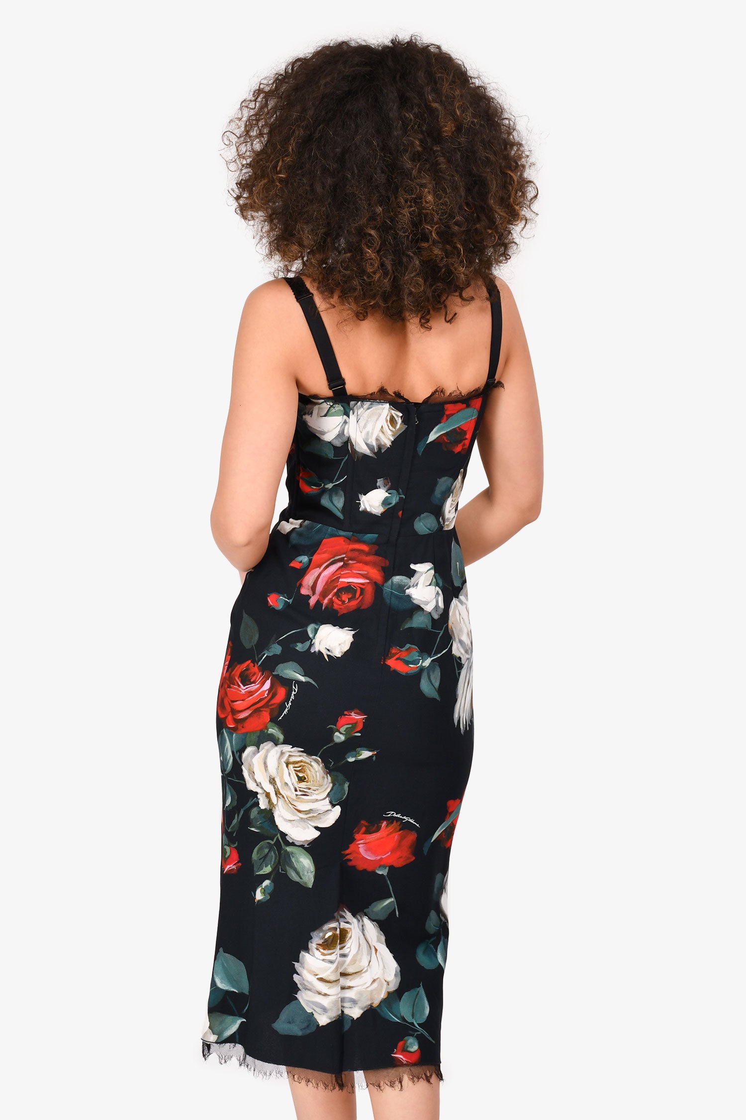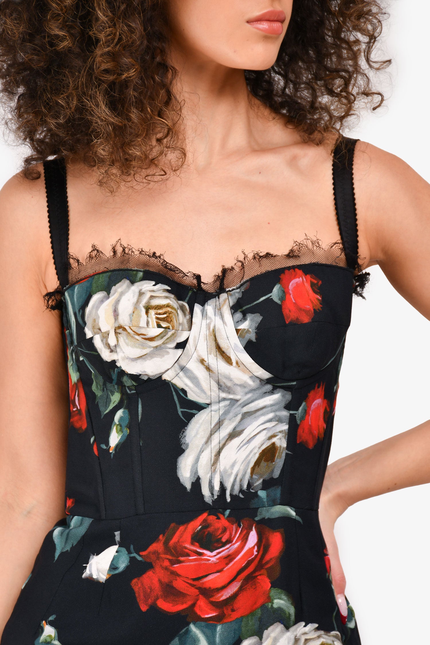 Refresh availabilityDolce & Gabbana Black/Red Floral Print Bustier Dress. Rear zip closure. Lined. Adjustable straps. Tonal stitching.