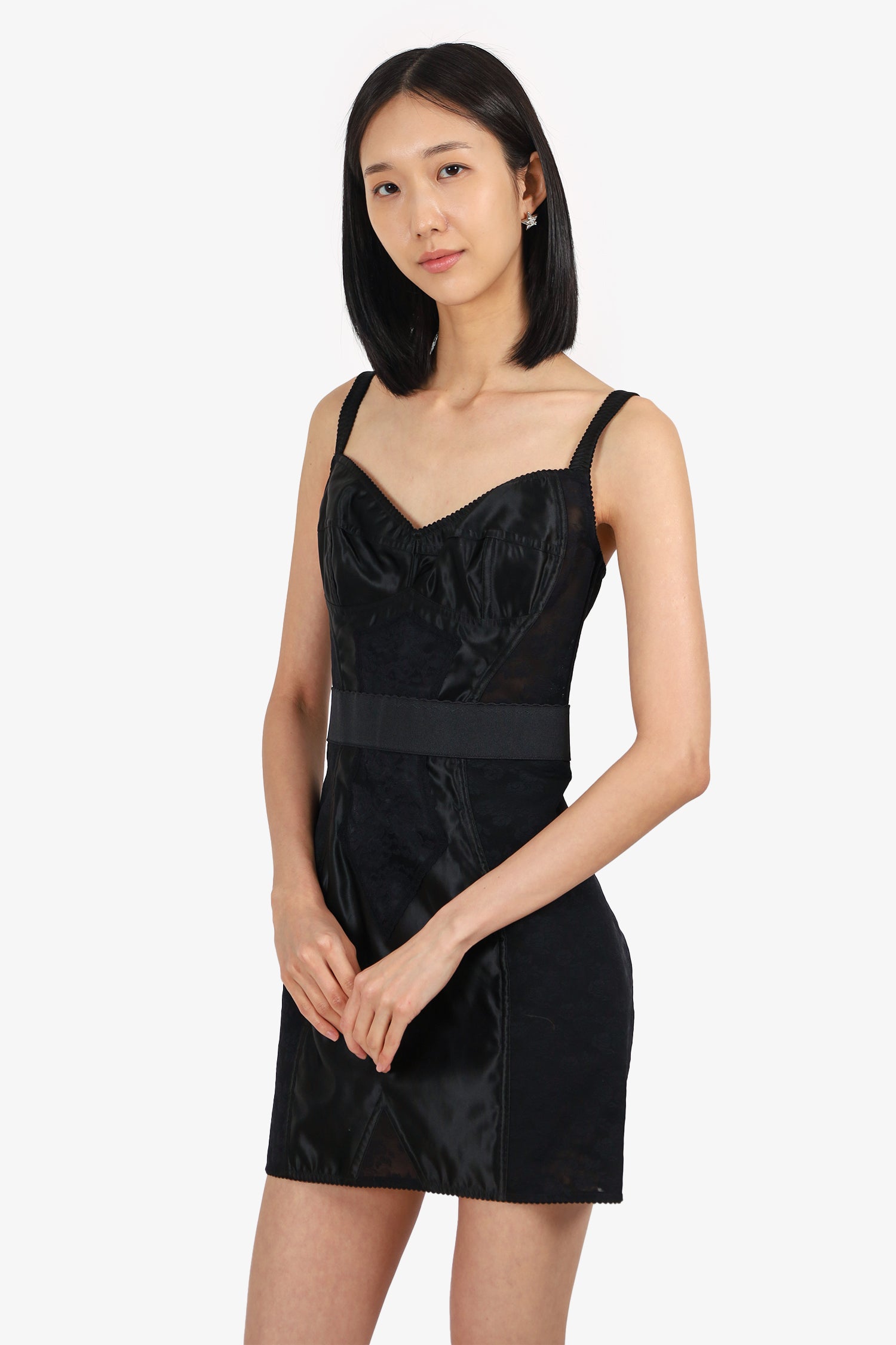 Refresh availabilityDolce & Gabbana Black Satin/Lace Sweetheart Corset Mini Dress. Slip-on. Bustier-neckline. Adjustable strap with buckle closure. Built-in boning. Lined lace panels. Tonal stitching.