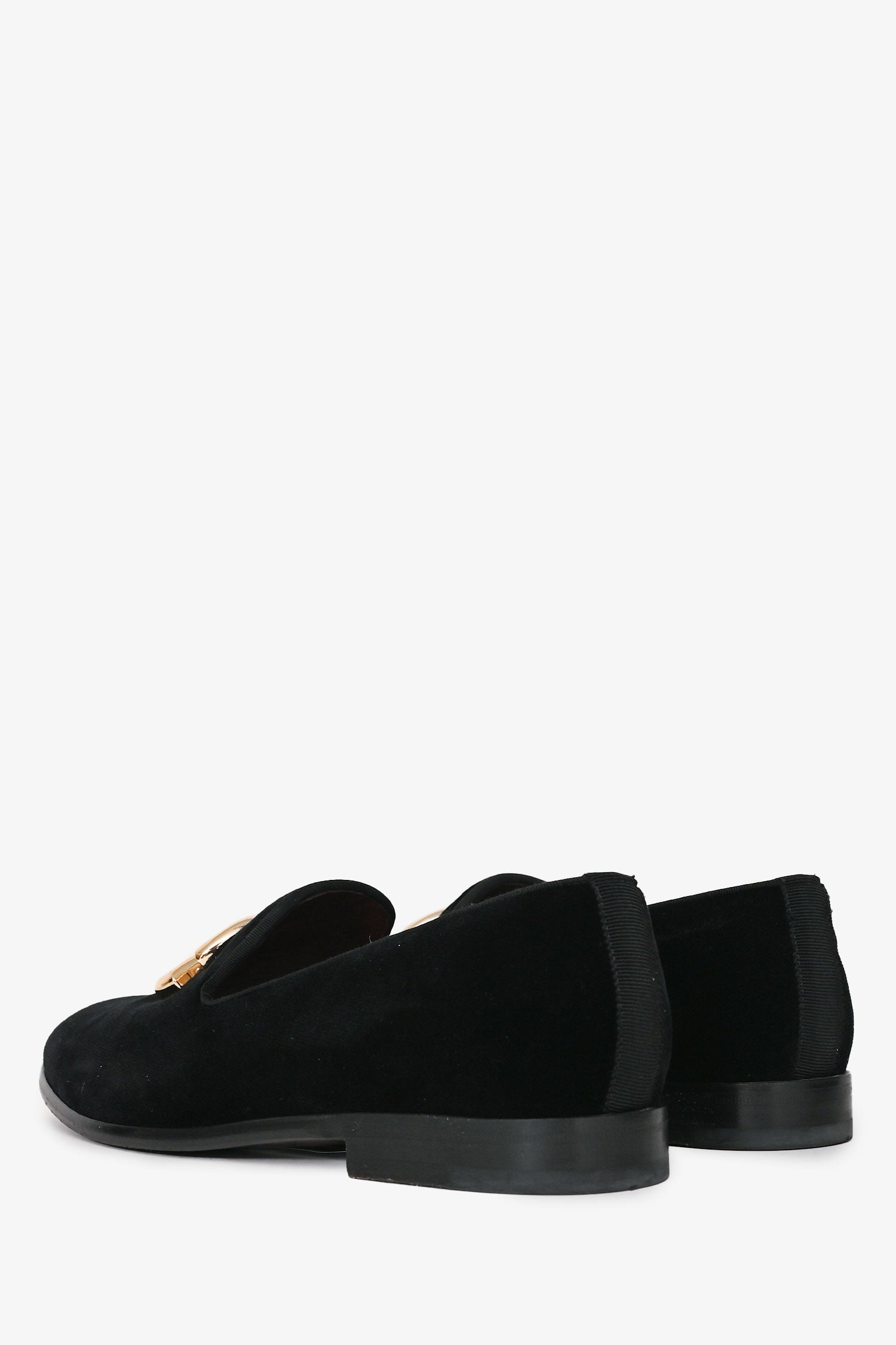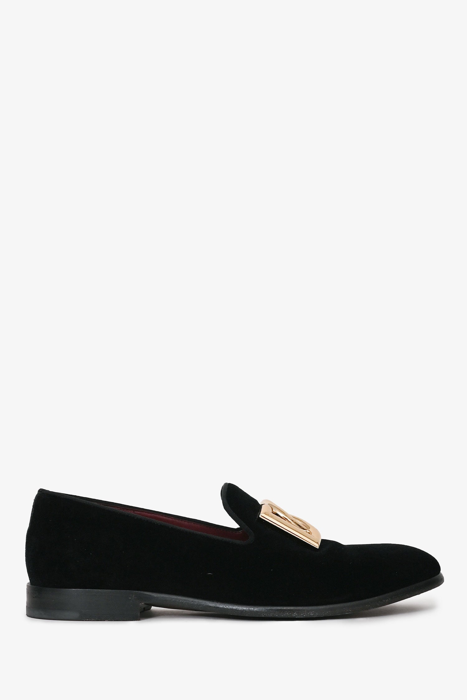 Refresh availabilityDolce & Gabbana Black Velvet DG Logo Slip On Loafers. Gold-tone logo. Red quilted interior. Satin and leather lined interior. Slip-on. Grosgrain trim. Tonal stitching.