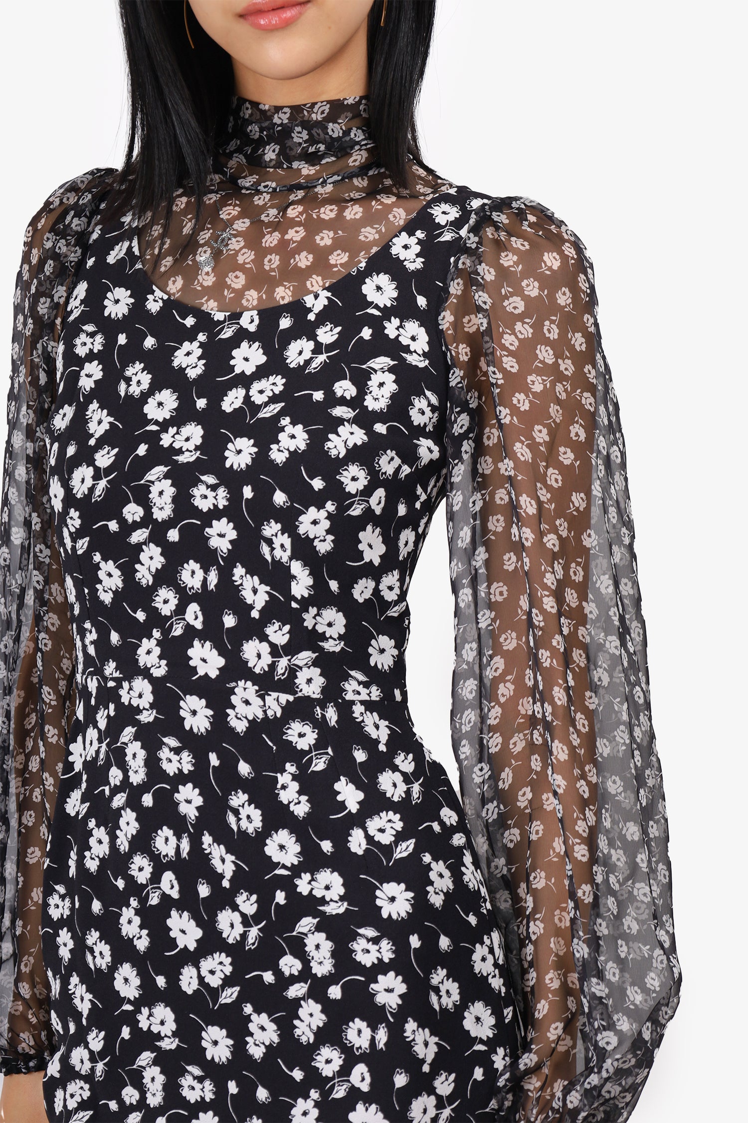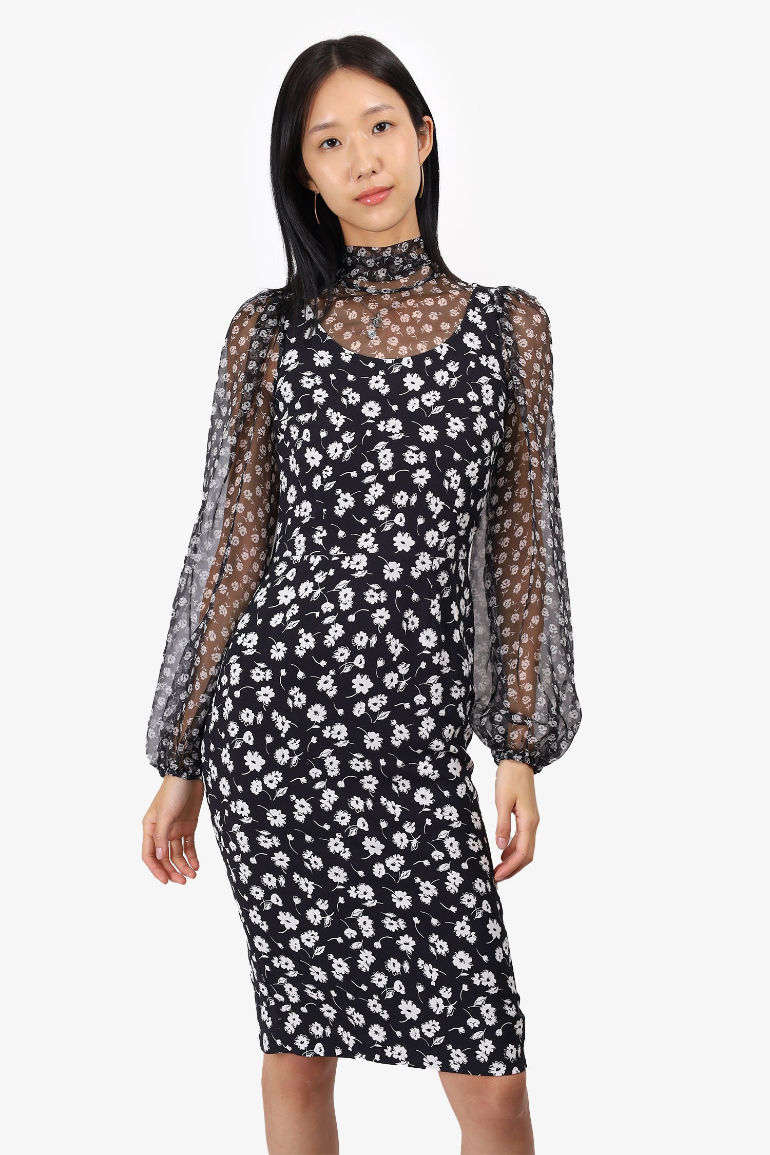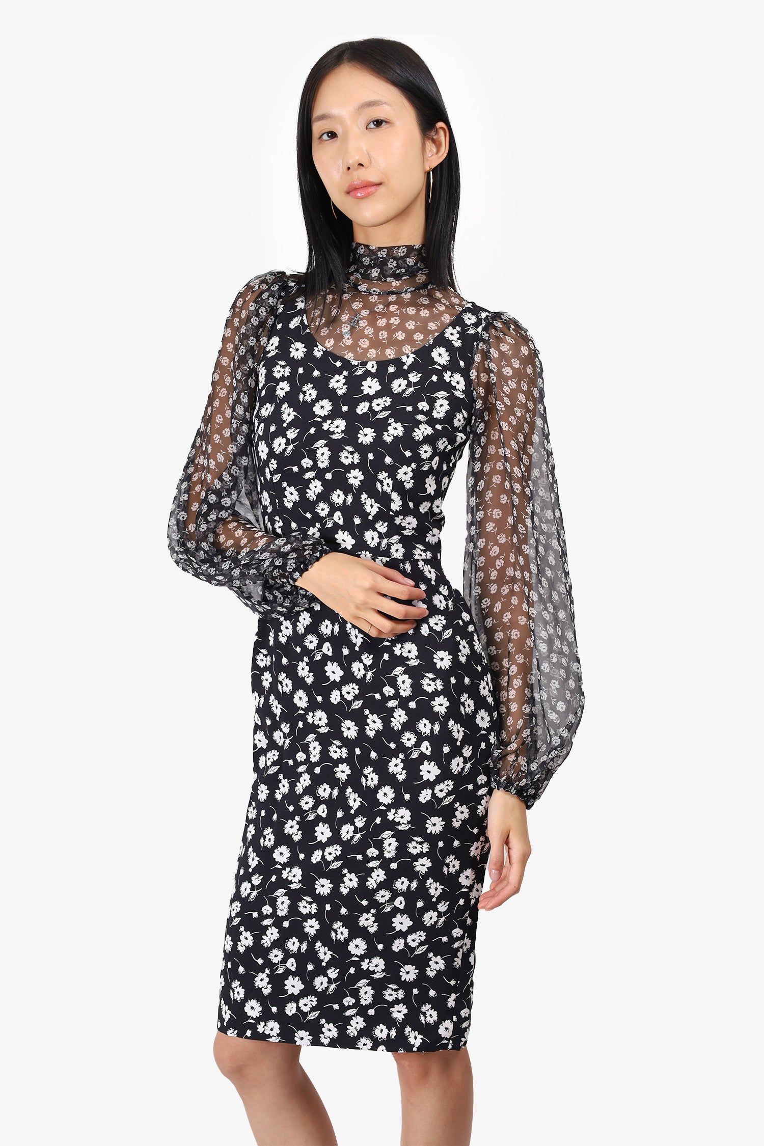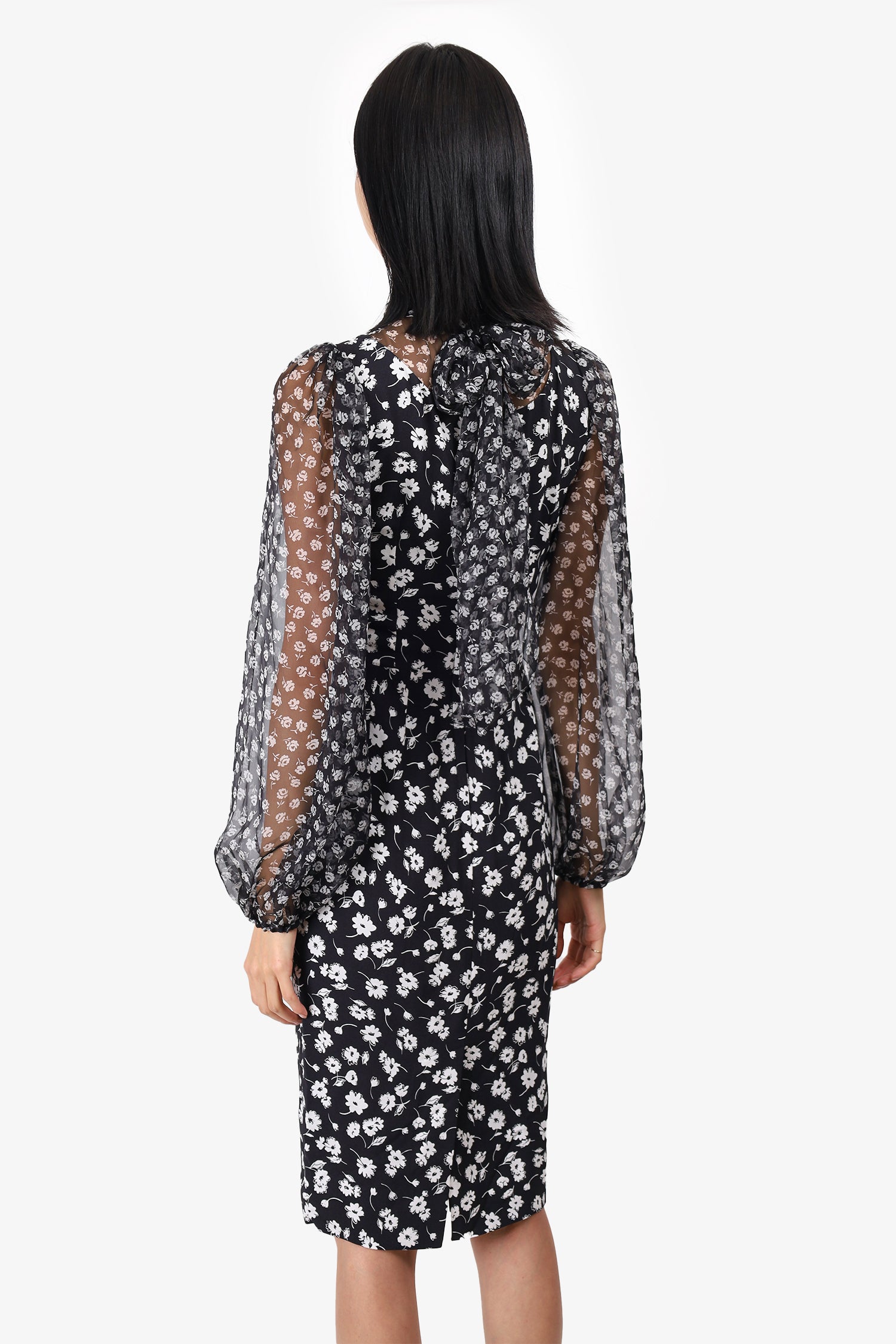 Refresh availabilityDolce & Gabbana Black White Silk Puff Sleeve Floral Printed Midi Dress. Rear zip closure. Attached scarf detailing. Elasticated cuffs. Lined body. Tonal stitching.
