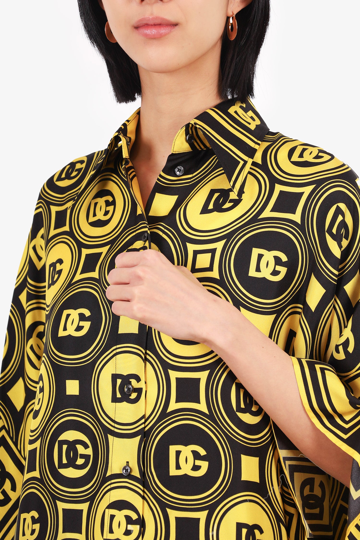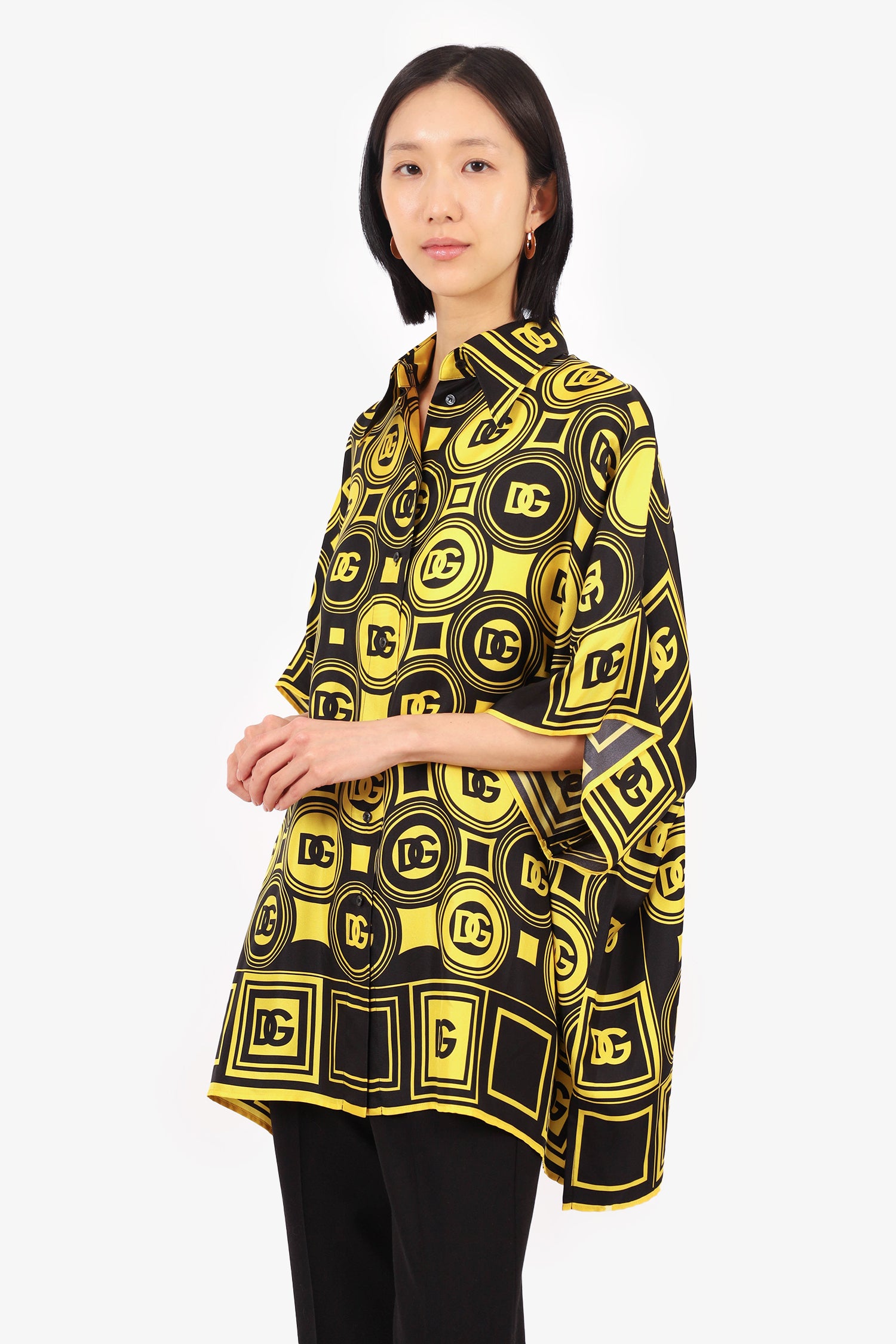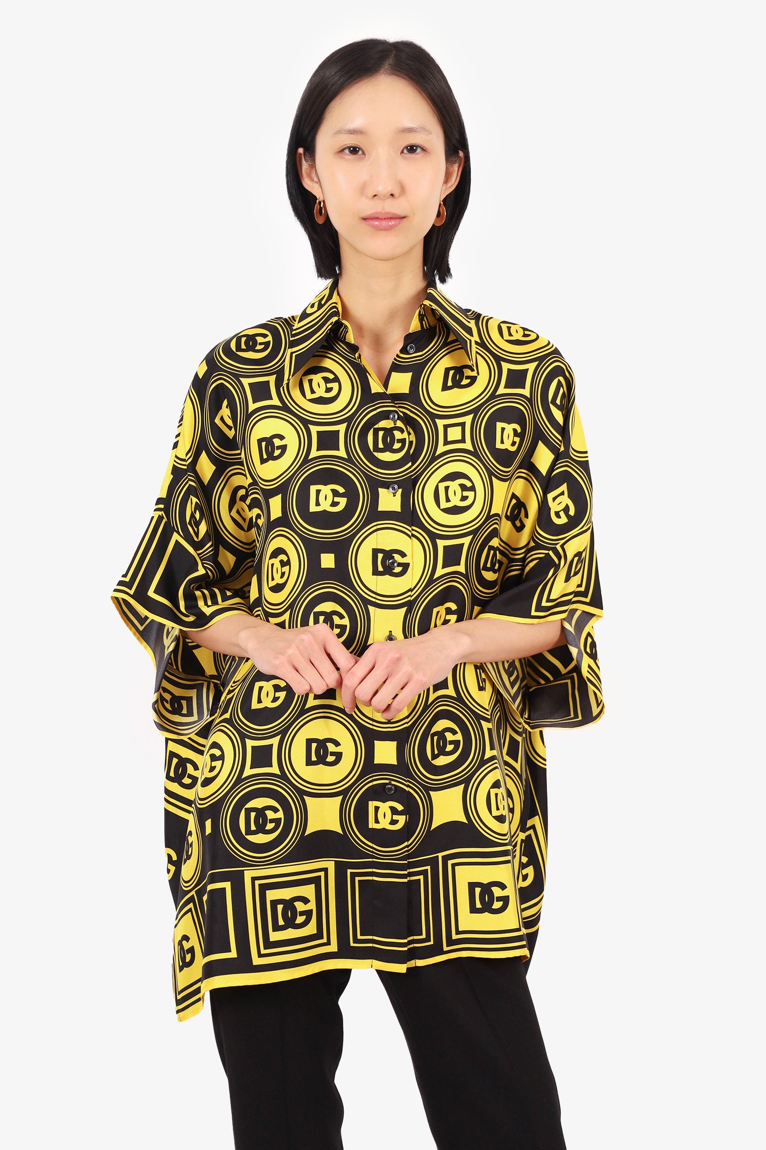 Refresh availabilityDolce & Gabbana Black/Yellow Silk Logo Short Sleeve Blouse. Front button-up closure. Unlined. Tonal stitching.