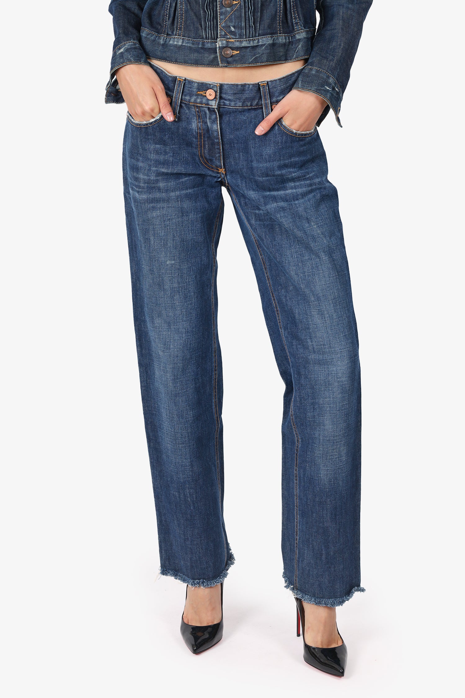 Refresh availabilityDolce & Gabbana Blue Denim Distressed Pony Hair Pocket Jeans. Slip on. Front zip with button-up closure. Waistband belt-loops. 5 exterior pockets; 2 front slip, 1 mini compartment, and 2 rear slip. Brass-tone hardware. Tonal stitching.