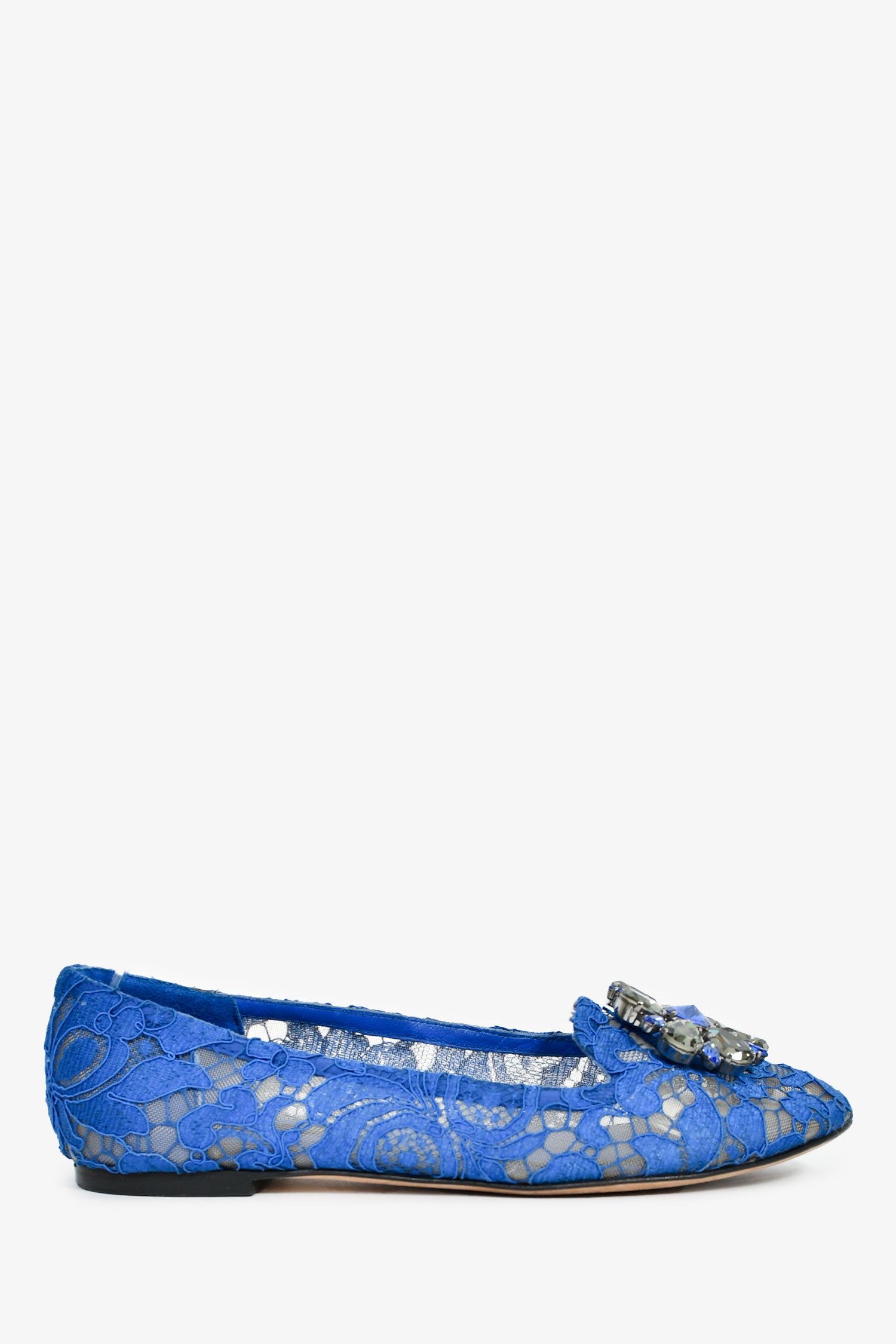 Refresh availabilityDolce Gabbana Blue Lace Crystal Flats. Slip-on. Almond toe. Silver-tone hardware. Tonal stitching.