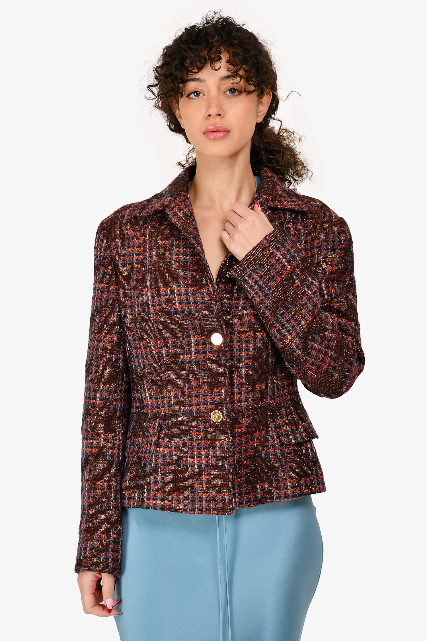 Refresh availabilityDolce & Gabbana Brown/Multi Tweed Blazer. Collared v-neckline. Front button-up closure. Front decorative pockets. Built-in shoulder pads. Gold-tone hardware. Tonal stitching.