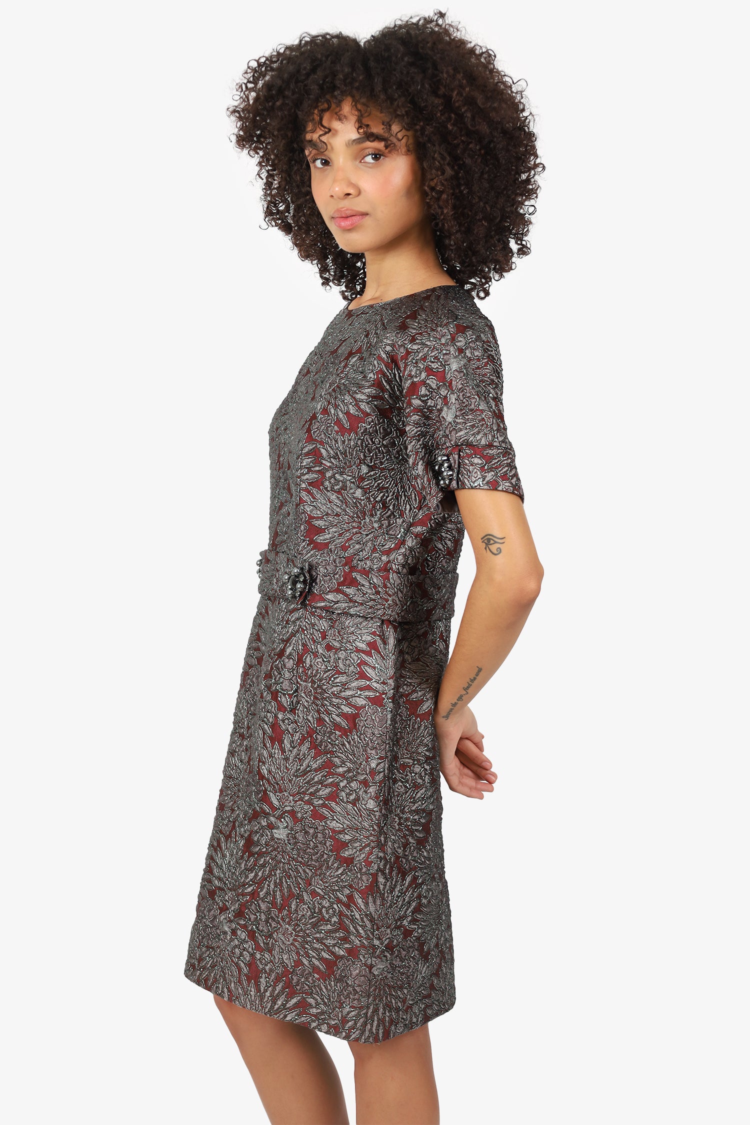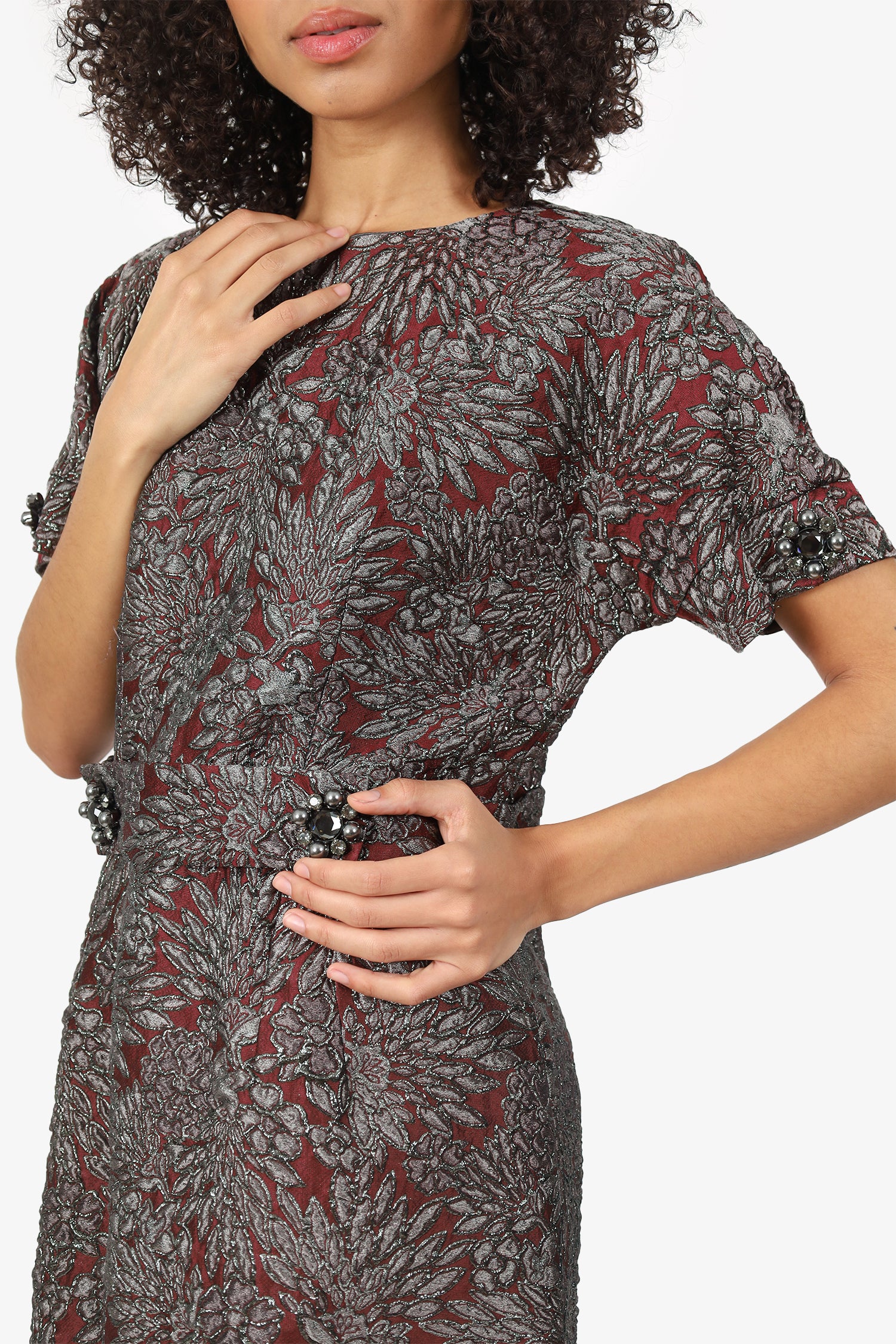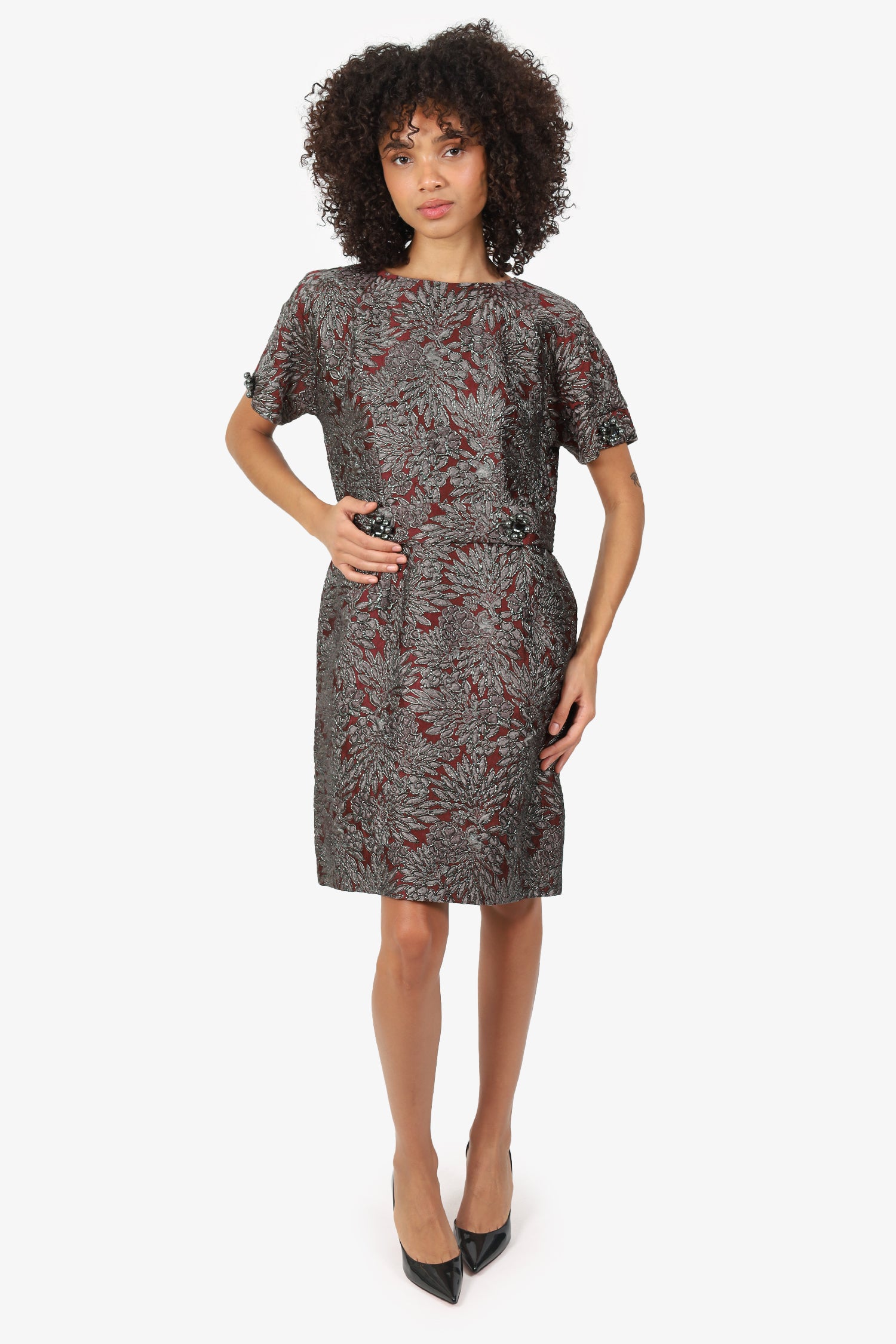 Refresh availabilityDolce & Gabbana Burgundy/Black Floral Crystal Belt Short Sleeve Dress. Pull-on. Round neckline. Rear zip and hook closures. Removable belt with rear snap-button closures. Embellishments to sleeve cuffs and belt. Gunmetal-tone hardware. Lined interior. Tonal stitching.