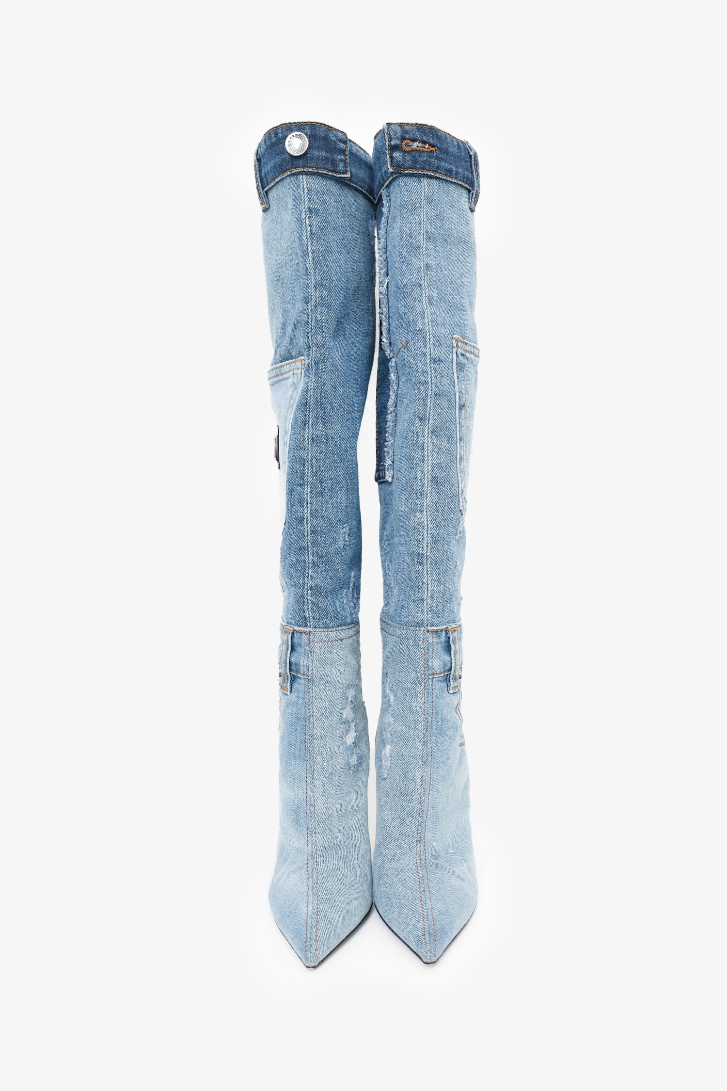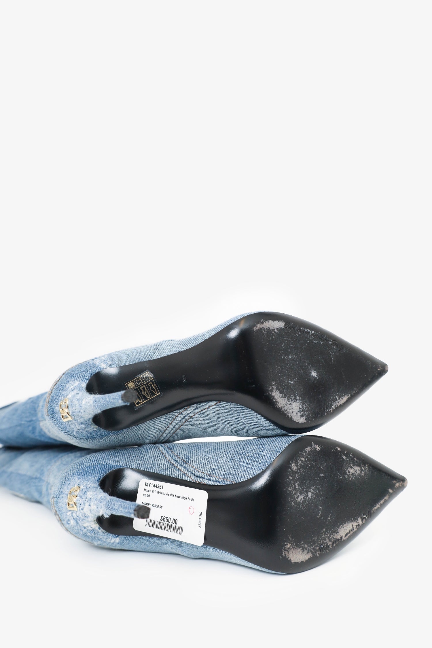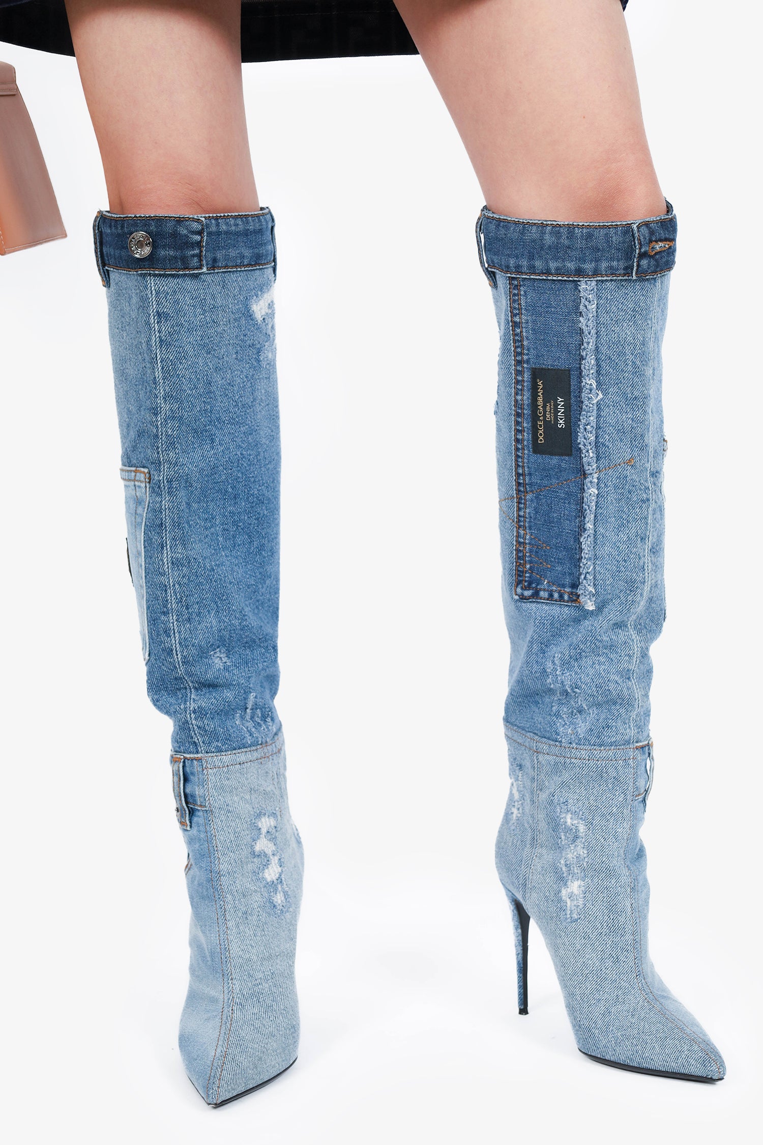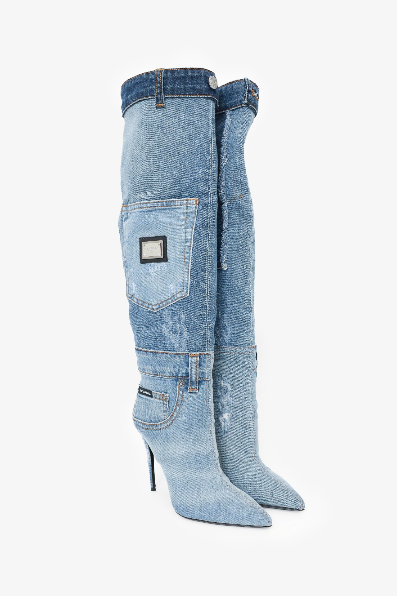 Refresh availabilityDolce & Gabbana Denim Knee High Boots. Slip-on. Pointed toe. Slip side pockets. Contrast stitching.