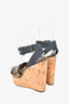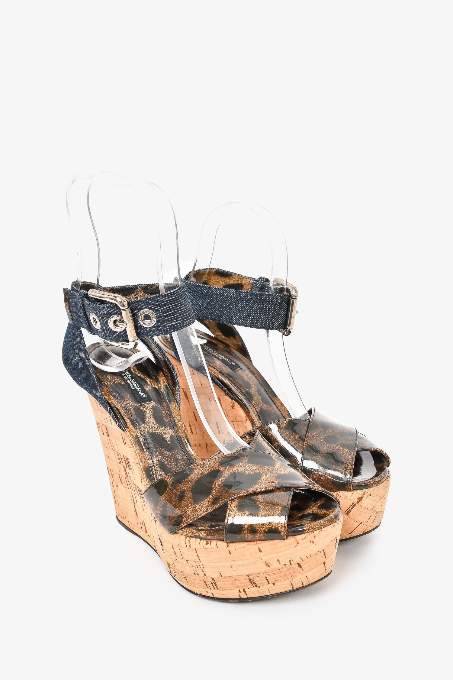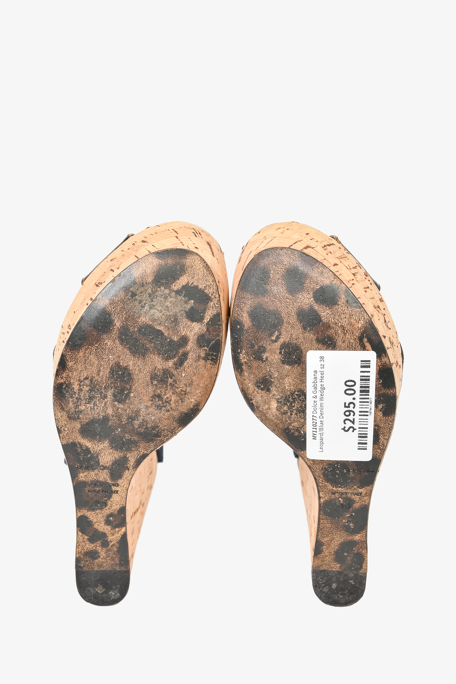 Refresh availabilityDolce & Gabbana Leopard/Blue Denim Wedge Heel. Cork wedge heel. Leopard bottom and upper sole. Silver toned metal strap and buckle closure with dark denim strap. Leopard upper criss cross strap with glossy finish.