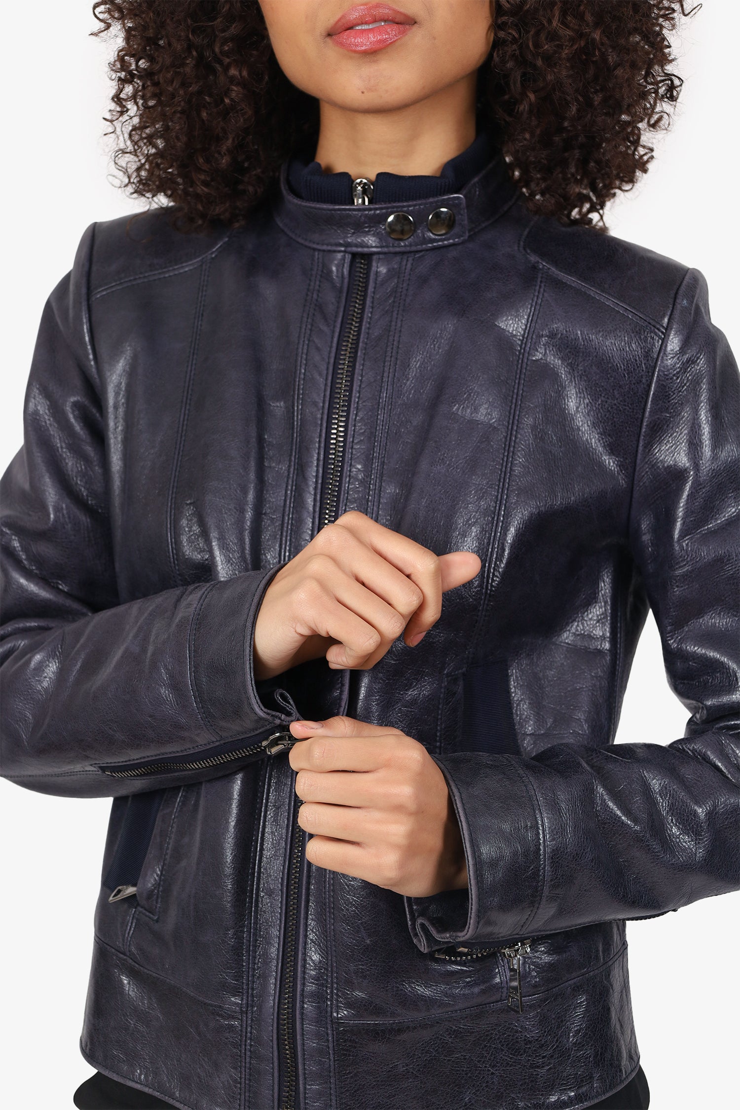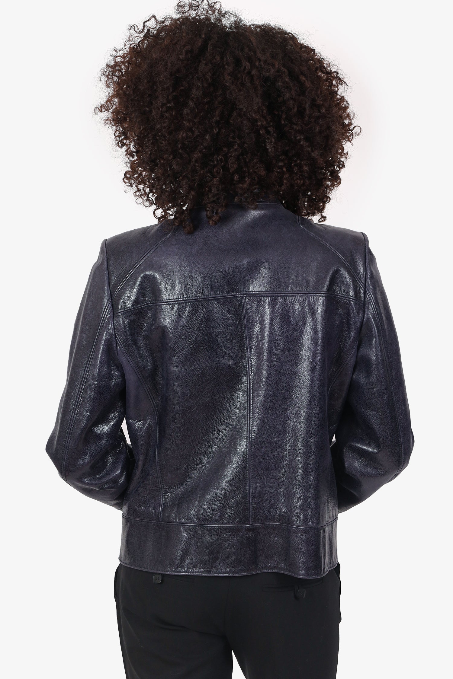 Refresh availabilityDolce & Gabbana Navy Leather Biker Jacket. Pull-on. Round neckline. Front zip and snap button-up closures. Zip-up detail to sleeve cuffs. 2 exterior front zip up pockets. Lined interior. Silver-tone hardware. Tonal stitching.
