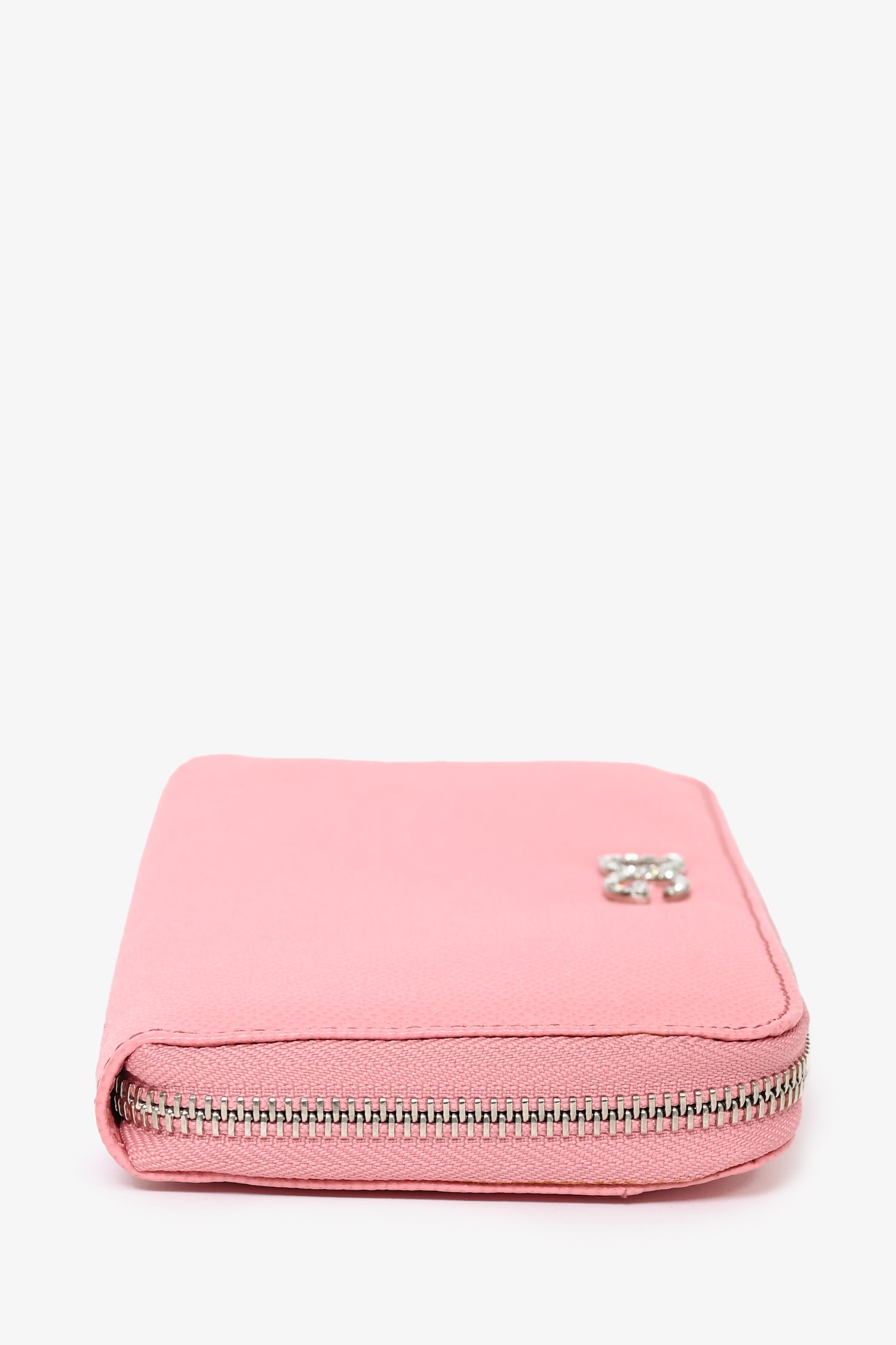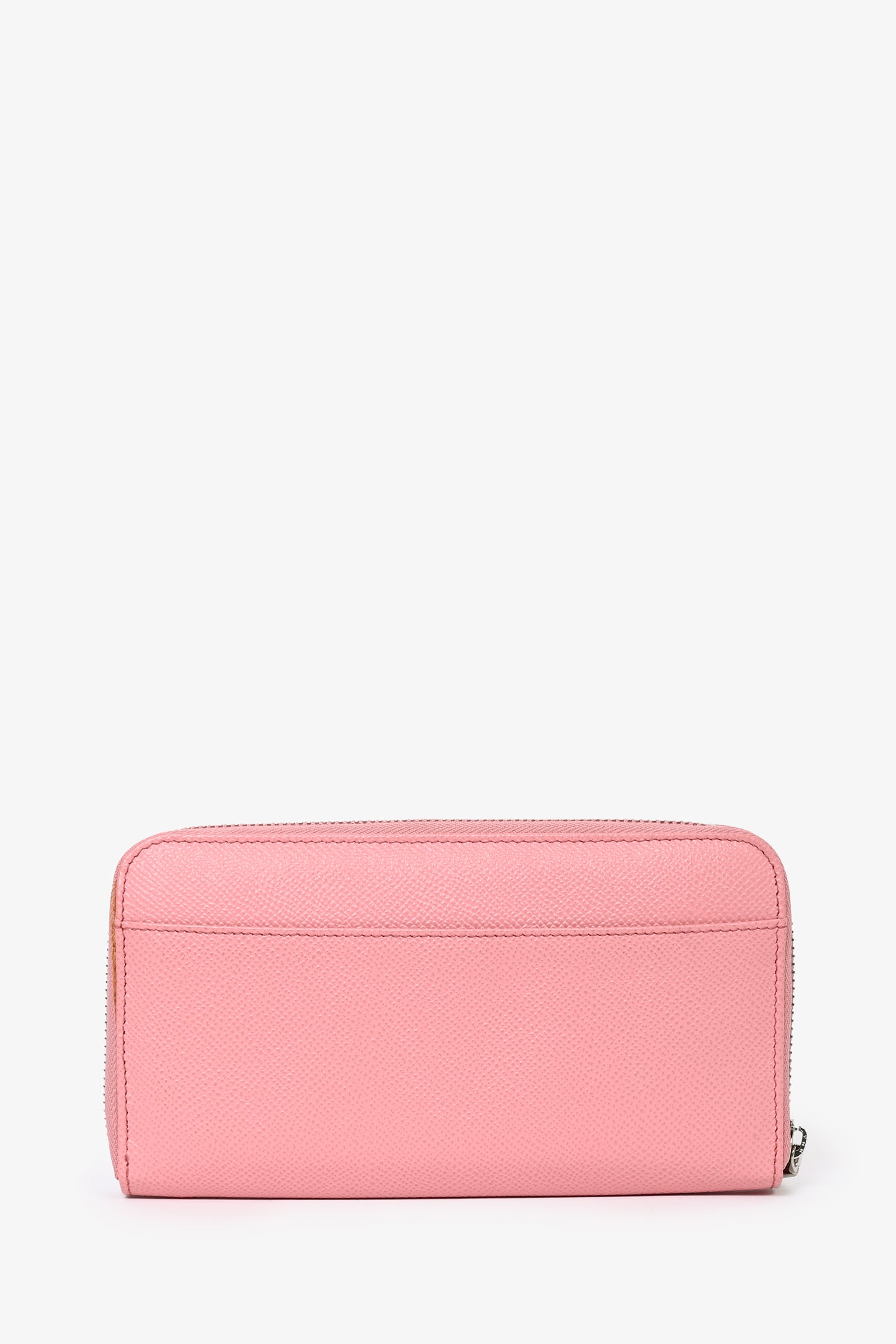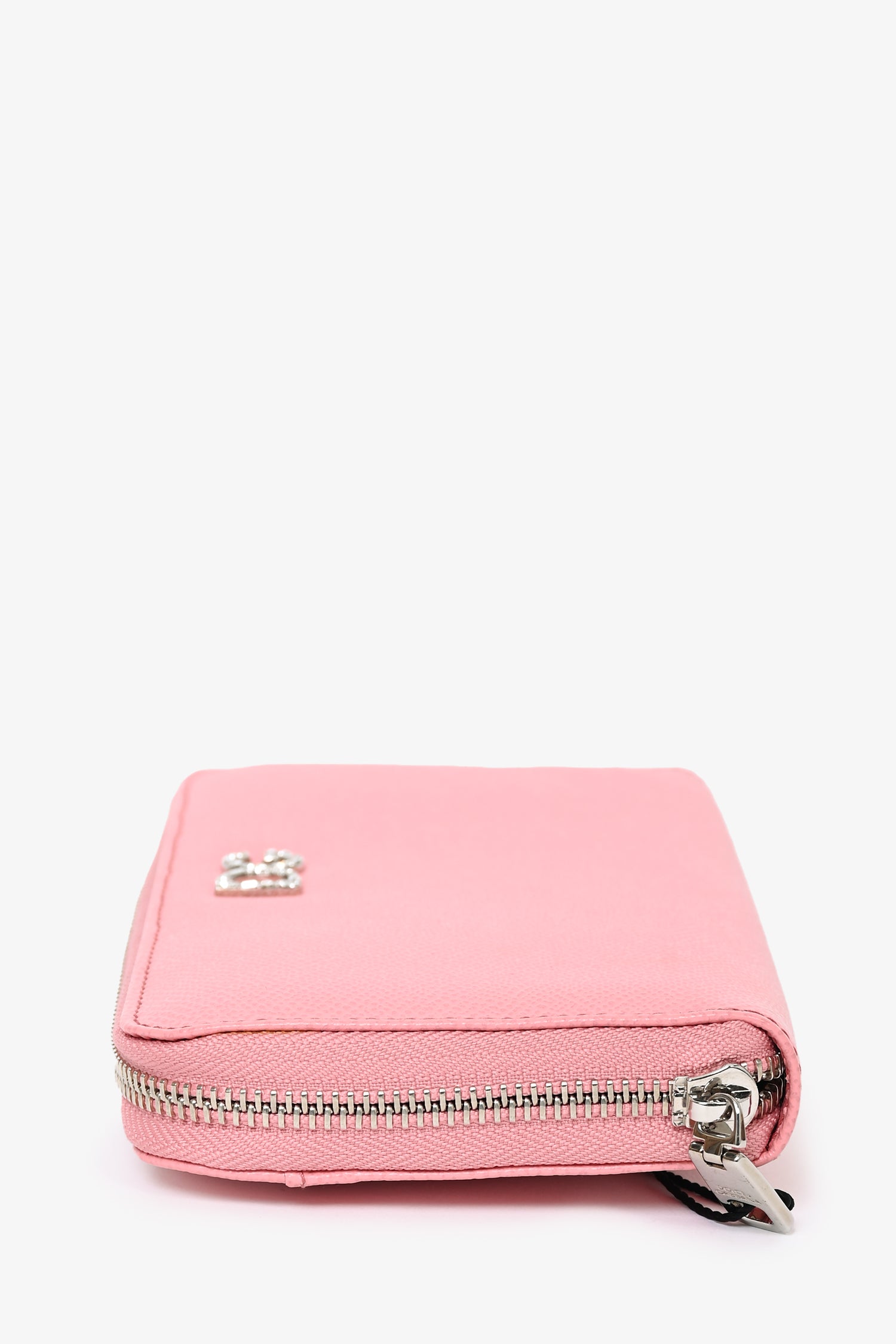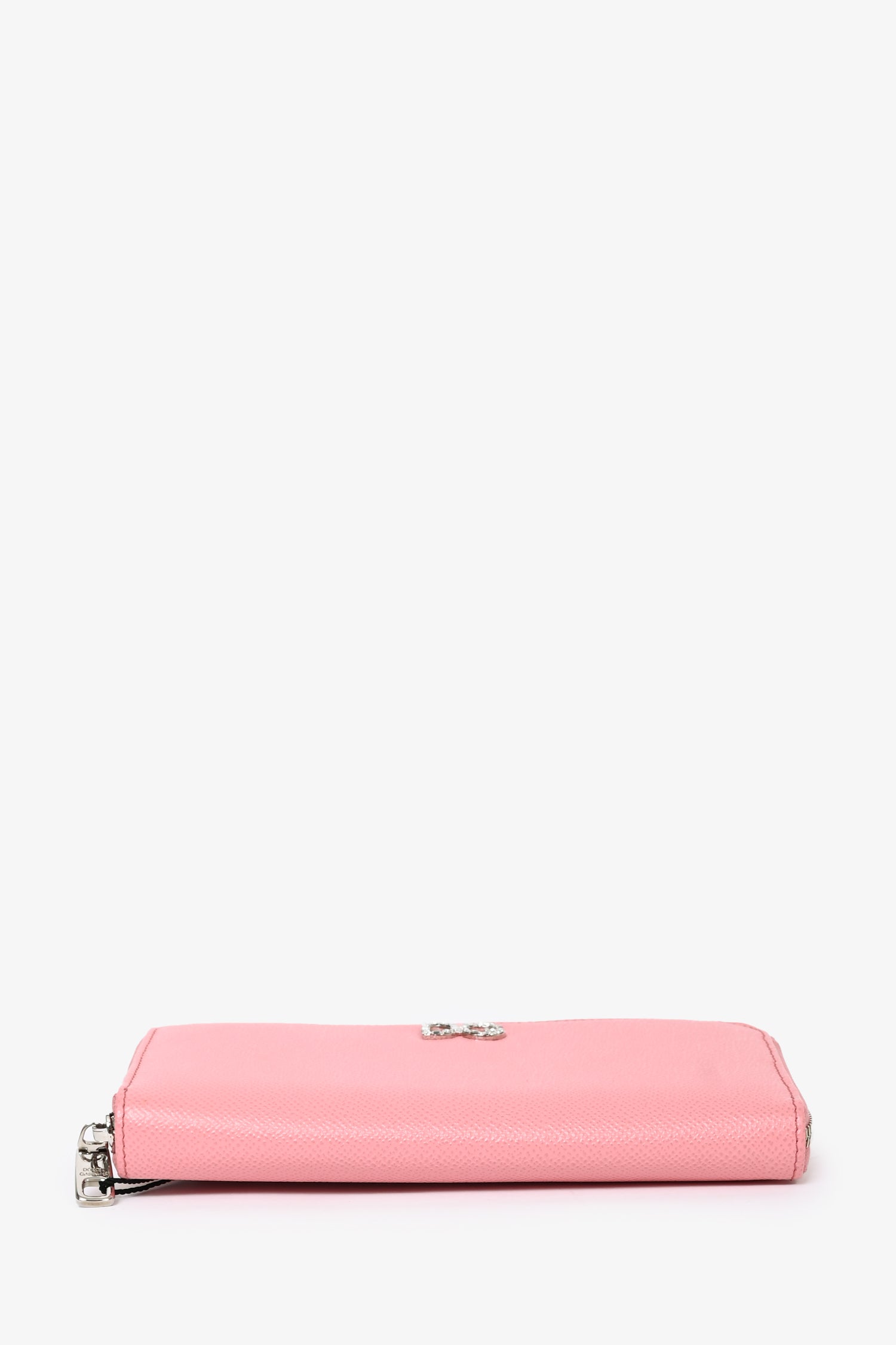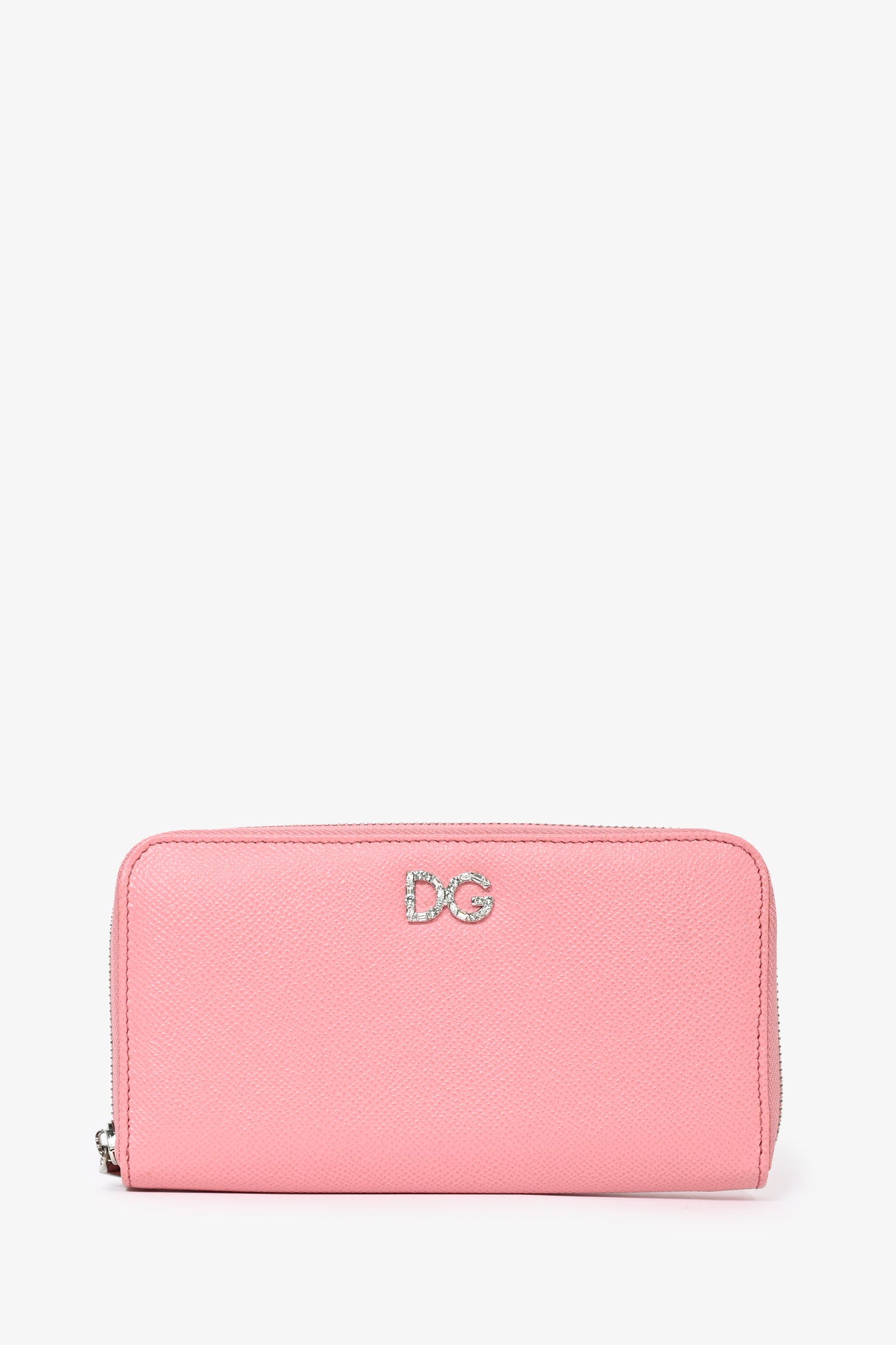 Refresh availabilityDolce & Gabbana Pink Leather 'DG' Embellished Zip Wallet. Top zip closure. 1 interior zip pocket. 12 interior card-slip pockets. 5 interior cash-slip pockets. 1 exterior slip pocket. Silver-tone hardware. Tonal stitching.