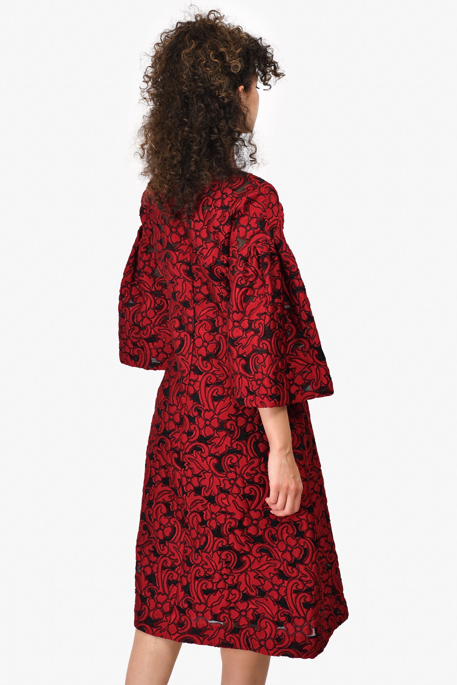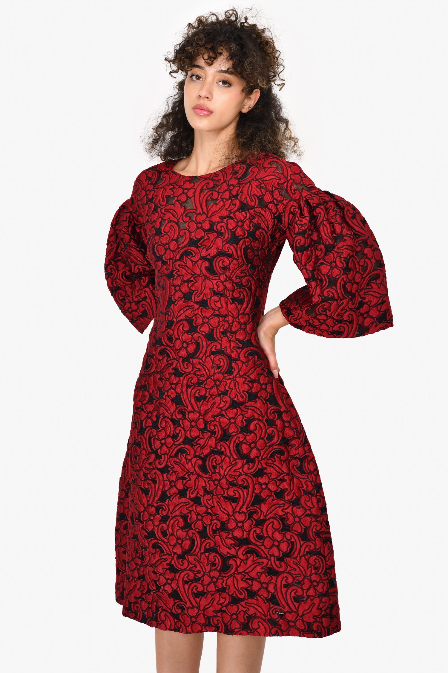 Refresh availabilityDolce & Gabbana Red/Black Jacquard 3/4 Flared Sleeve Midi Dress with Black Sleeve. Tonal stitching. Interior slip. Zip closure at back.