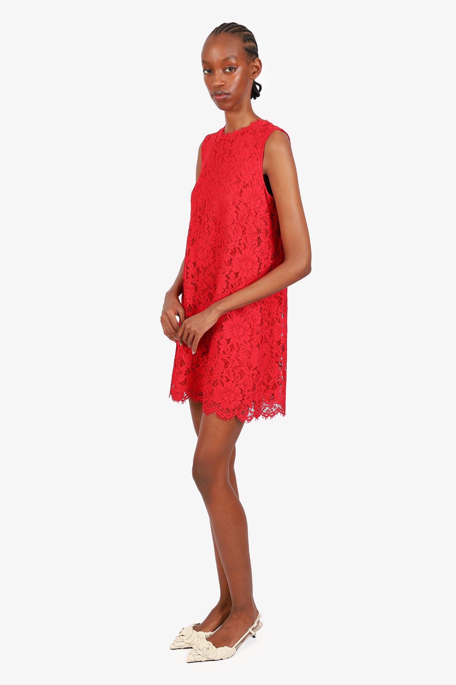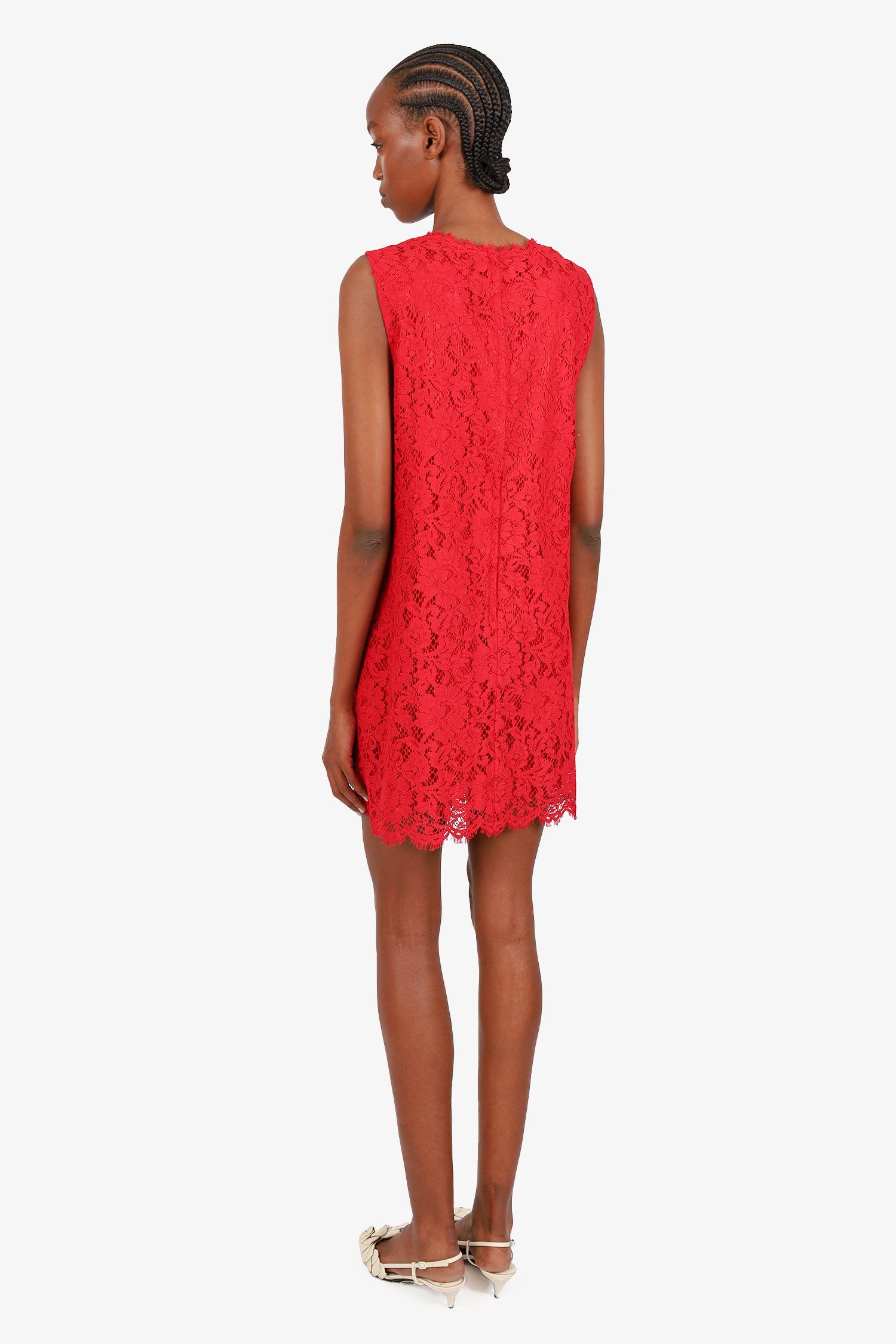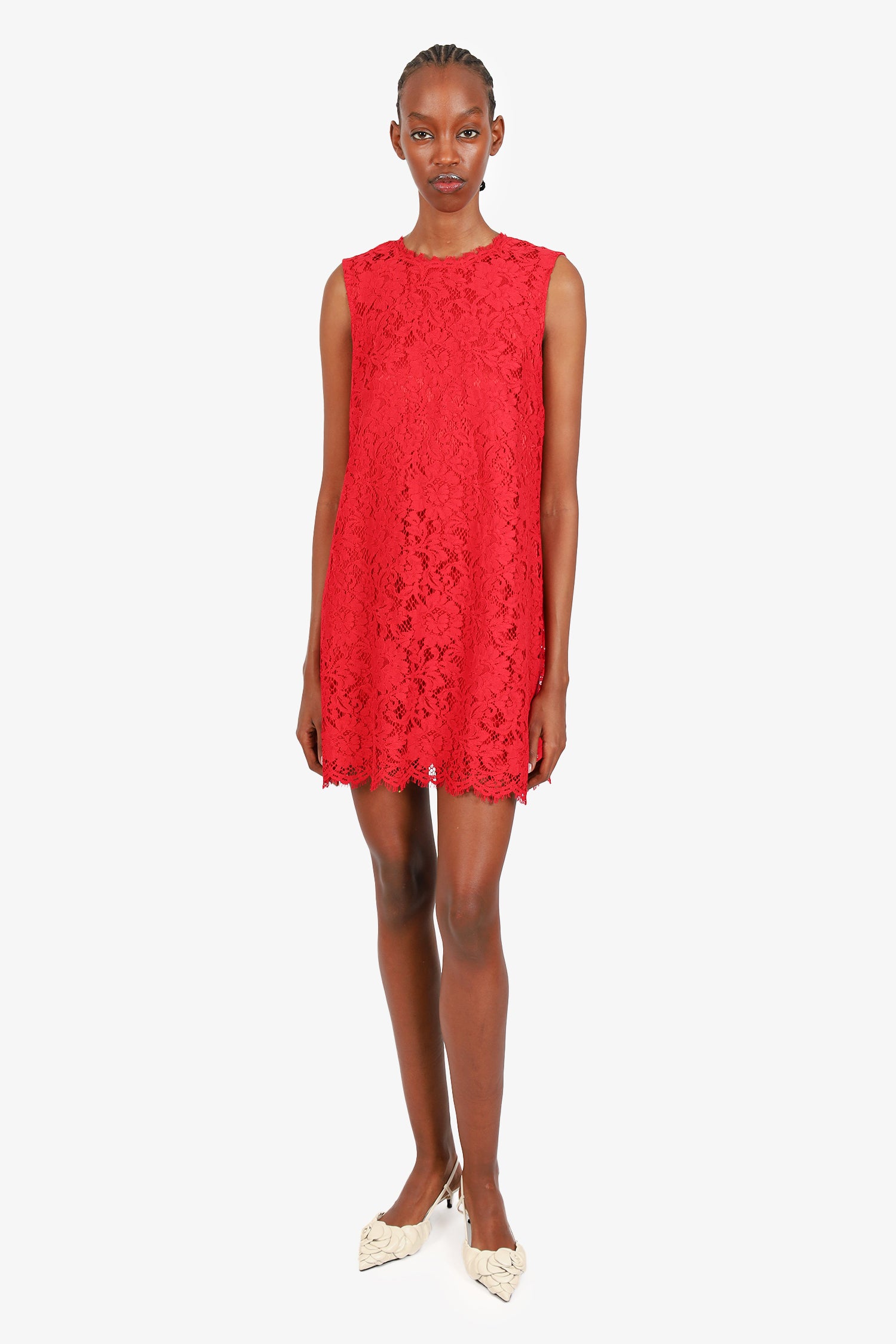 Refresh availabilityDolce & Gabbana Red Lace Sleeveless Dress. Rear zip closure. Round neckline. Lined. Raw hem. Tonal stitching.