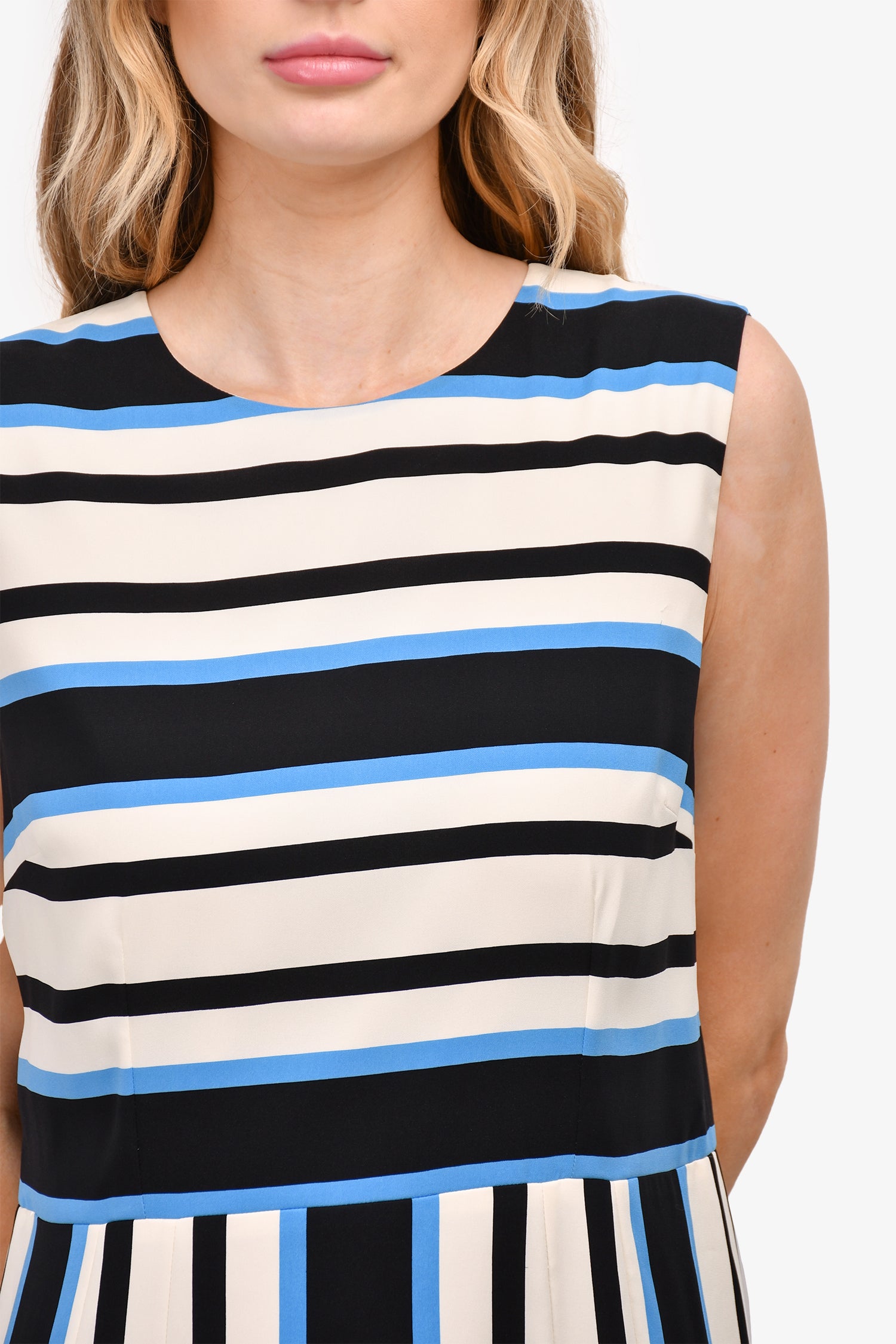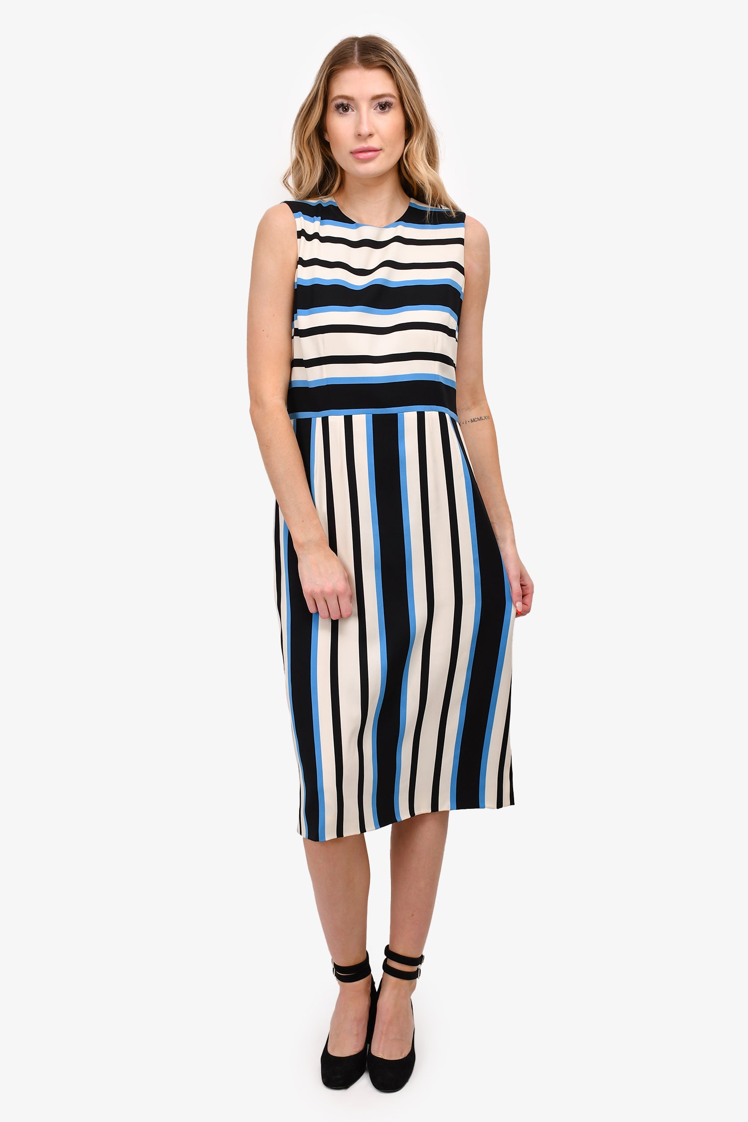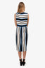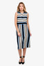 Refresh availabilityDolce & Gabbana White/Black/Blue Striped Silk Sleeveless Midi Dress. Rear zip up closure. Tonal stitching.