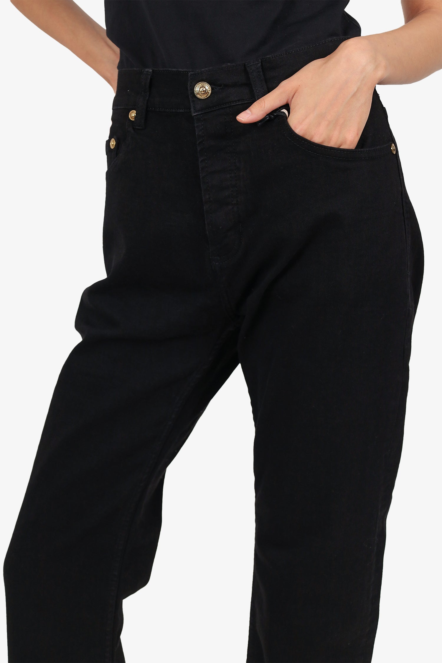 Refresh availabilityVersace Jeans Couture Black Jeans. Slip-on. Front zip with button closure. Waistband belt loops. 5 exterior pockets; 2 front side slip and 1 mini compartment, 2 rear slip. Gold-tone hardware. Tonal stitching.