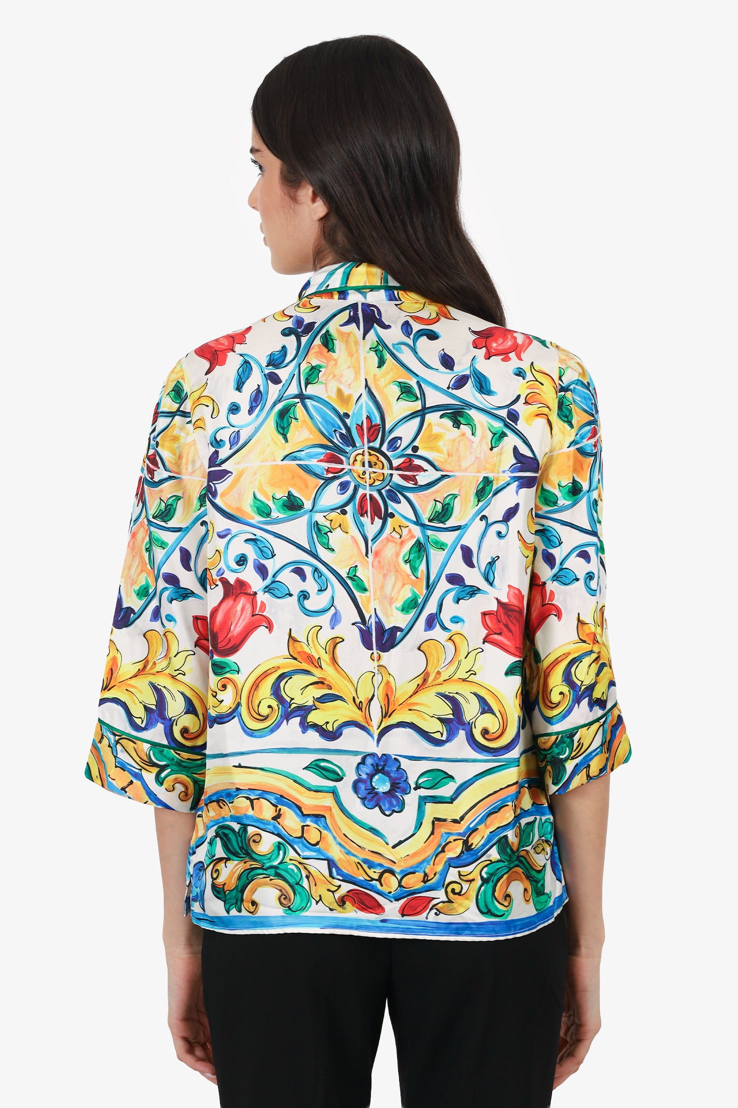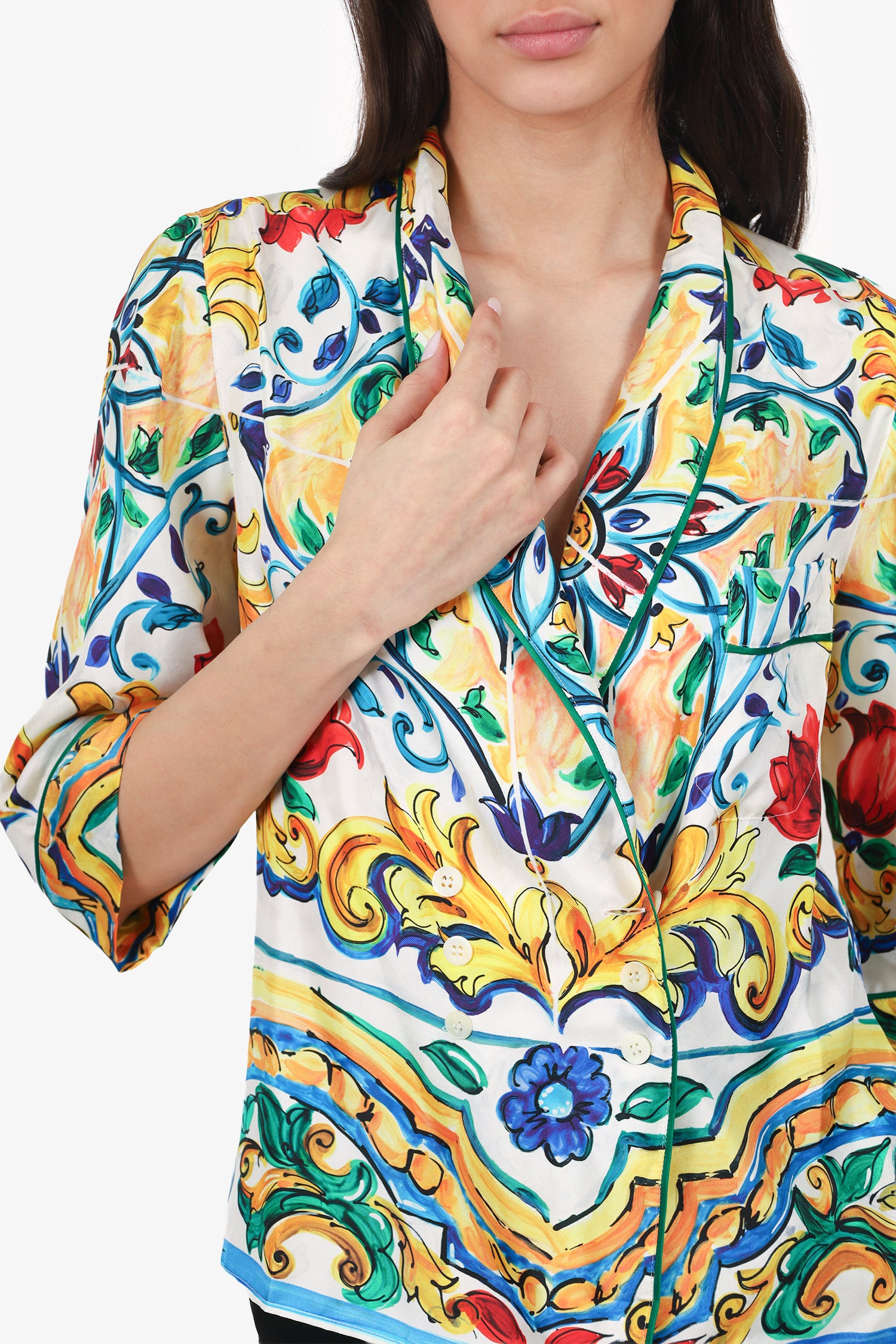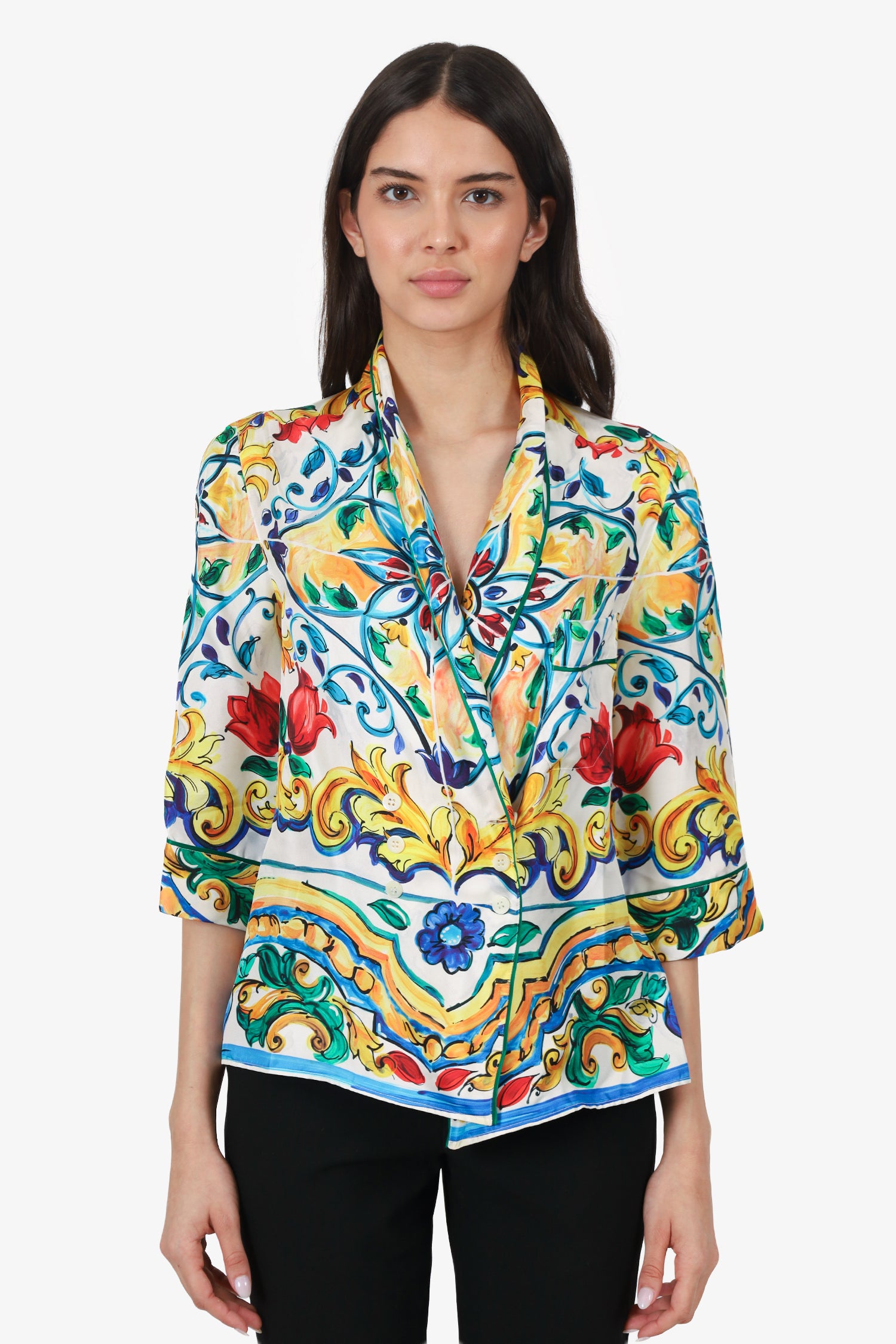 Refresh availabilityDolce & Gabbana White/Yellow Silk Majolica Print Double Breasted Short Sleeve Blouse. Collared neckline. Front button-up closure. Single exterior chest slip pocket. Tonal stitching.