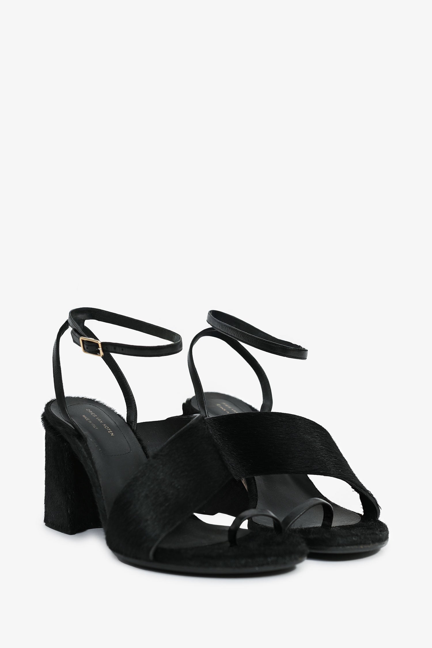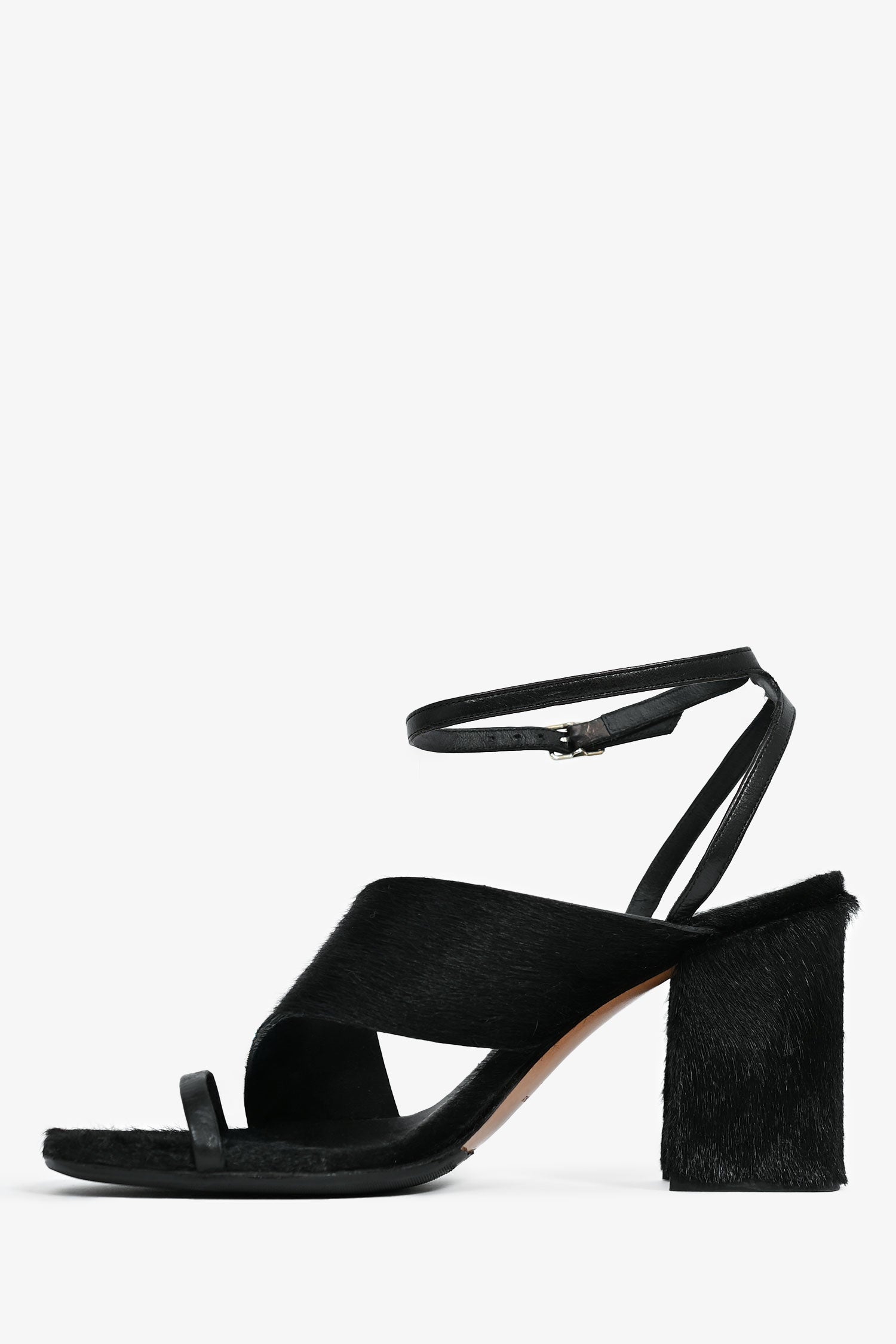 Refresh availabilityDries Van Noten Black Pony Hair Chunky Heeled Sandals. Open-toe with one toe strap. Wrap-around buckle closure. Topy soles. Gold-tone hardware. Tonal stitching.