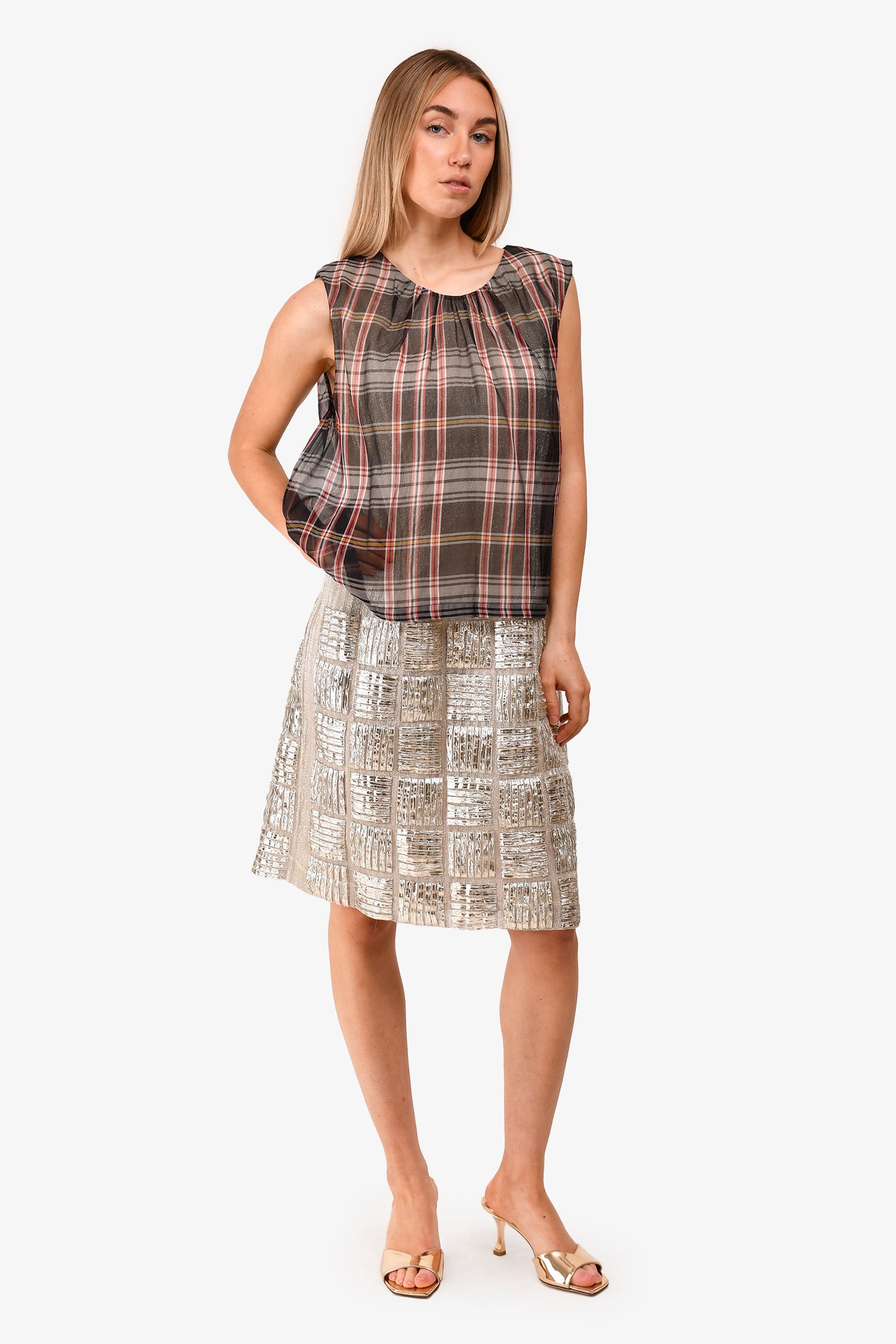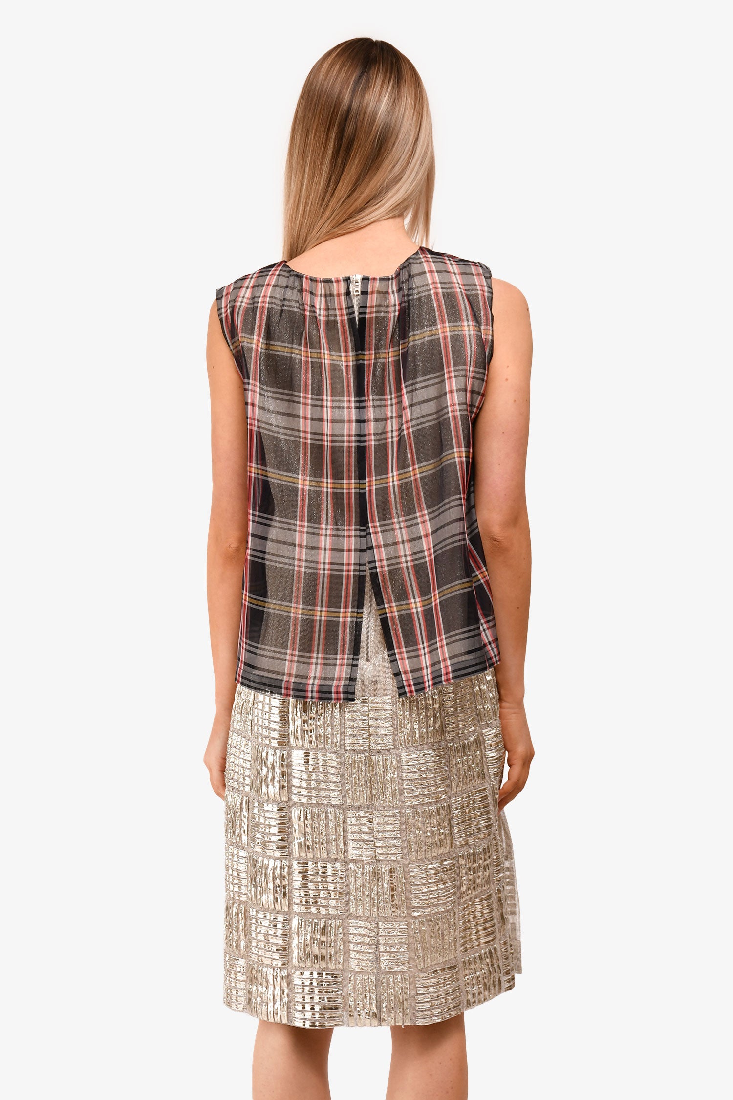 Refresh availabilityDries Van Noten Gold Sleeveless Dress with Black/Red Plaid Overlay. Hidden back zip. Lined. Tonal stitching.