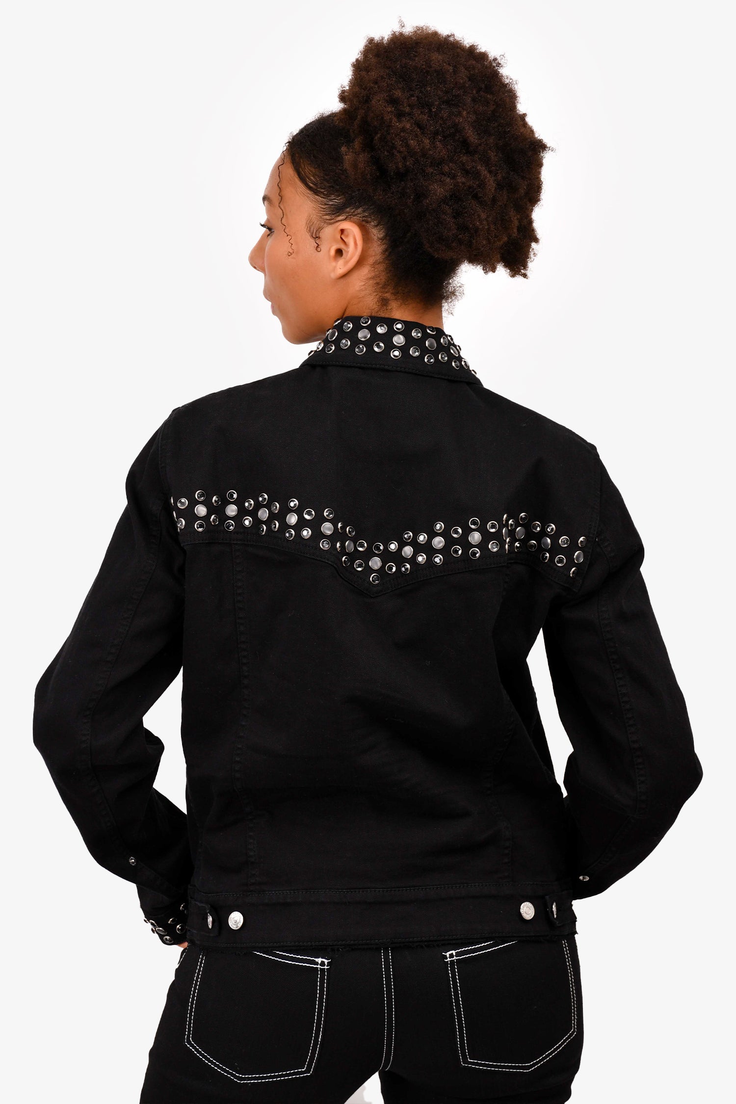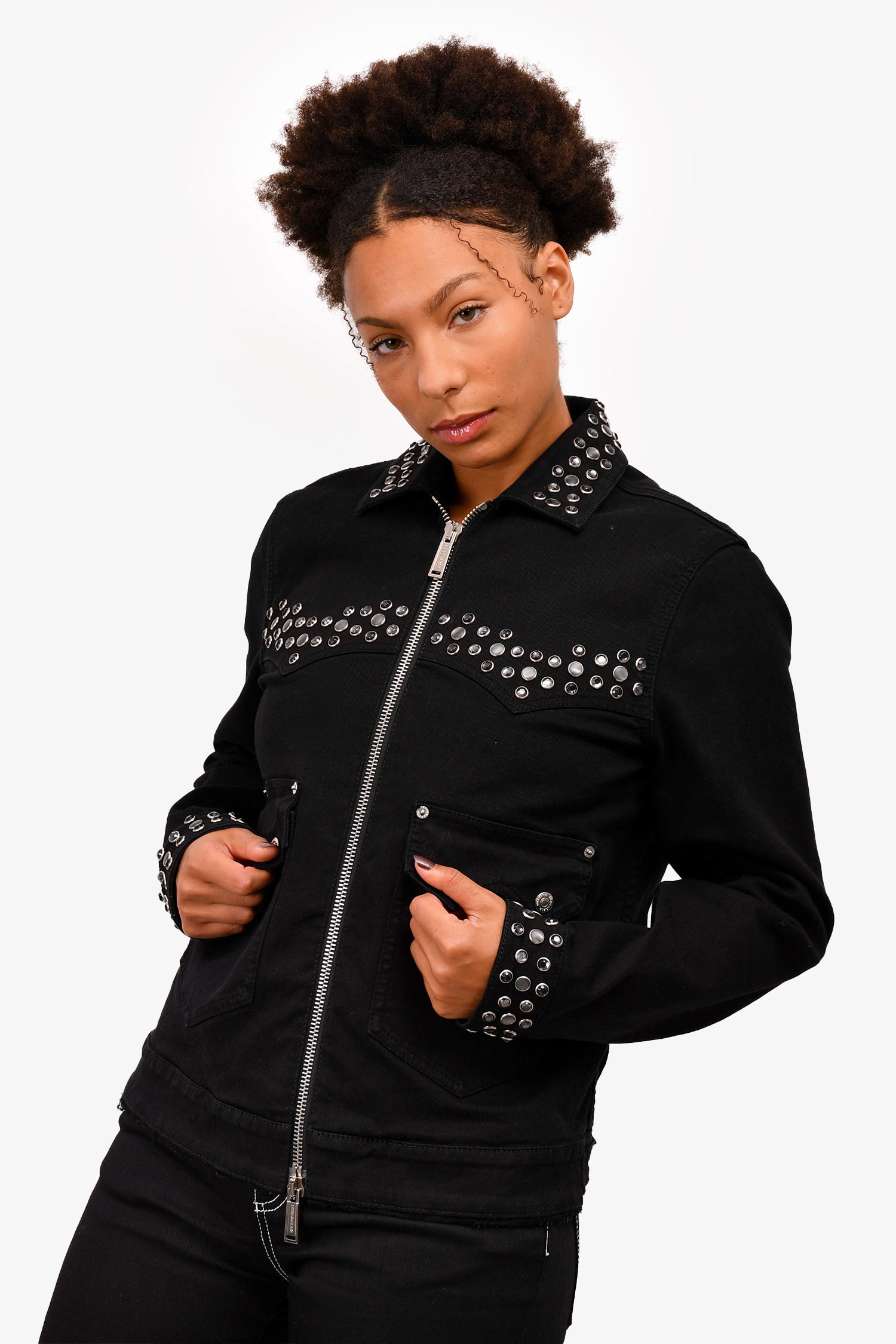 Refresh availabilityDsquared2 Black Denim Crystal Embellished Jacket. Front two-way zip closure. Front pockets with snap-button closures. Unlined.