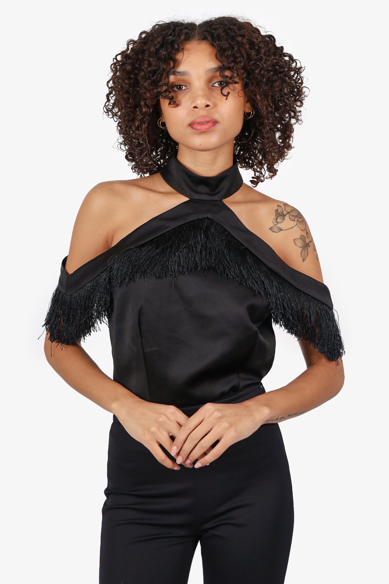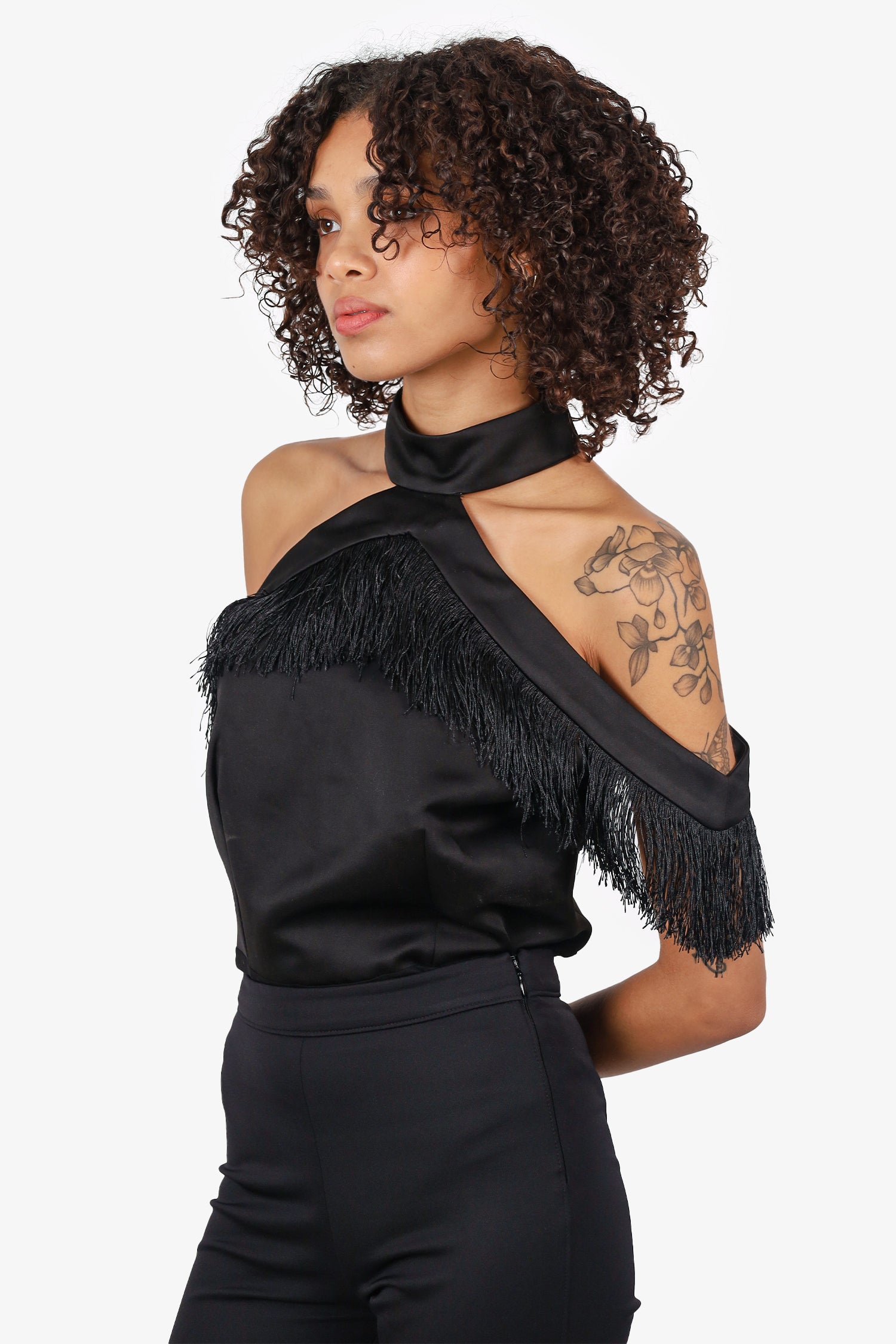 Refresh availabilityEclect Black Fringe Cold Shoulder Bodysuit. Pull-on. High neckline. Rear button-up and zip closure. Cold shoulder with fringe detail. Bodysuit with snap-button closure. Lined interior. Tonal stitching.