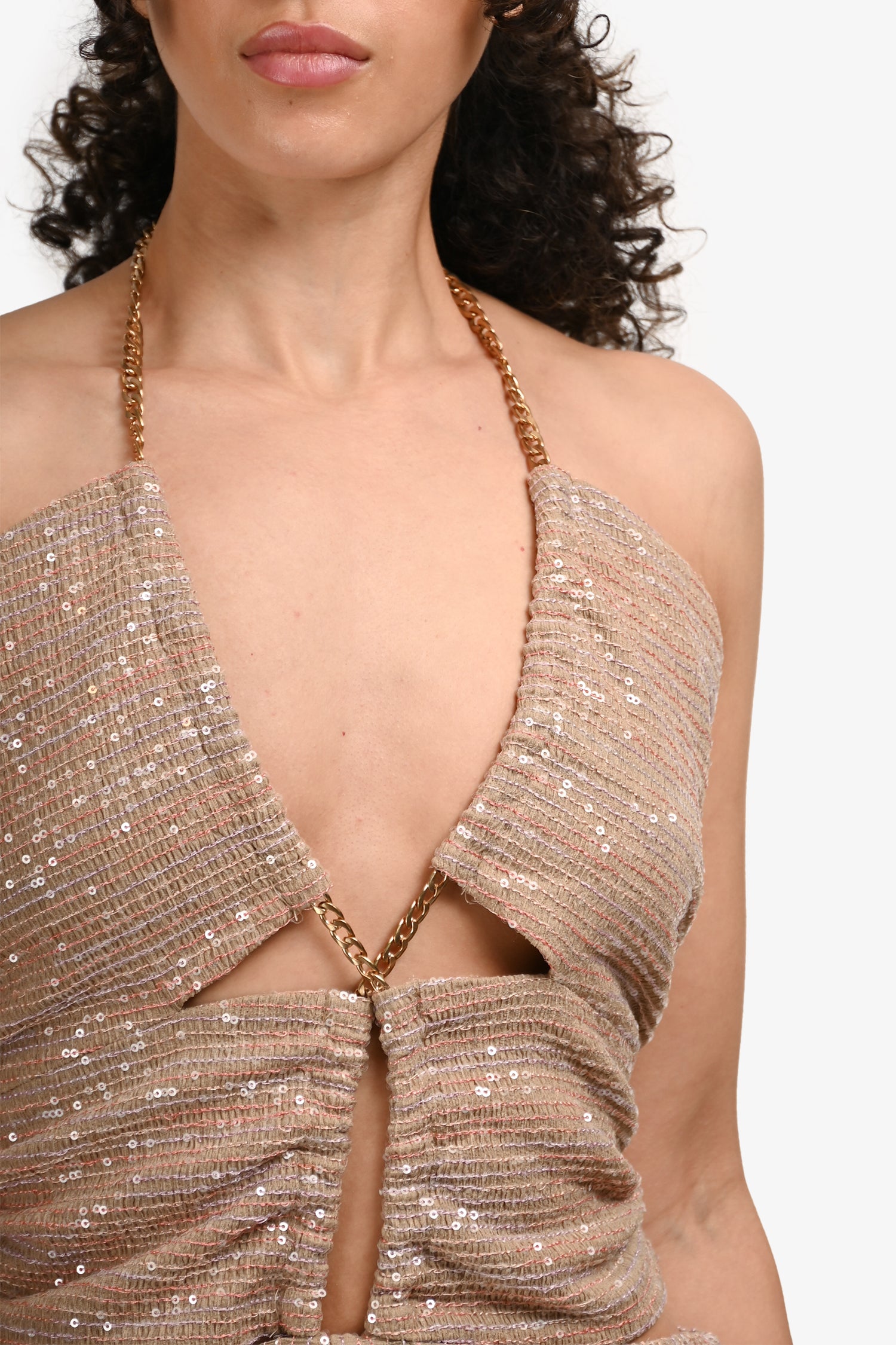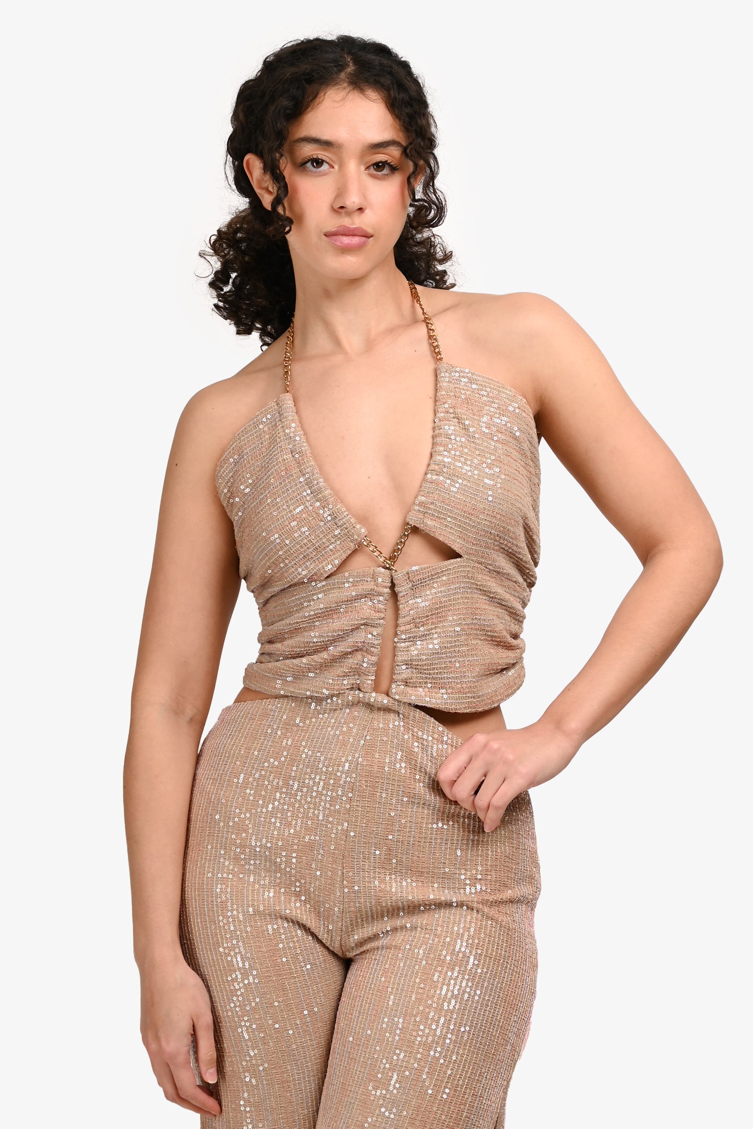 Refresh availabilityEliya The Label Beige Sequin Halterneck ‘Cassie’ Jumpsuit. Slip-on. Halterneck with a chain link. Side zip closure with clasp. Side slit. Lined interior. Gold-tone hardware. Tonal stitching