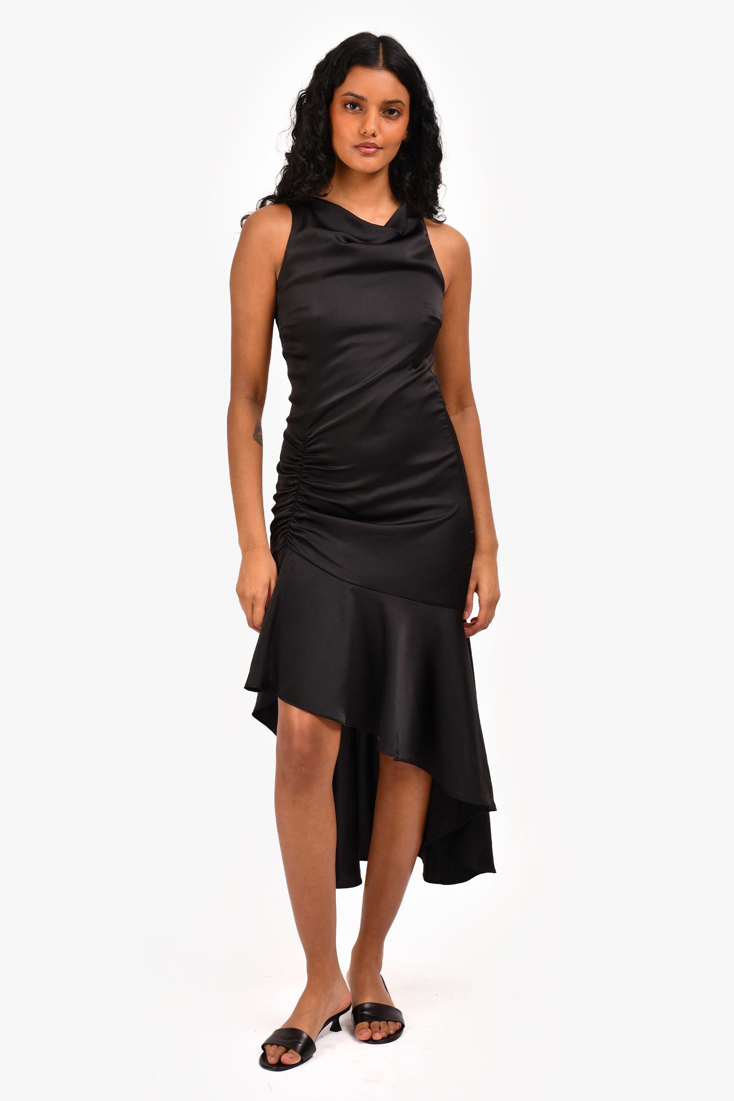Refresh availabilityElliatt Black Silk 'Ambience' Dress. Rear zip-up closure with hook and loop. Sleeveless. Side ruching. Asymmetrical hemline. Lined. Tonal stitching.