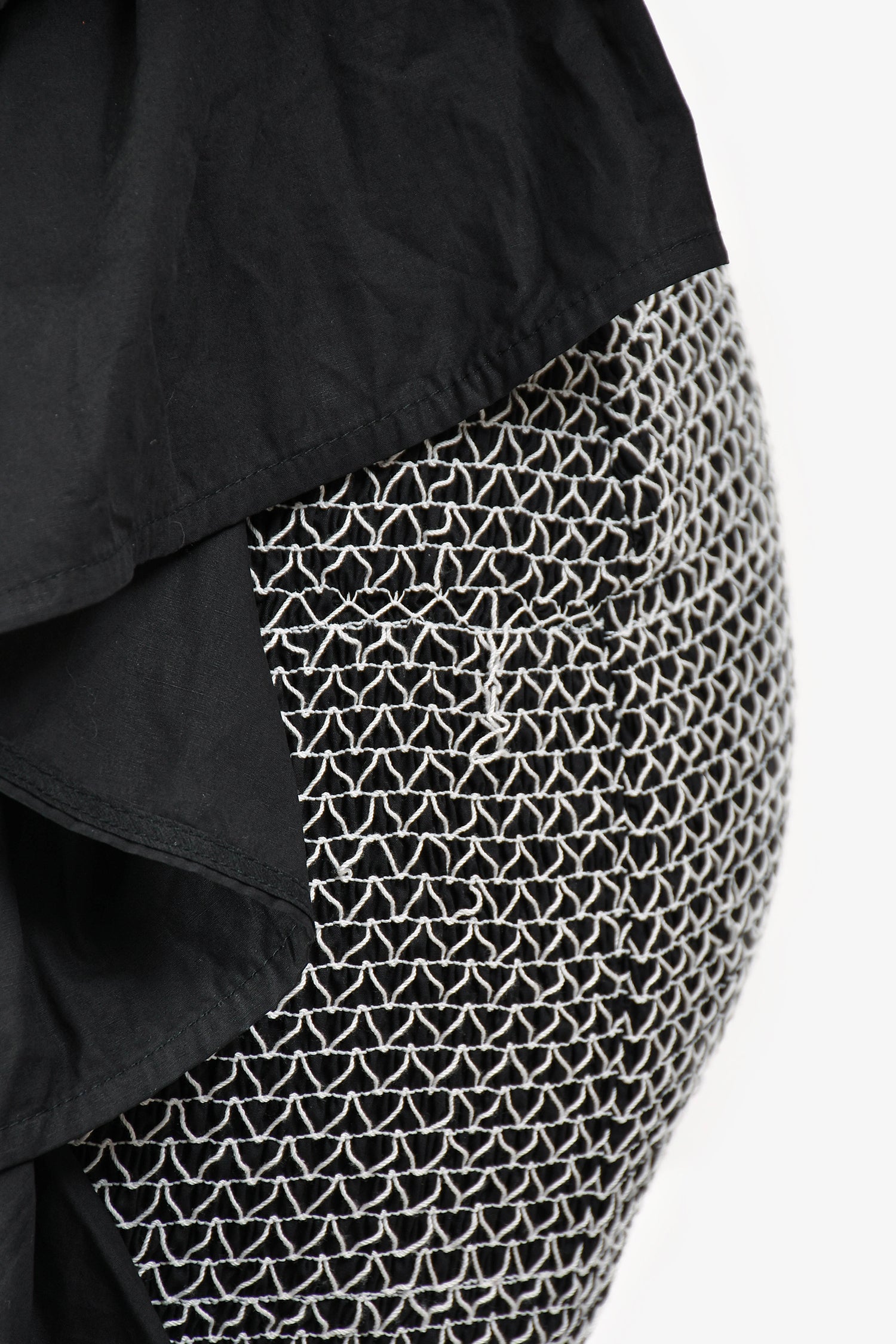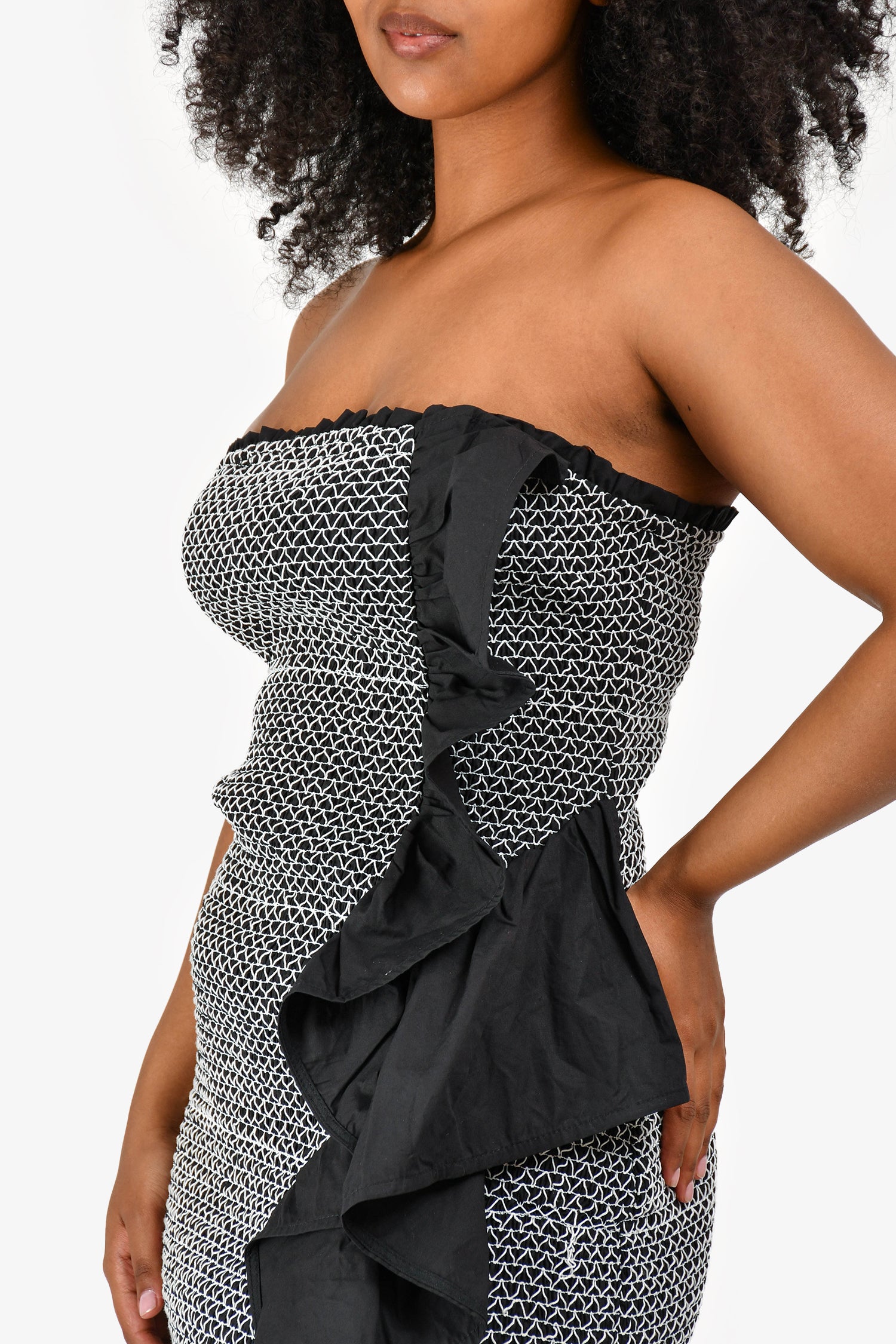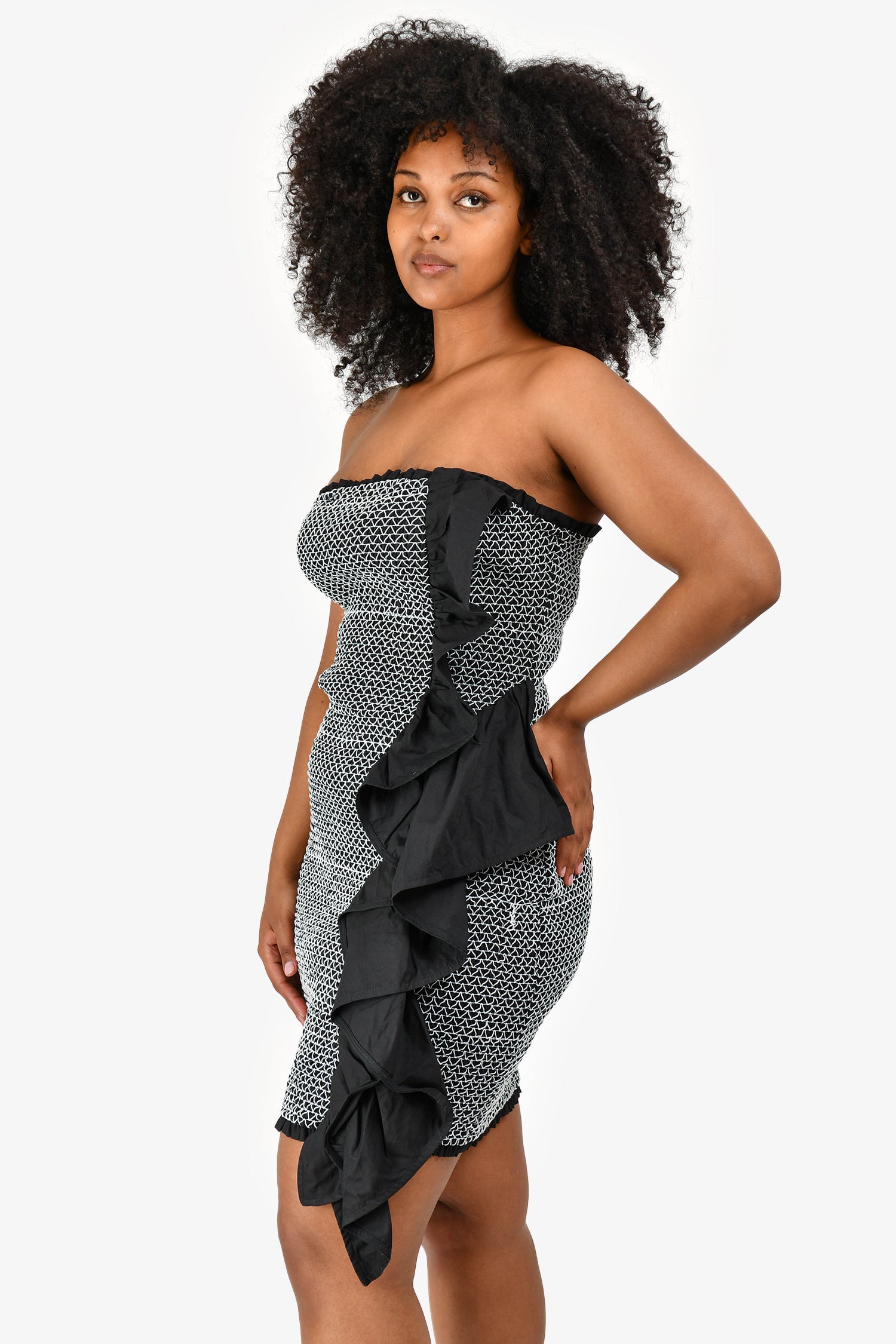 Refresh availabilityElliatt Black & White 'Clara' Mini Dress. Slip-on style. Elasticized throughout. Side ruffle. Ruffled hemline. Unlined. Tonal and contrast stitching.