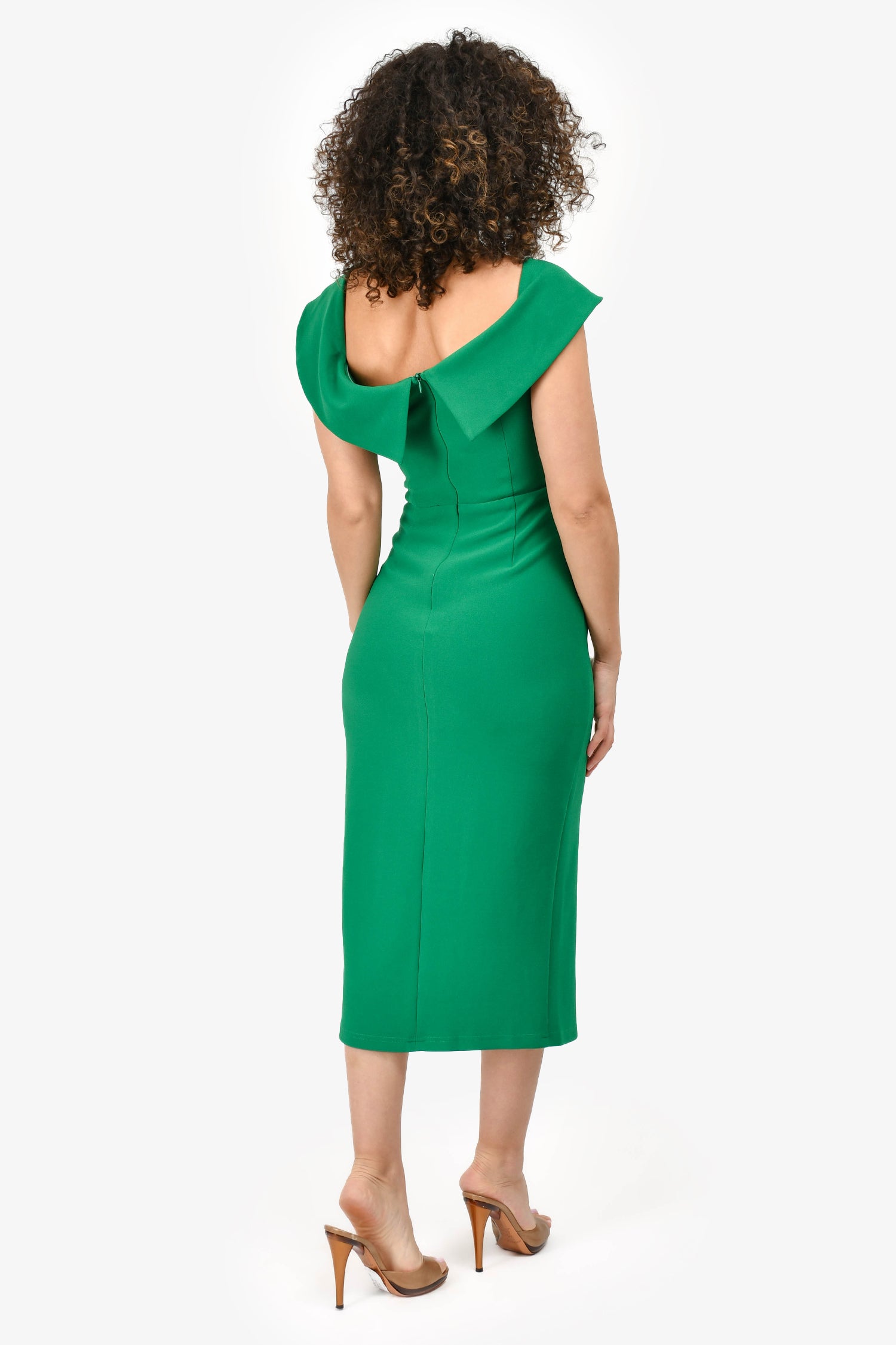 Refresh availabilityElliatt Green 'Anti' Midi Dress with Slit. Rear zip-up closure. Off the shoulder sleeves. Left side slit. Unlined. Tonal stitching.