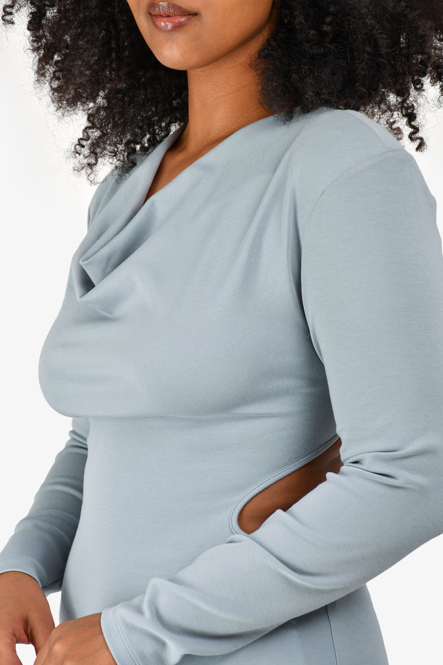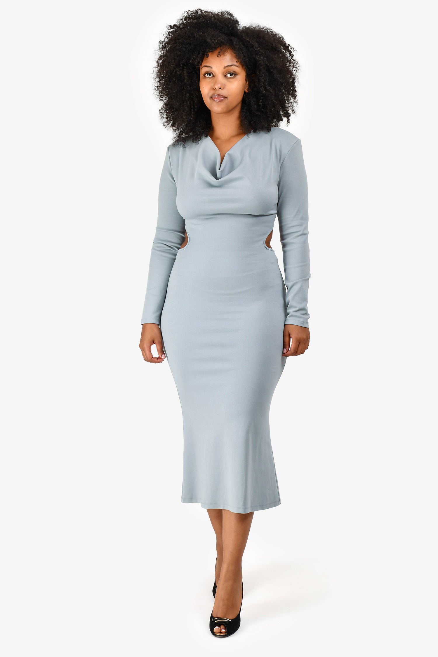 Refresh availabilityElliatt Grey 'Equinox' Long Sleeve Dress. Rear zip-up closure. Rear button closure at neck. Open back with tie-up detail. Cowl neckline. Padded shoulders. Tonal stitching.