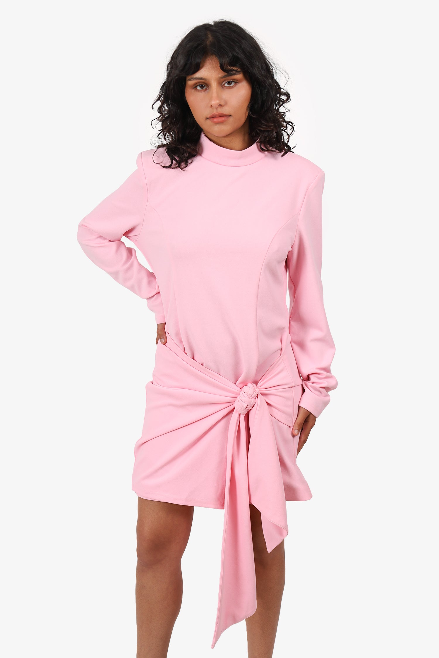 Refresh availabilityElliatt Pink Long Sleeve 'Spritz' Mini Dress. Slip-on. Mock neckline. Rear zip closure. Front knot design. Tonal stitching.