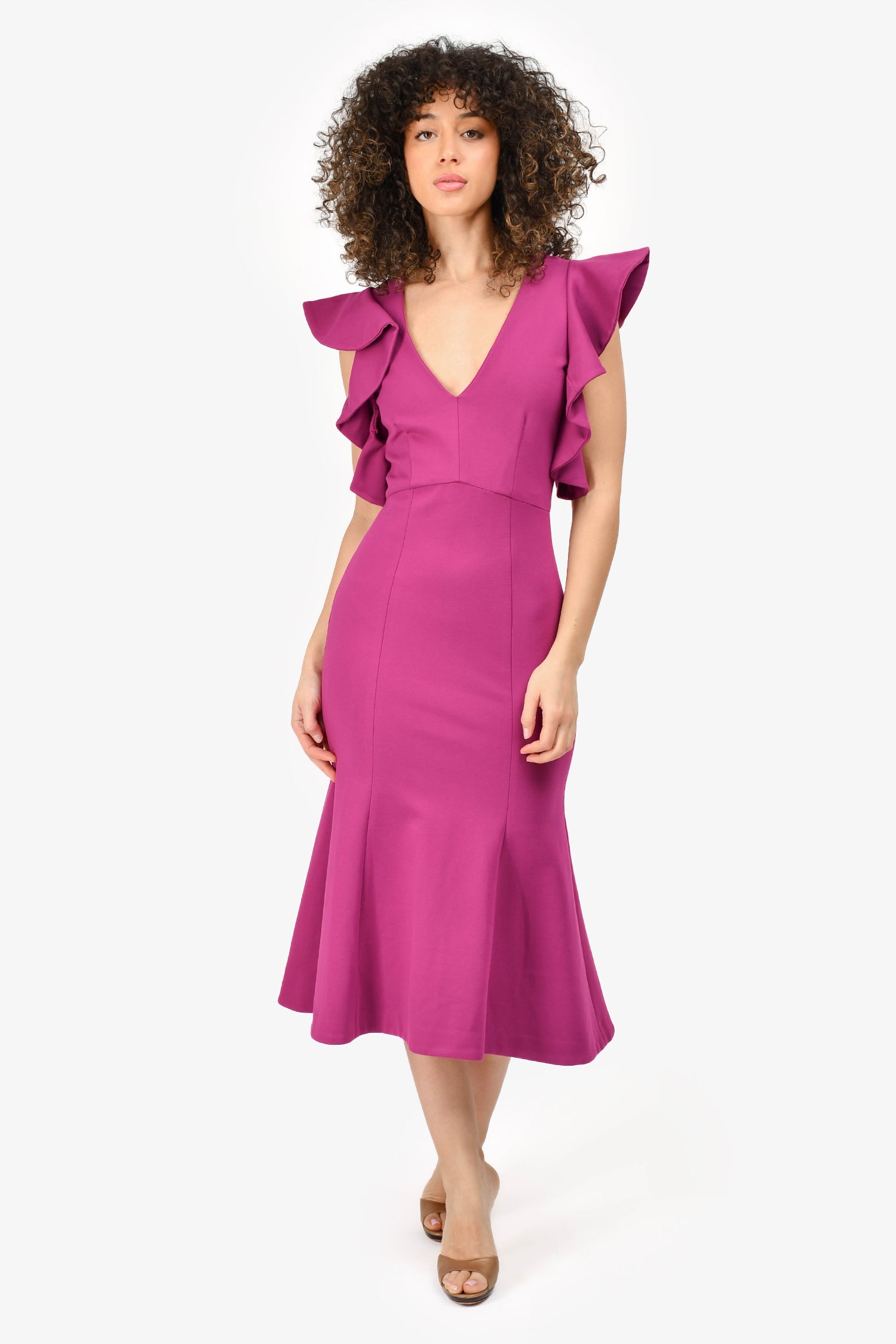 Refresh availabilityElliatt Plum Ruffled Sleeve V-Neck 'Modern' Midi Dress. Rear zip closure with hook and loop. Sleeve cutout detail with layered ruffles. Lined. Tonal stitching.