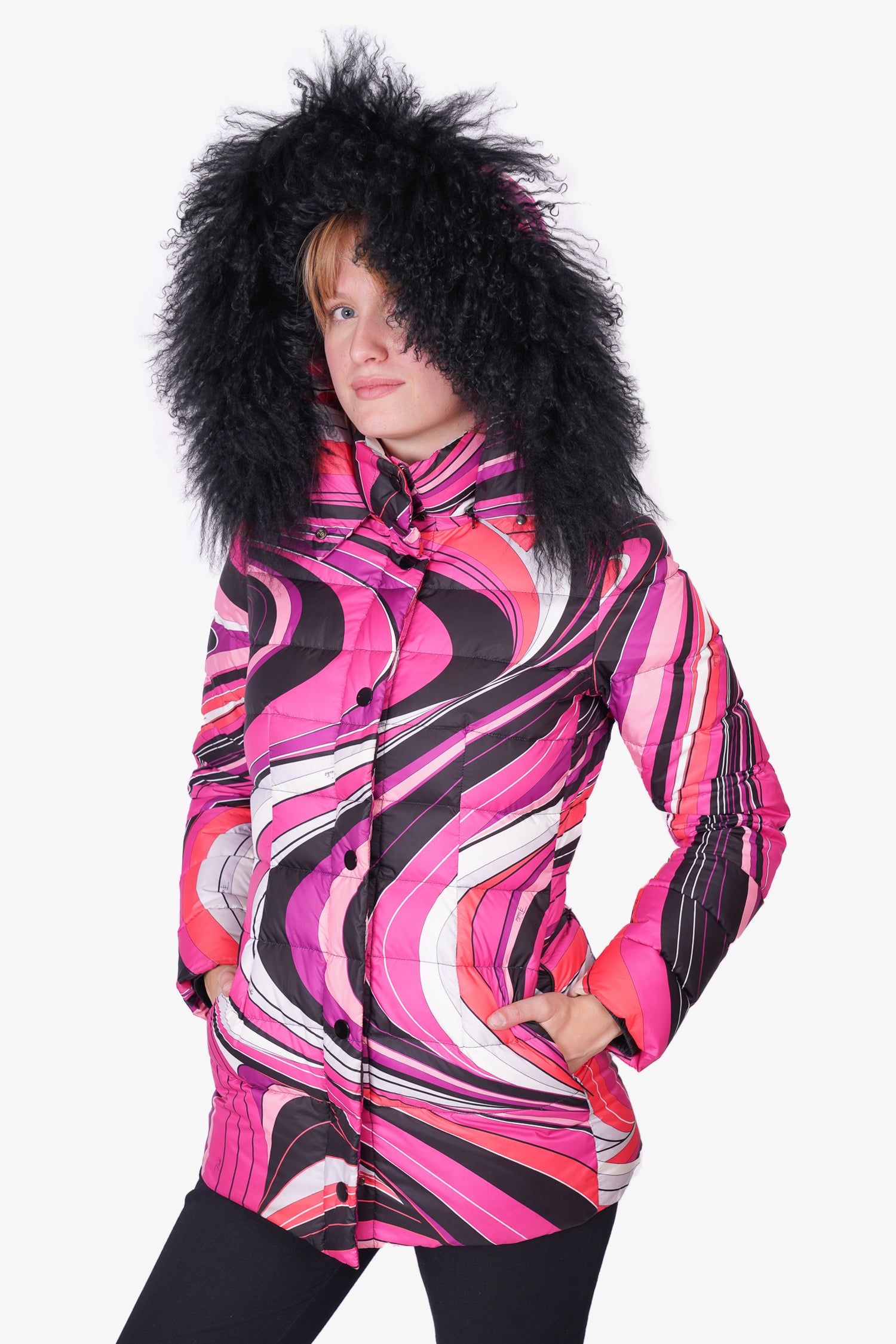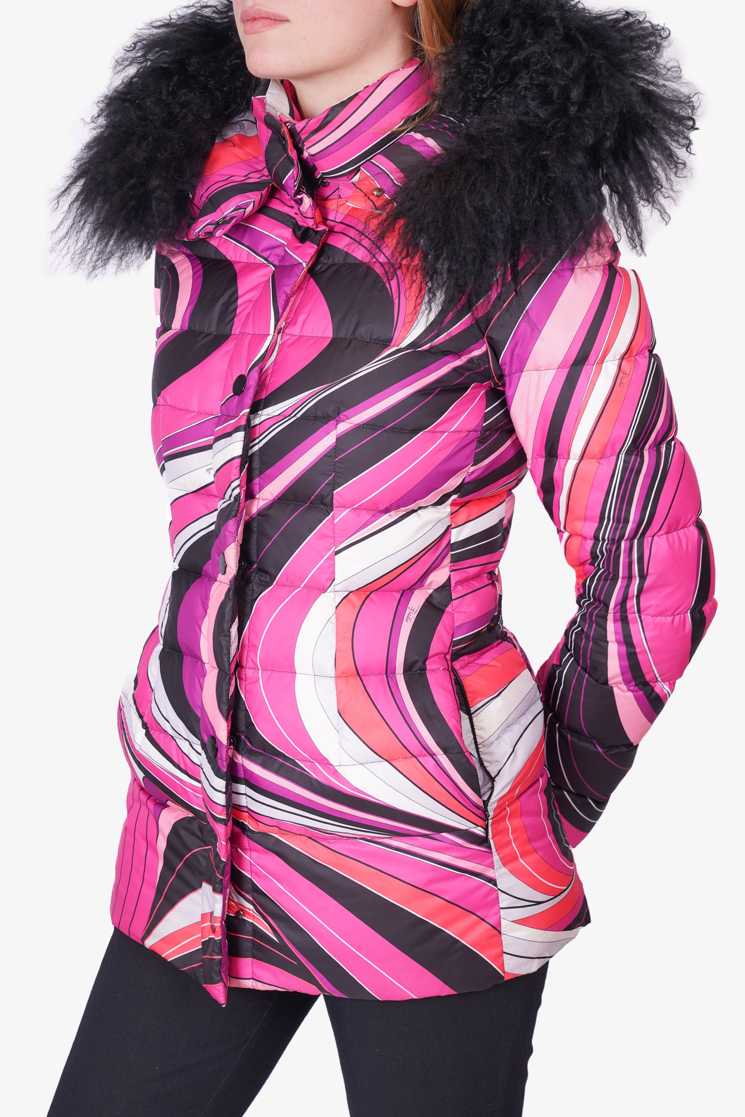 Refresh availabilityEmilio Pucci Pink/Black Patterned Puffer Jacket with Fur. High neck and hooded neckline with removable hood and fur. Front zip and button up closure. 2 front zip up pockets. Waist loop holes. Interior lining. Tonal stitching.