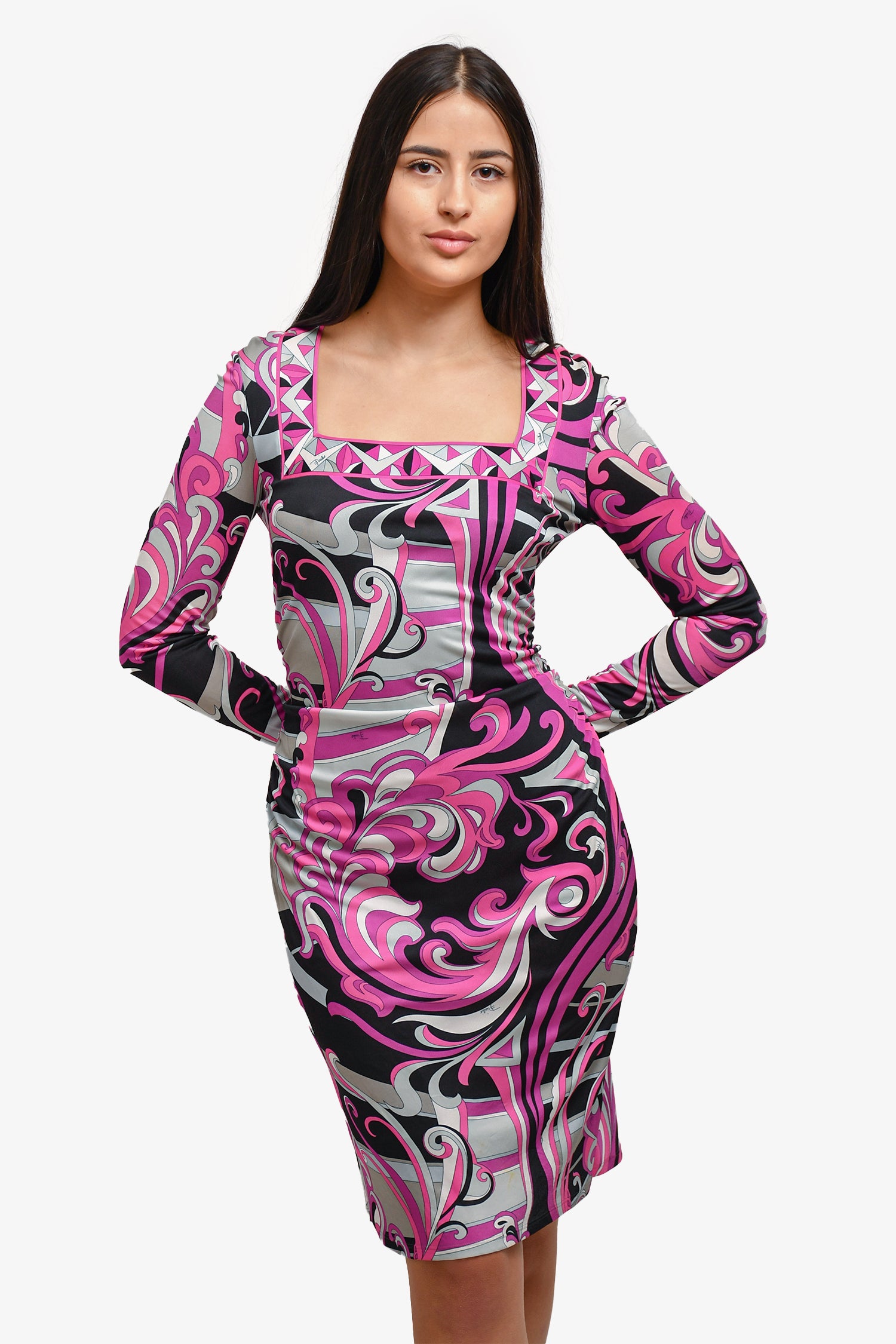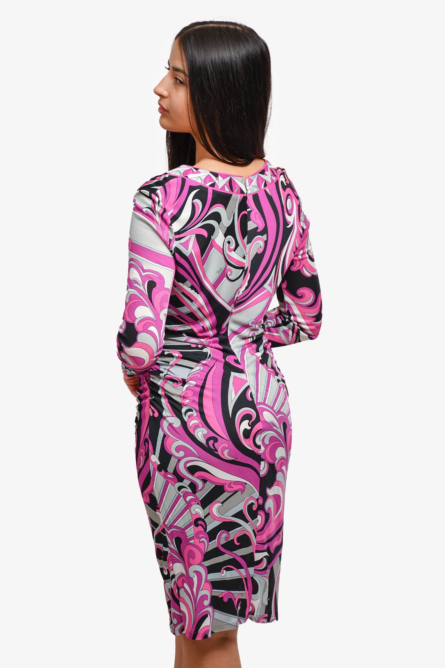 Refresh availabilityEmilio Pucci Purple Printed Ruched Midi Dress. Interior slip lining. Tonal stitching.