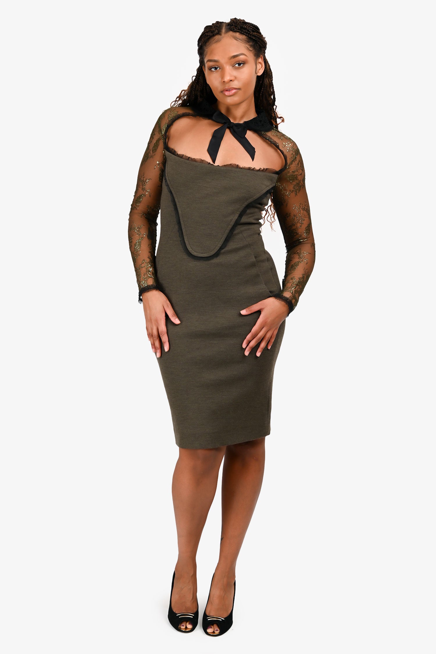 Refresh availabilityEmilio Pucci Wool Lace Collar Sleeve Dress. Slip-on. Square neckline with contrast lace tie collar. Rear zip closure. Cuffs with zipper detail. Unlined. Gold-tone hardware. Tonal stitching.