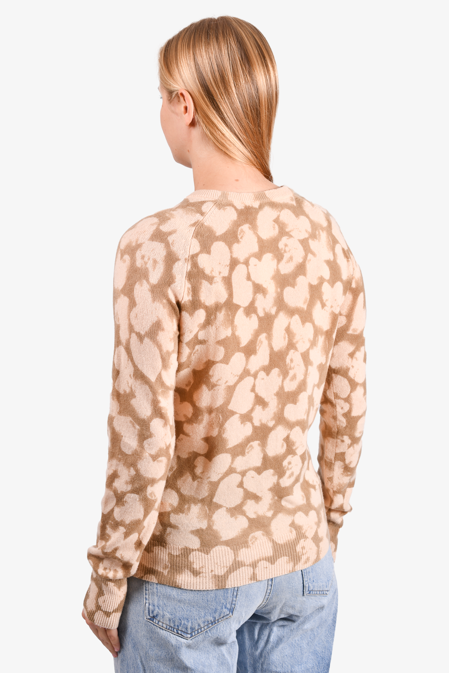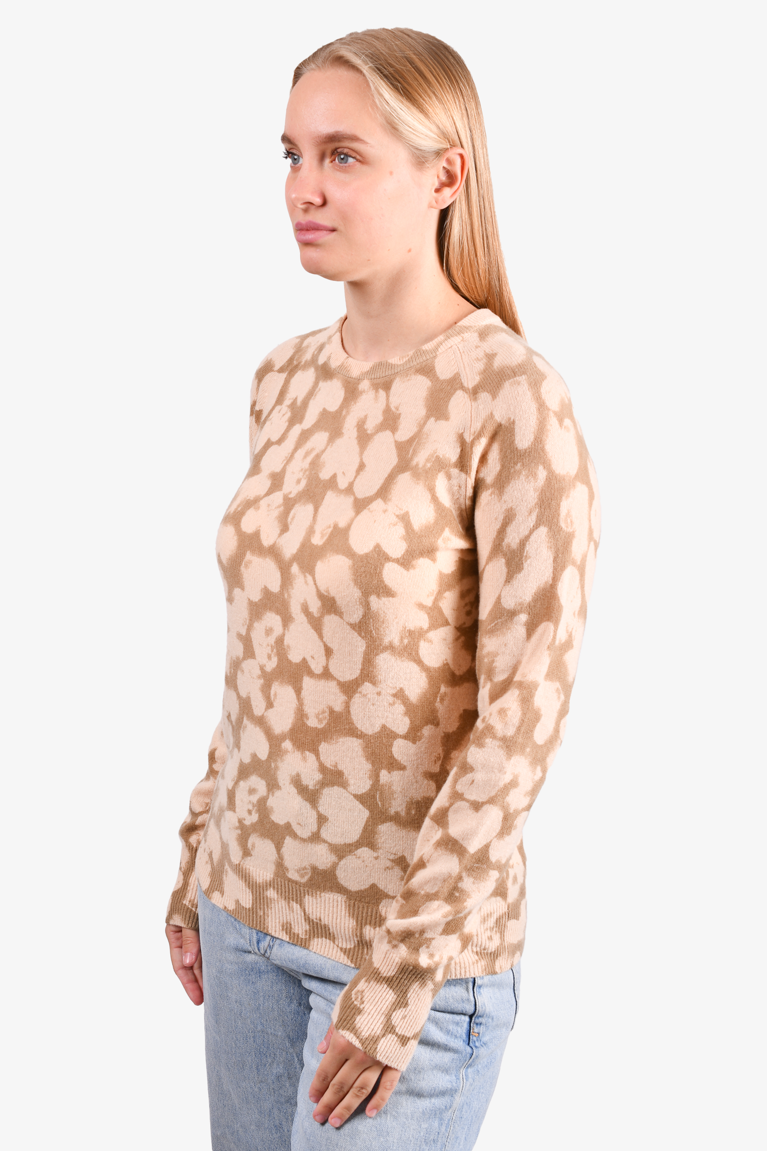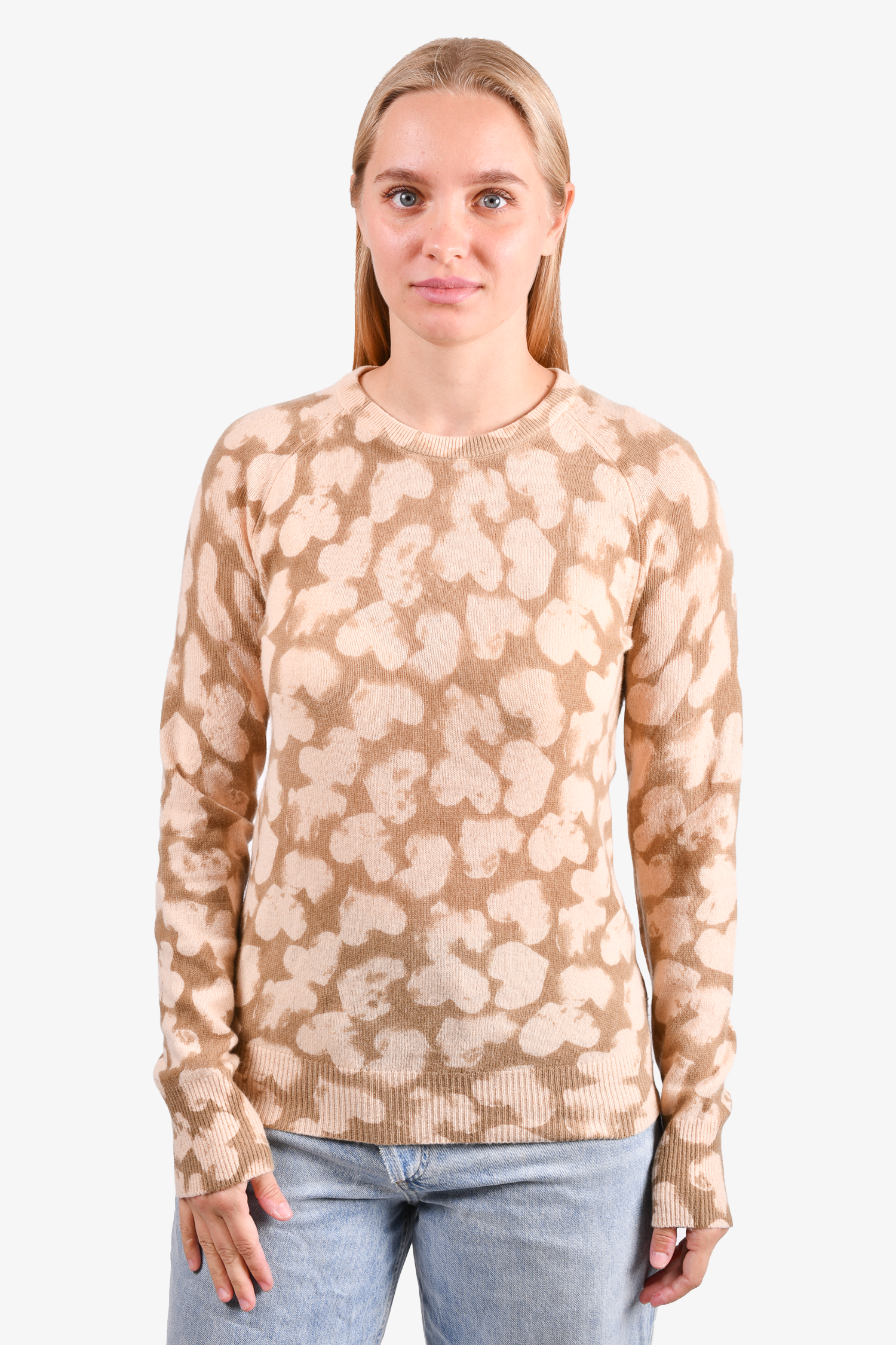 Refresh availabilityEquipment Beige/Taupe Cashmere Heart Printed Sweater. Round neck. Pull-on. Ribbed neck, cuff and hem. Tonal stitching.