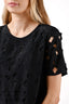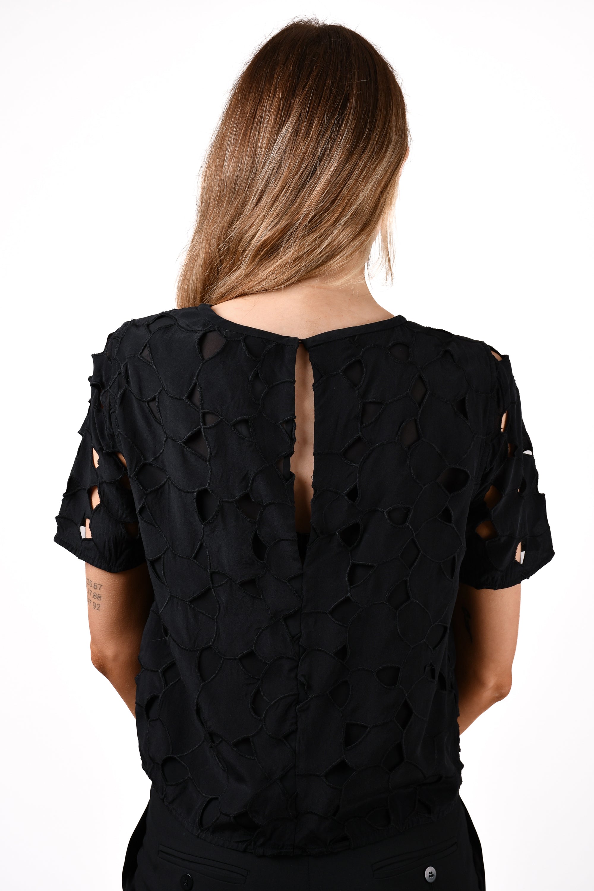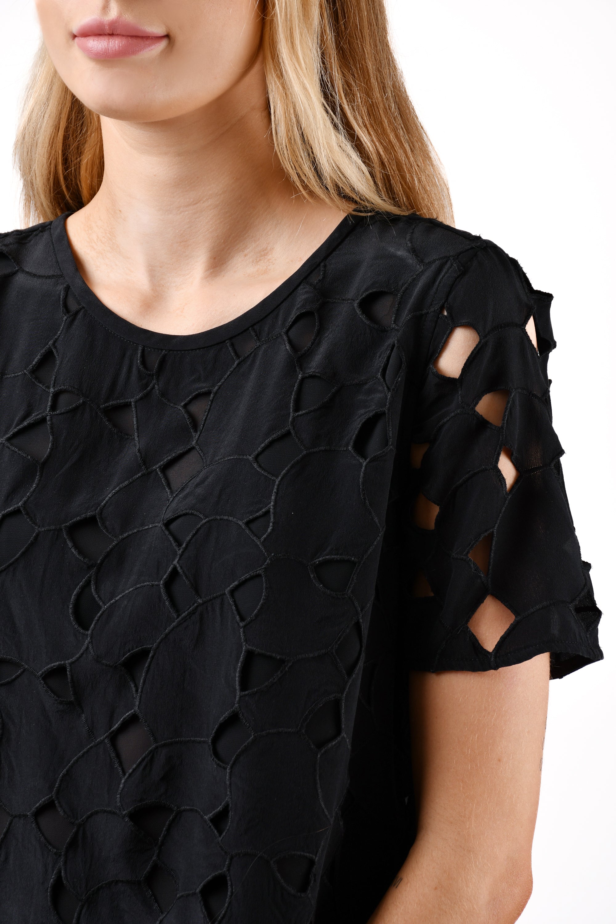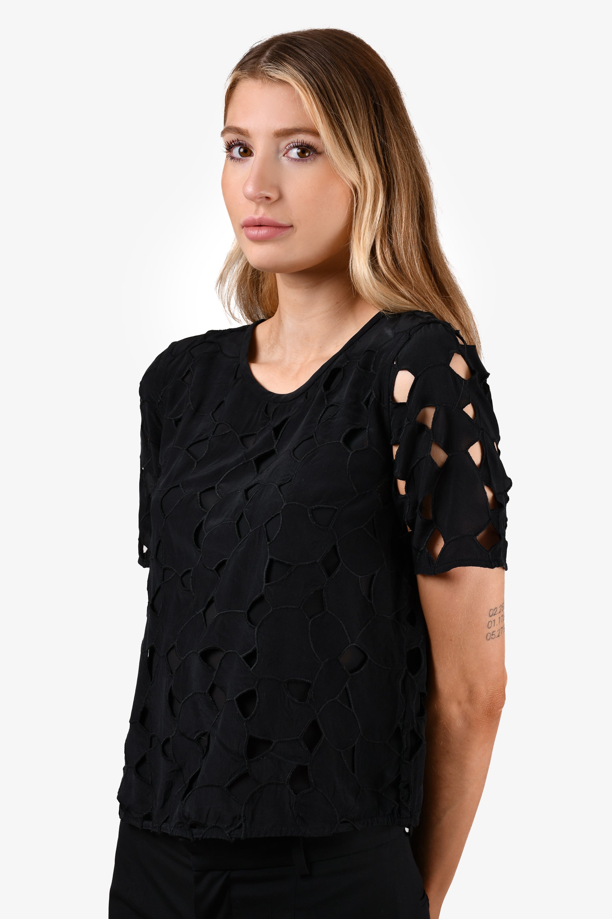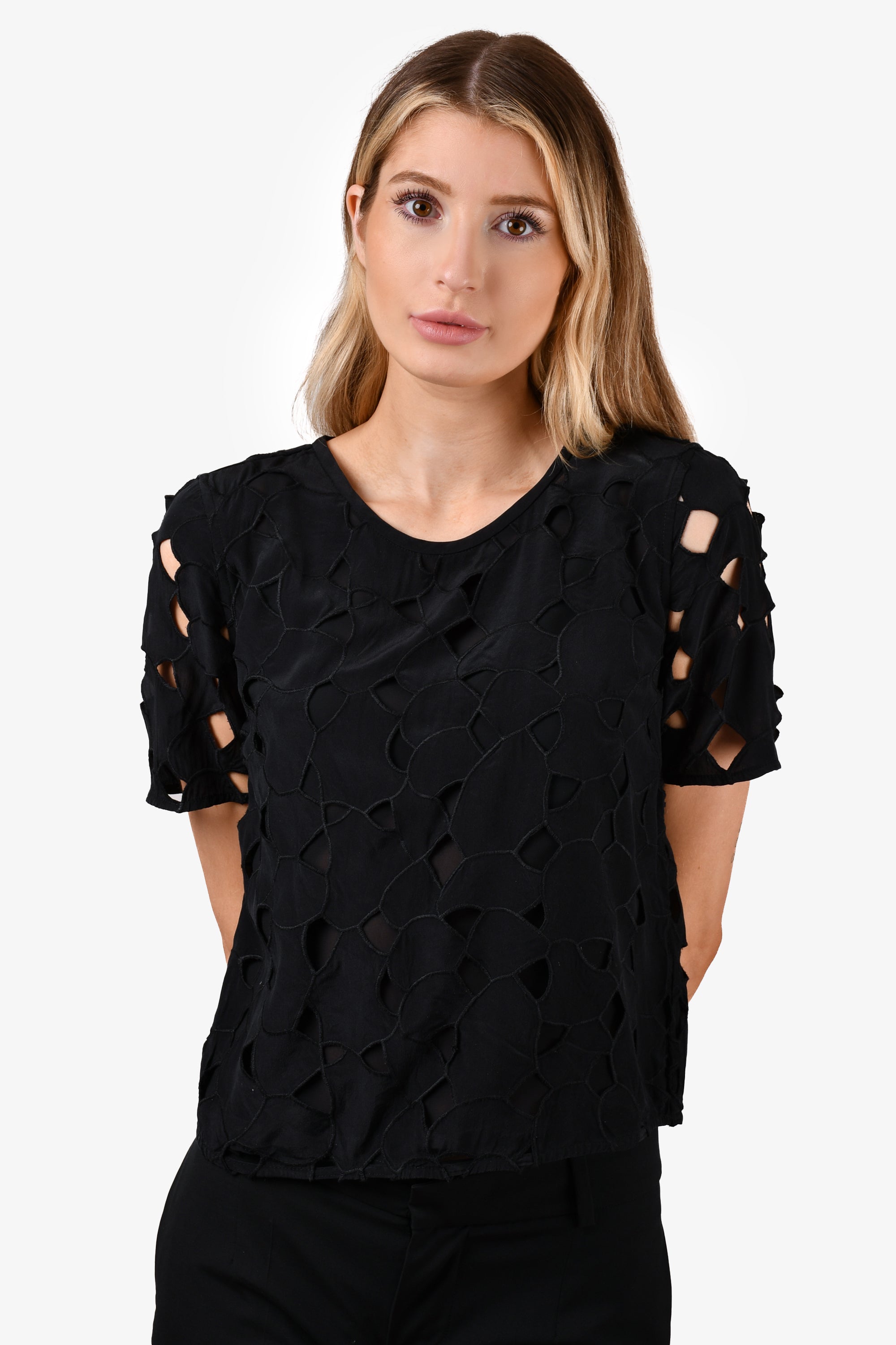 Refresh availabilityEquipment Black Cutout Overlay Top. Short sleeve. Round neckline. Back keyhole with button closure. Tonal stitching.