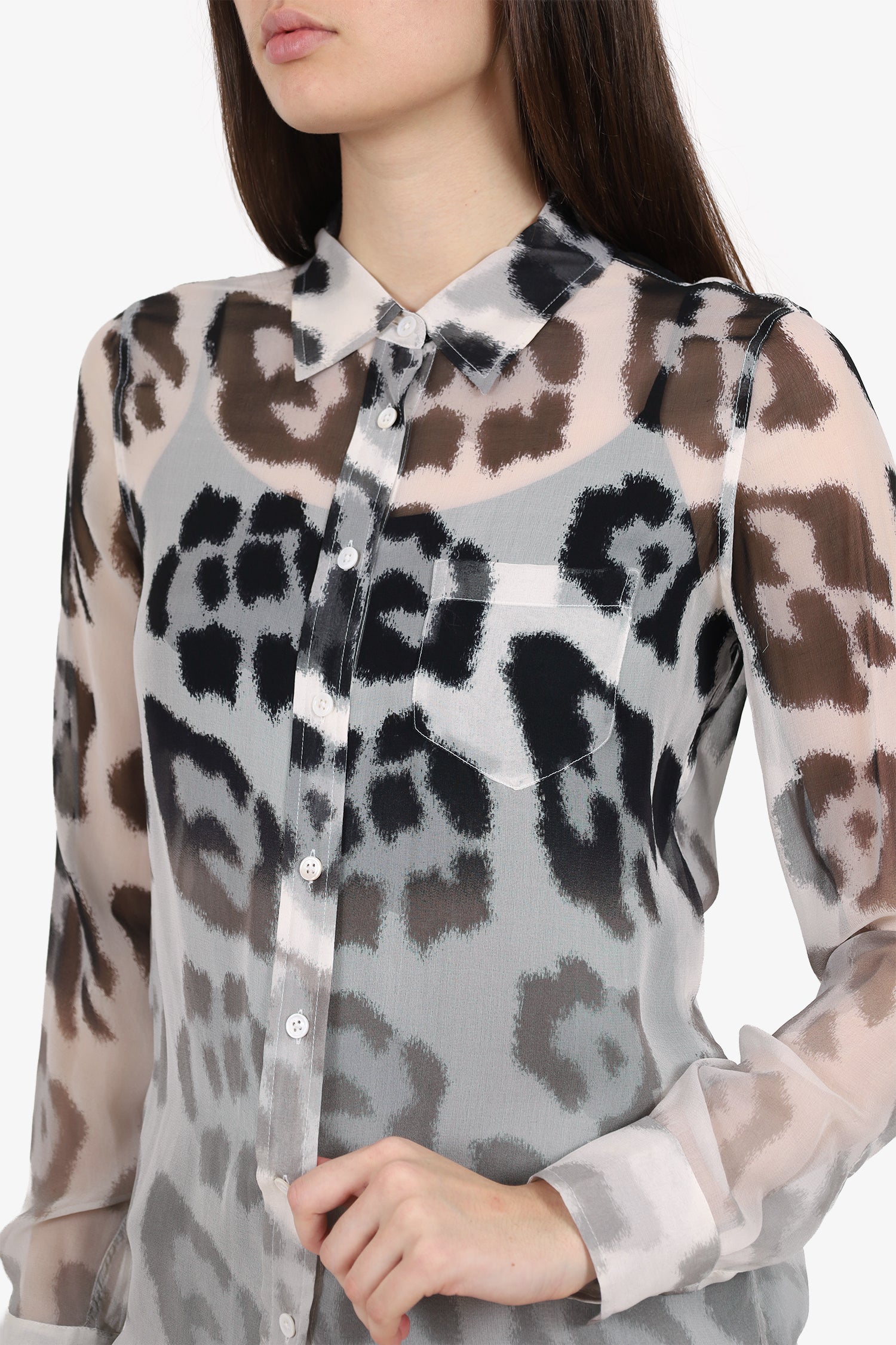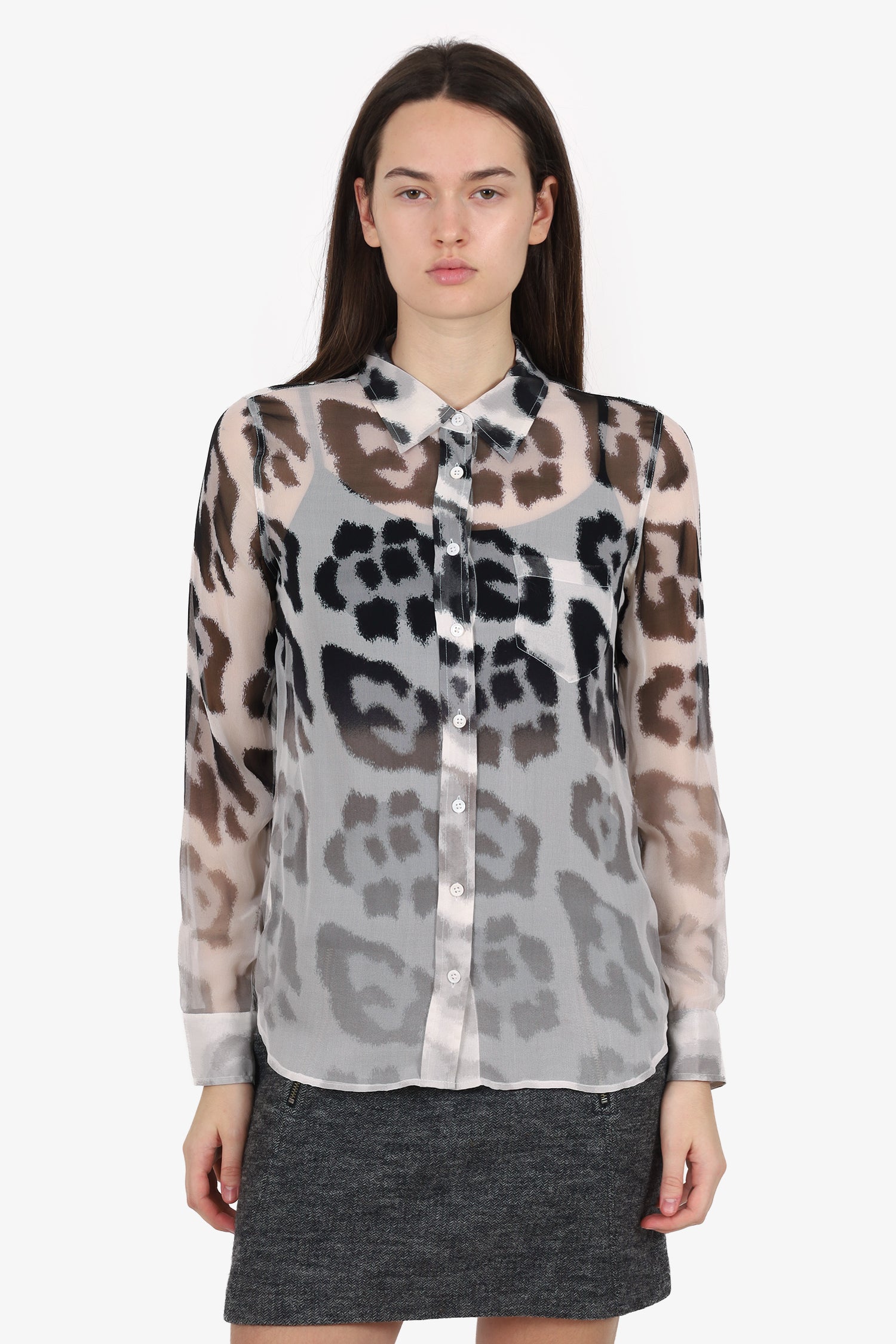 Refresh availabilityEquipment Black/Cream Silk Animal Print Blouse. Pull-on. Collared-neckline. Front button-up closure. Sleeve cuffs with button-up closure. Single front exterior slip pocket. Sheer body. Tonal stitching.