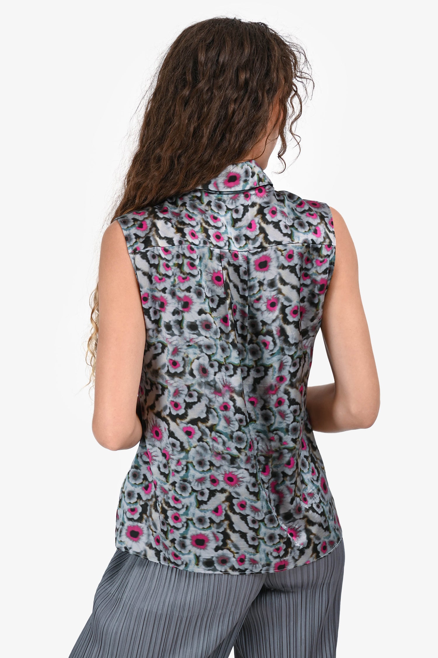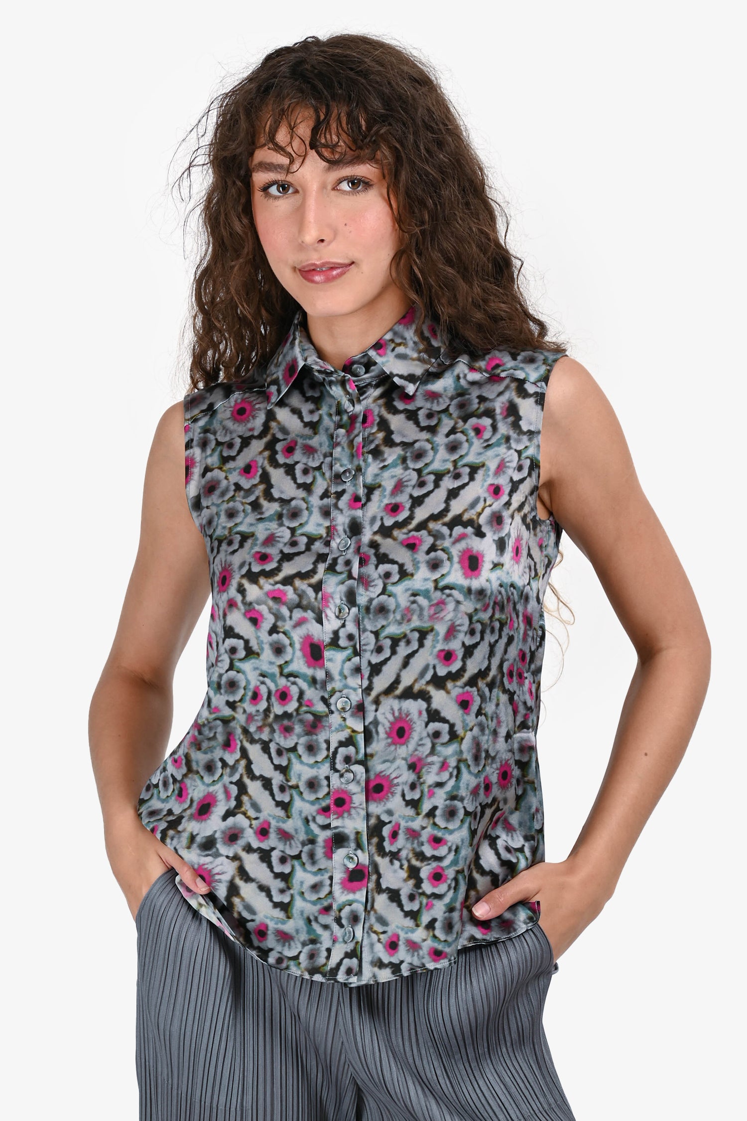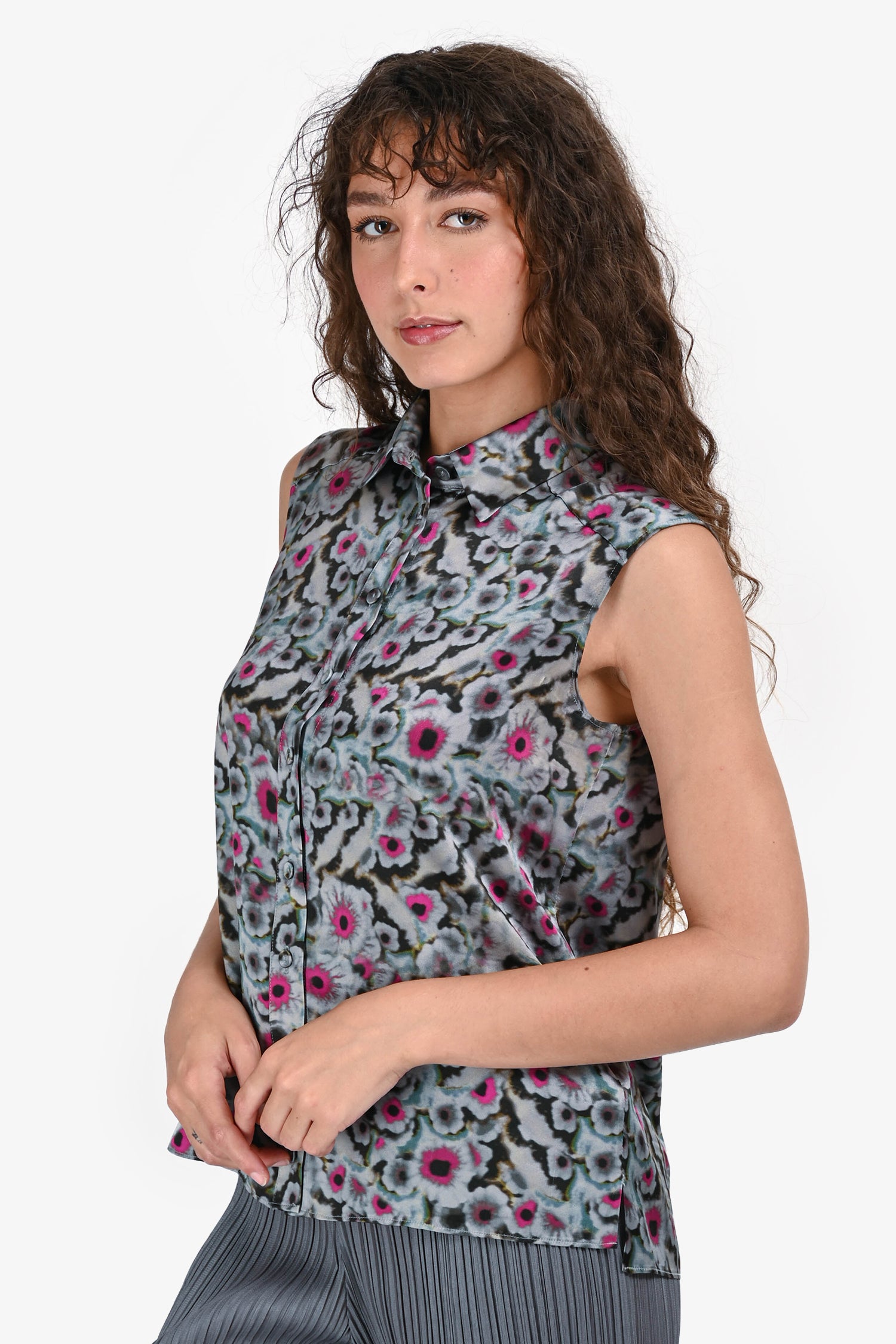 Refresh availabilityErdem Grey/Pink Silk Floral Sleeveless Button Up. Pointed collar. Sleeveless silhouette. Front button closure. Tonal stitching.