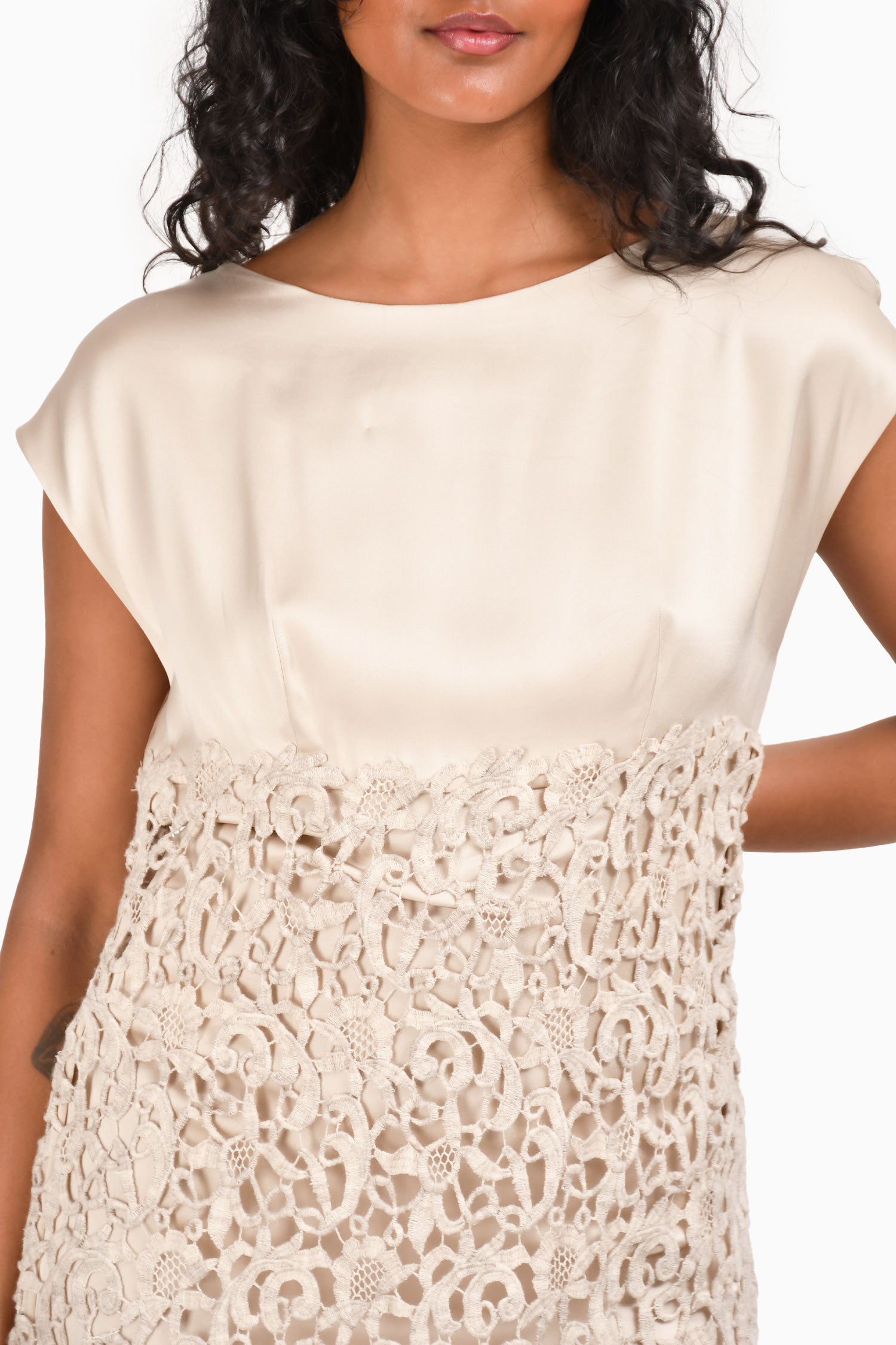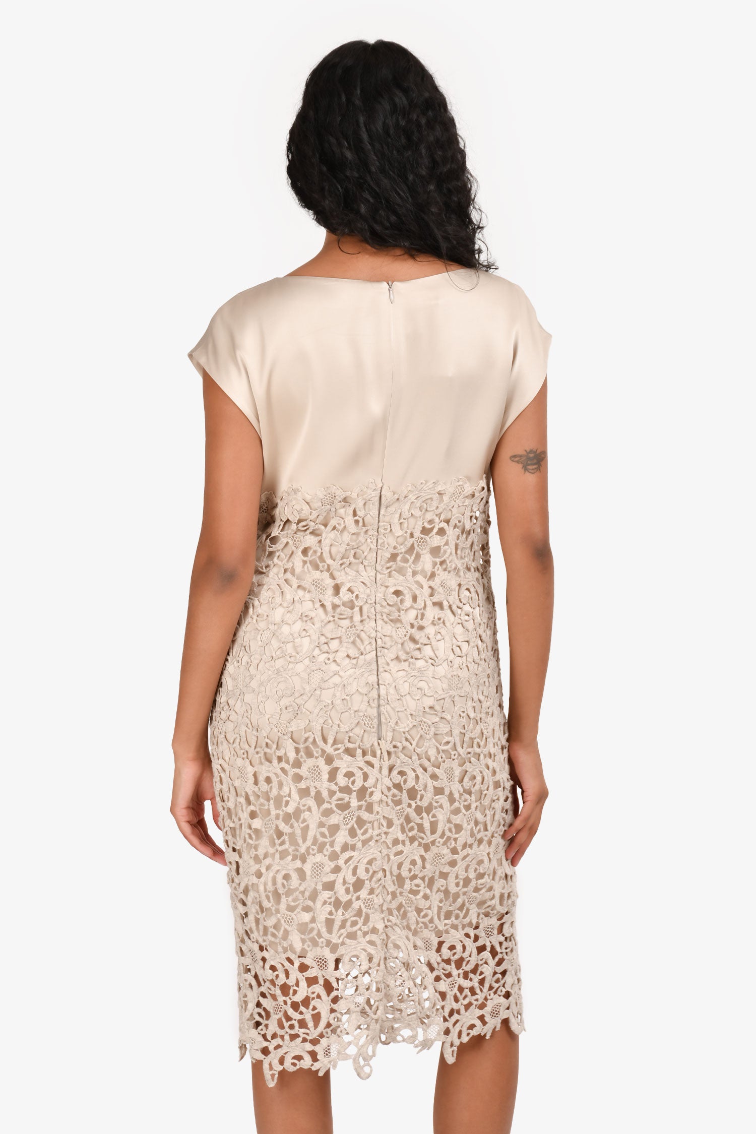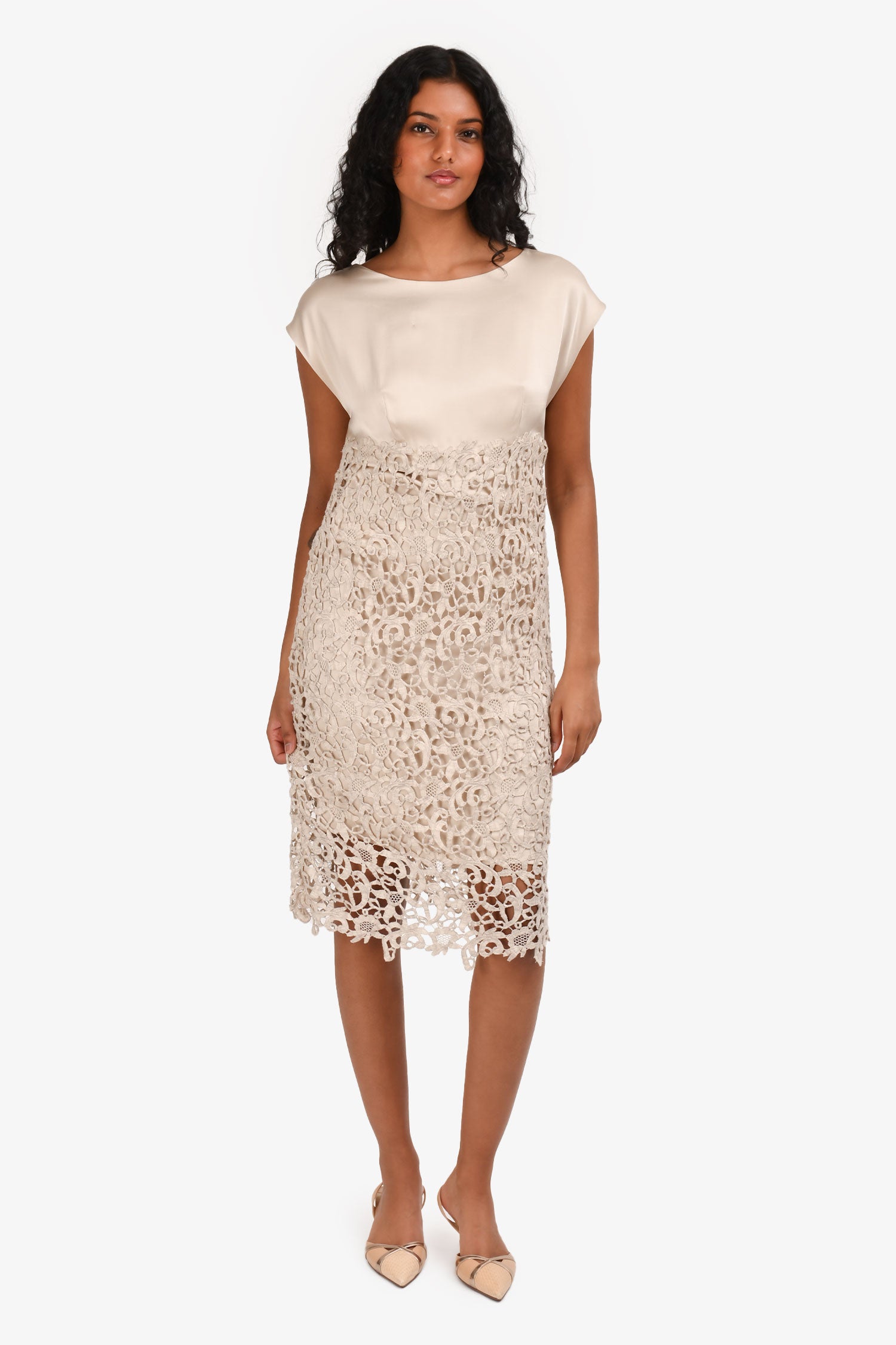 Refresh availabilityEscada Beige Fabric/ Lace Mid Length Dress. Sleeveless design. Scoop neckline. Lace overlay at bodice and hem. Back zip closure. Tonal stitching. Fully lined.