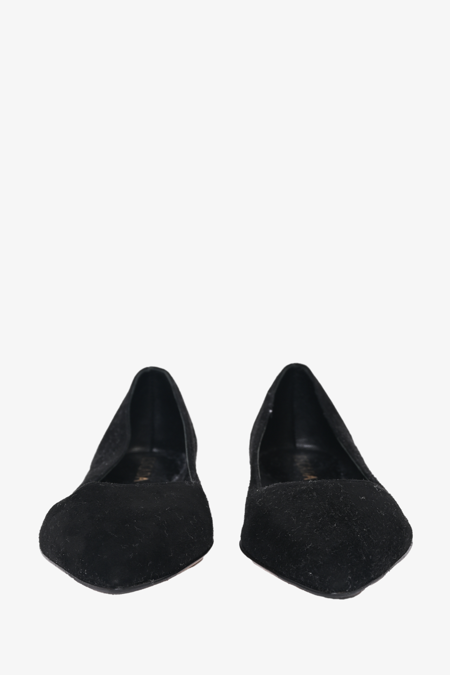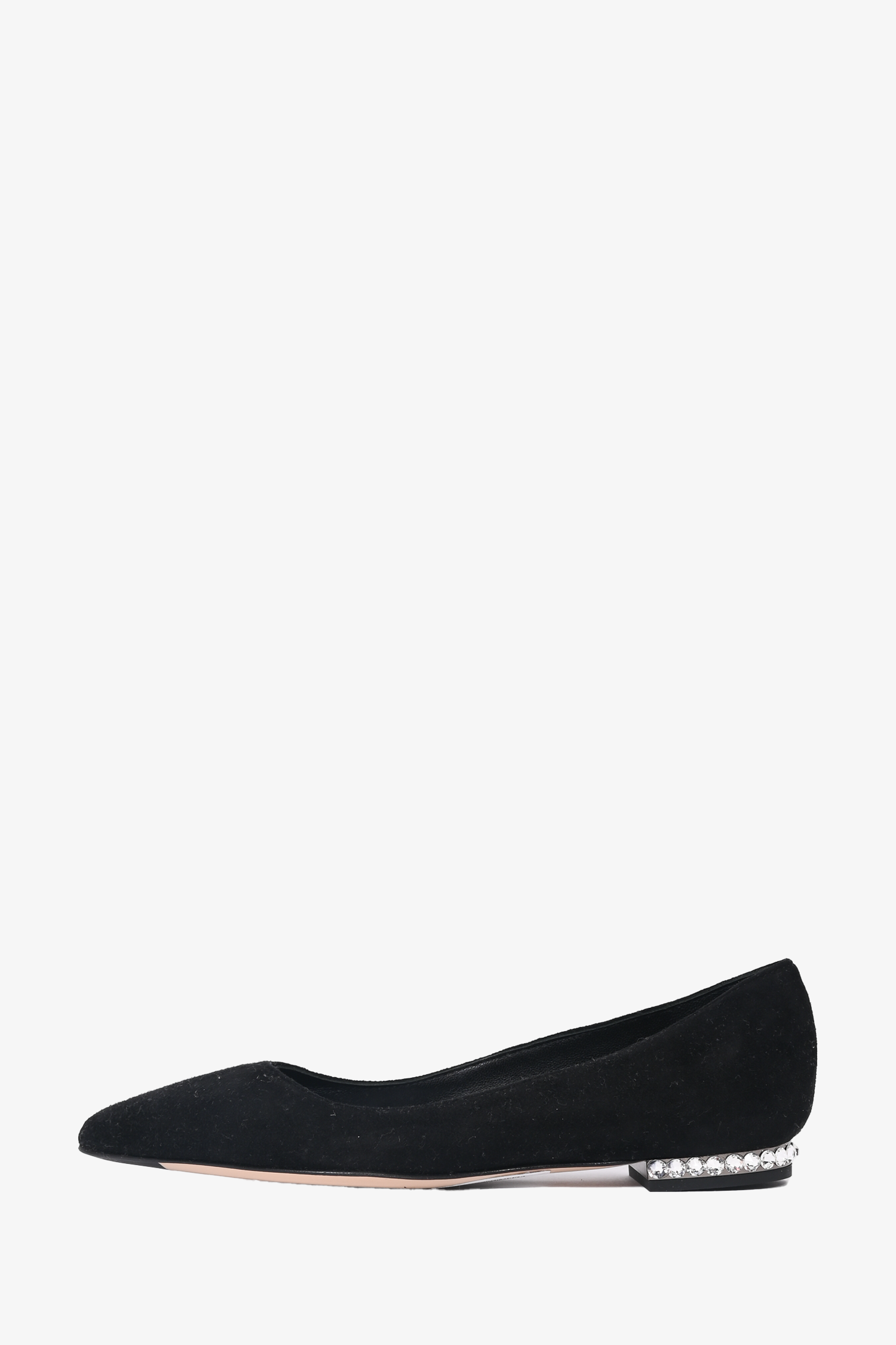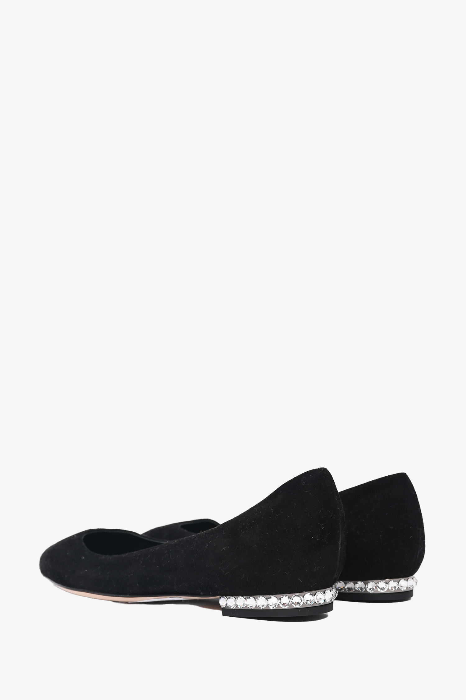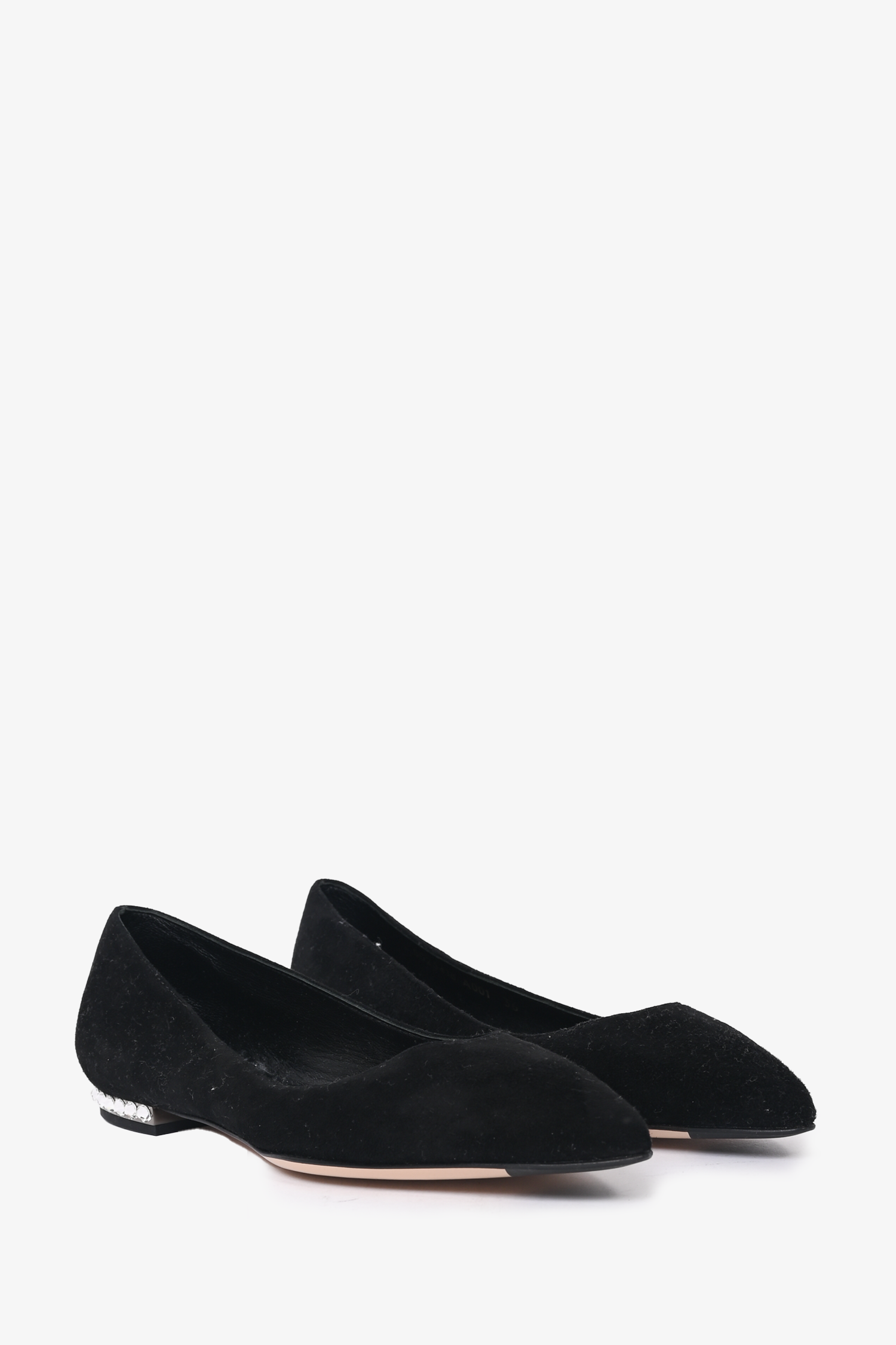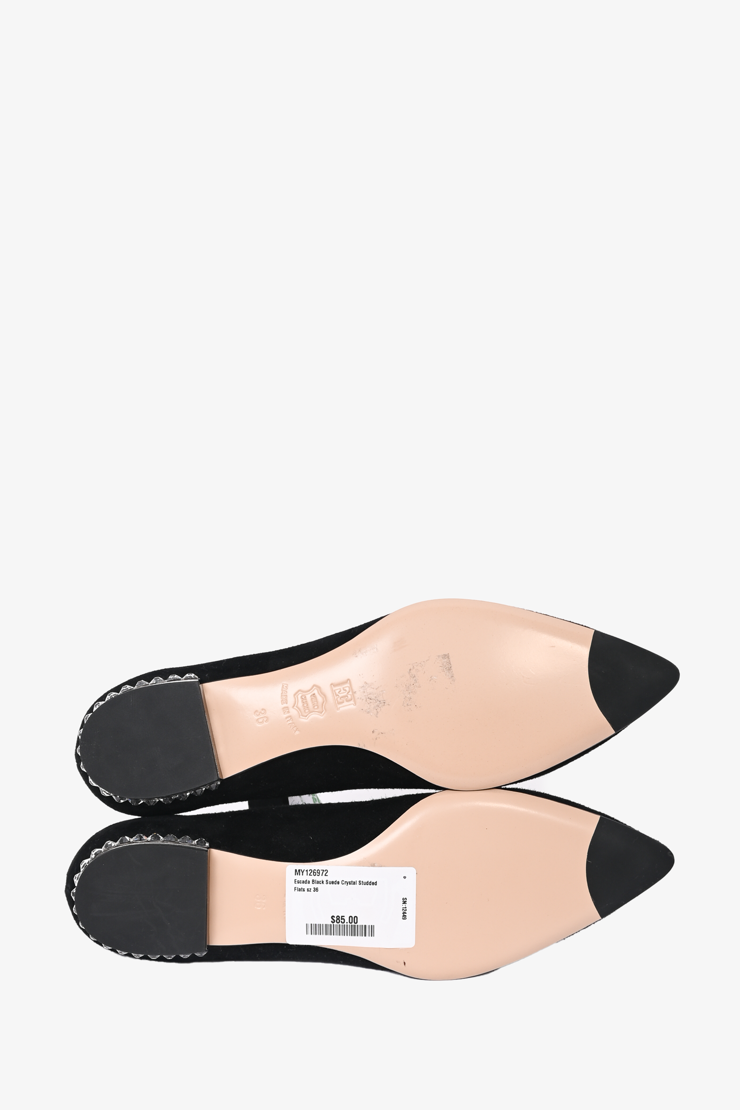 Refresh availabilityEscada Black Suede Crystal Studded Flats. Slip-on. Pointed toe. Tonal stitching.