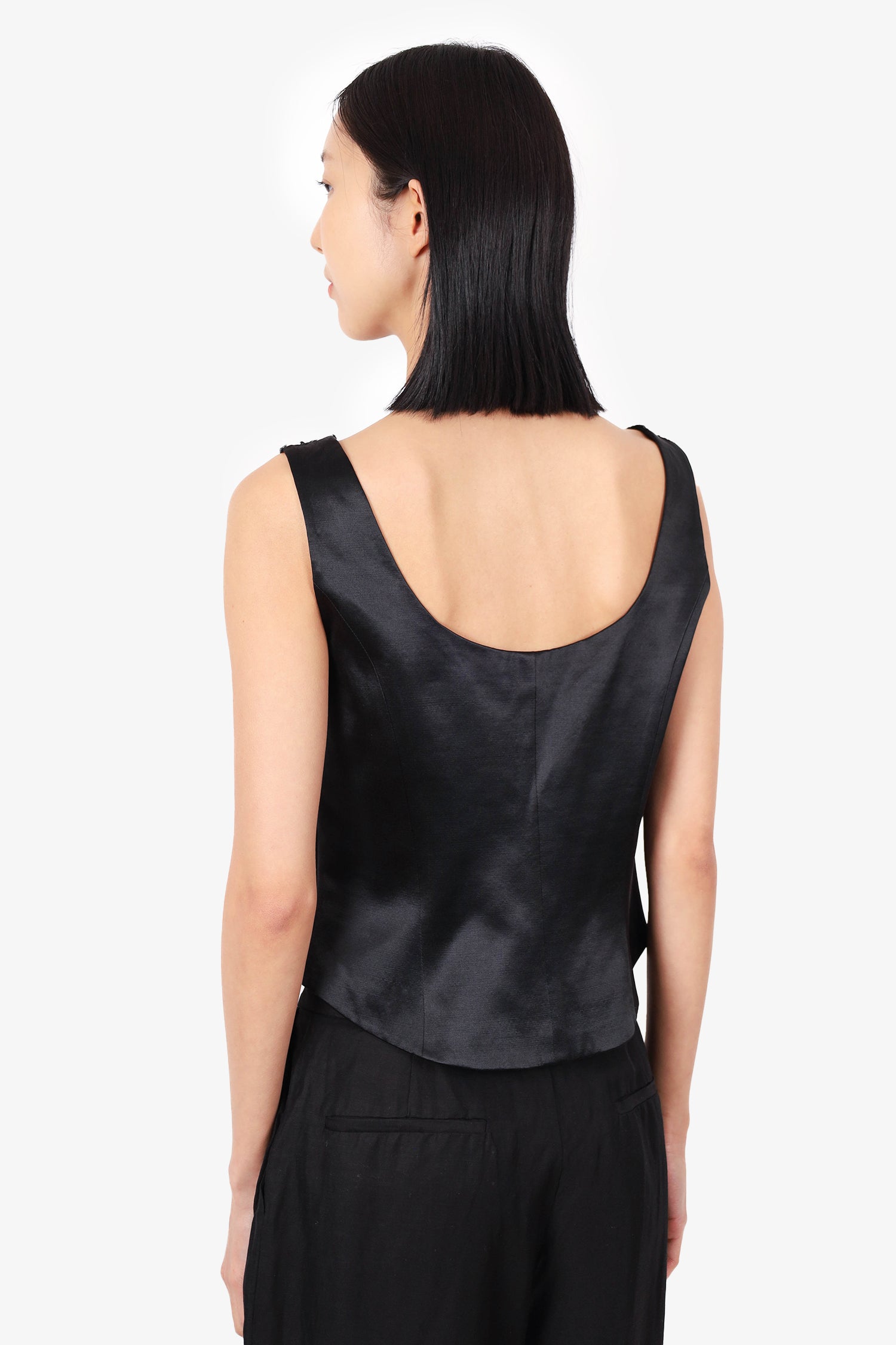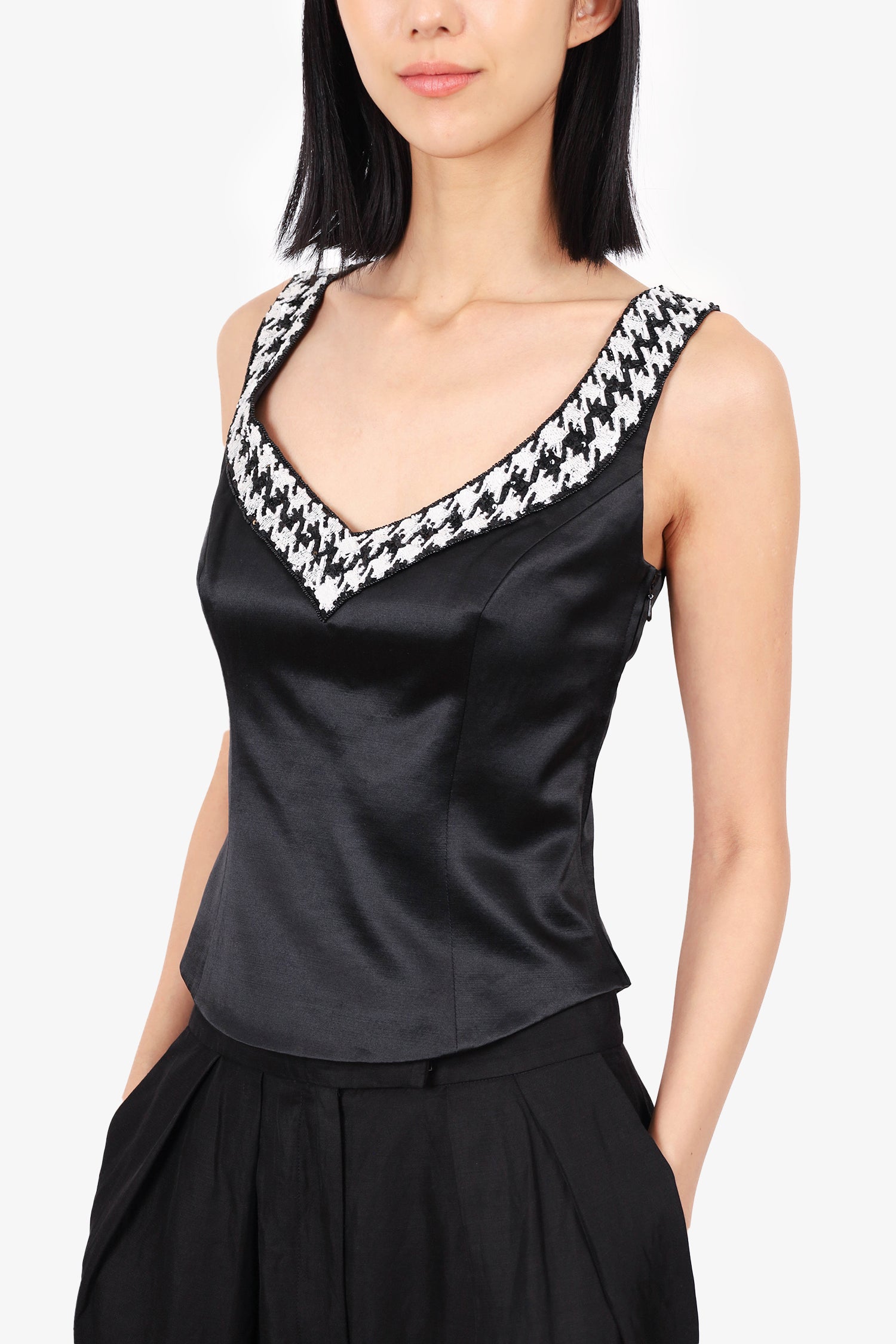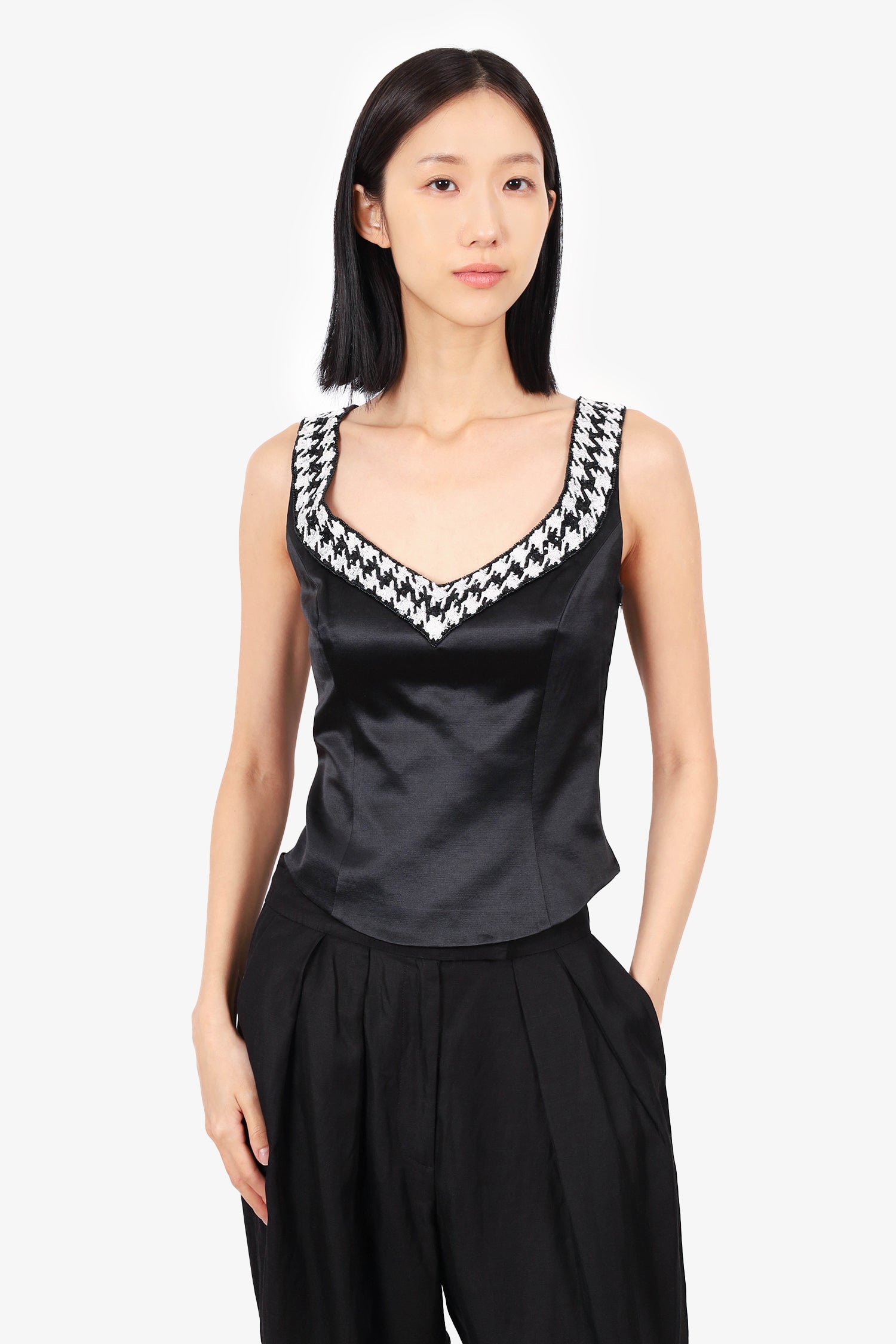 Refresh availabilityEscada Black Wool/Silk Sequin Houndstooth Tank Top. V-neckline. Side zip closure. Round bottom hem. Lined. Tonal stitching.